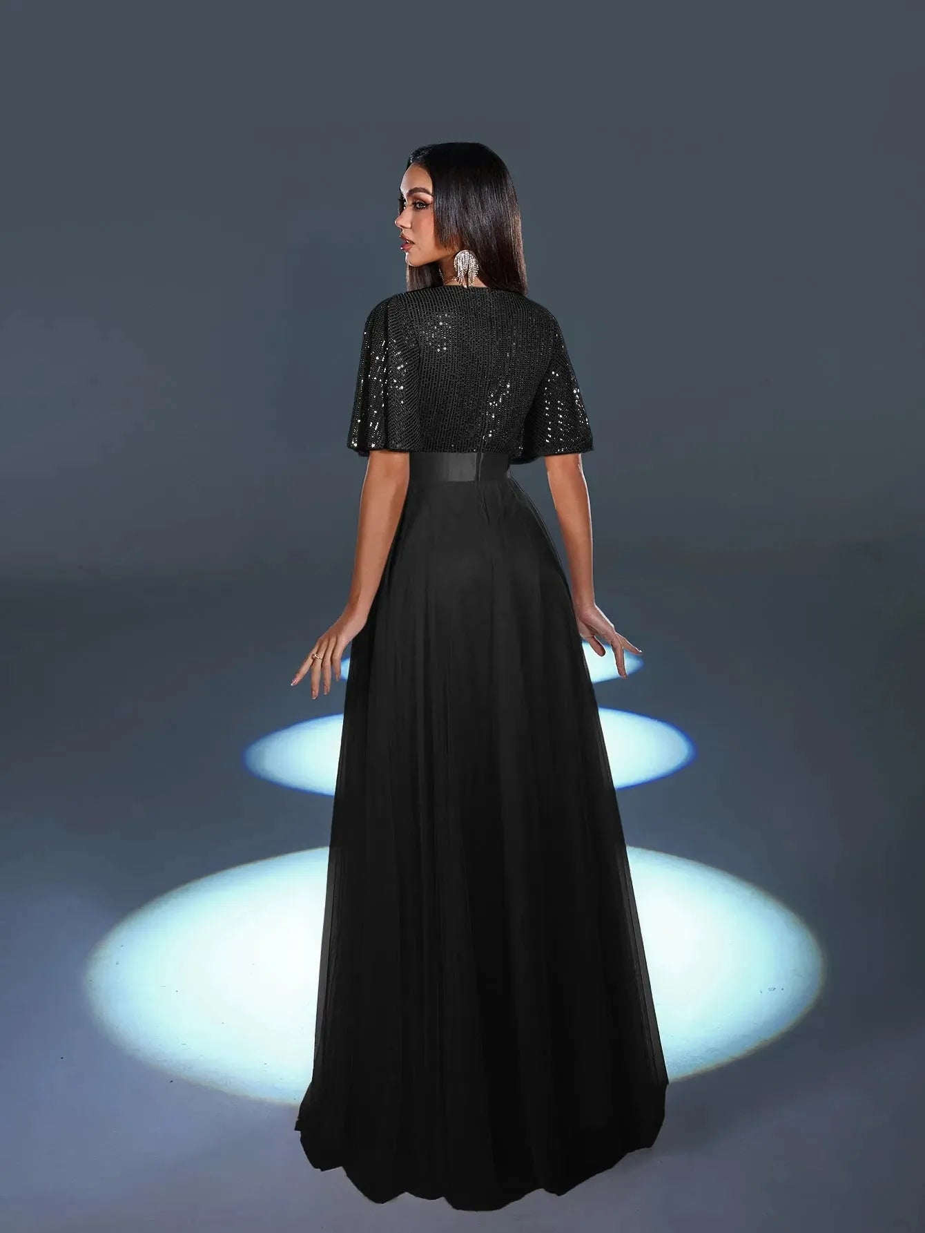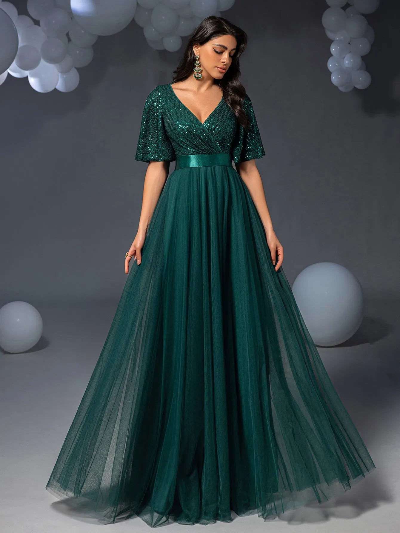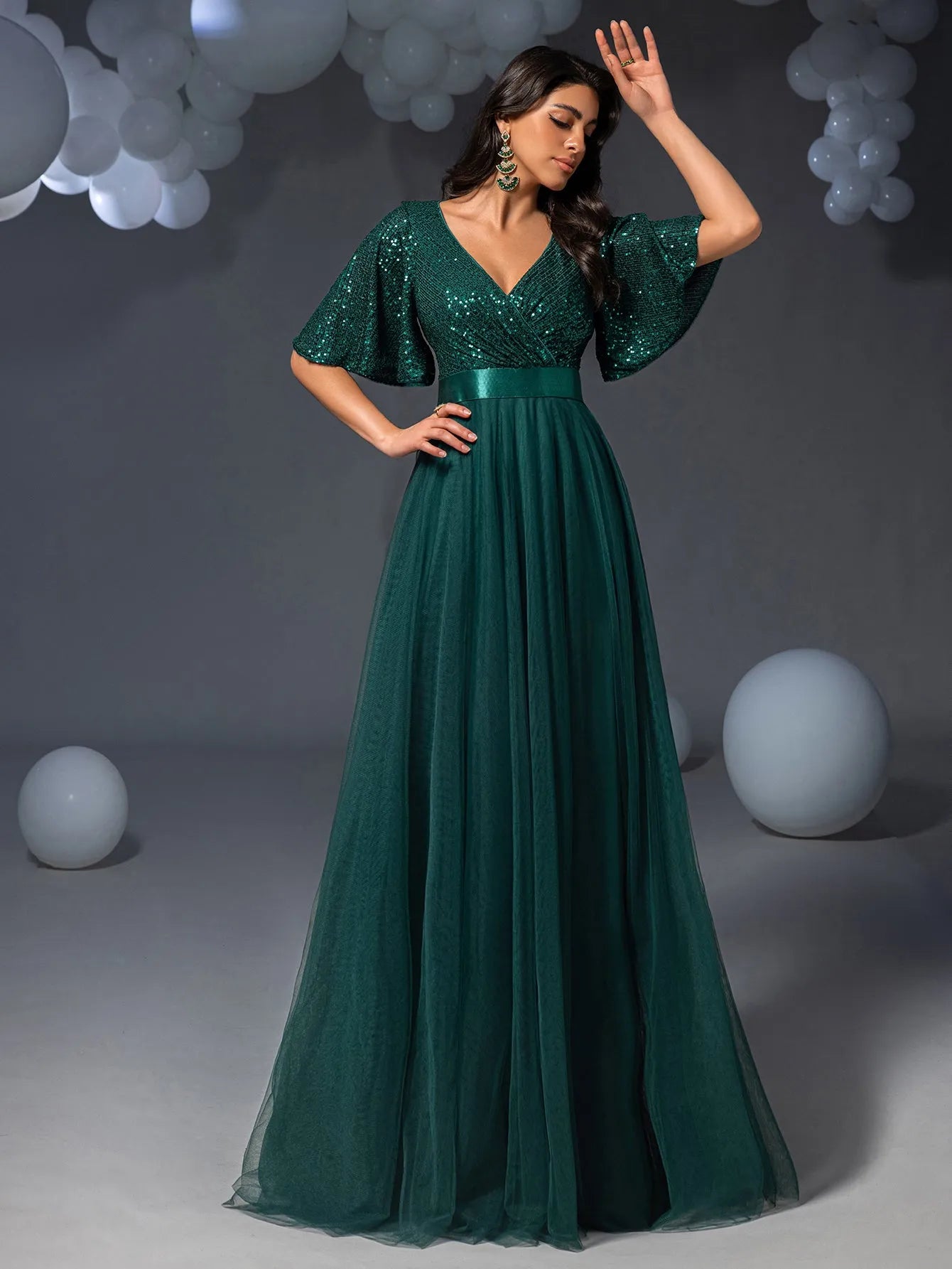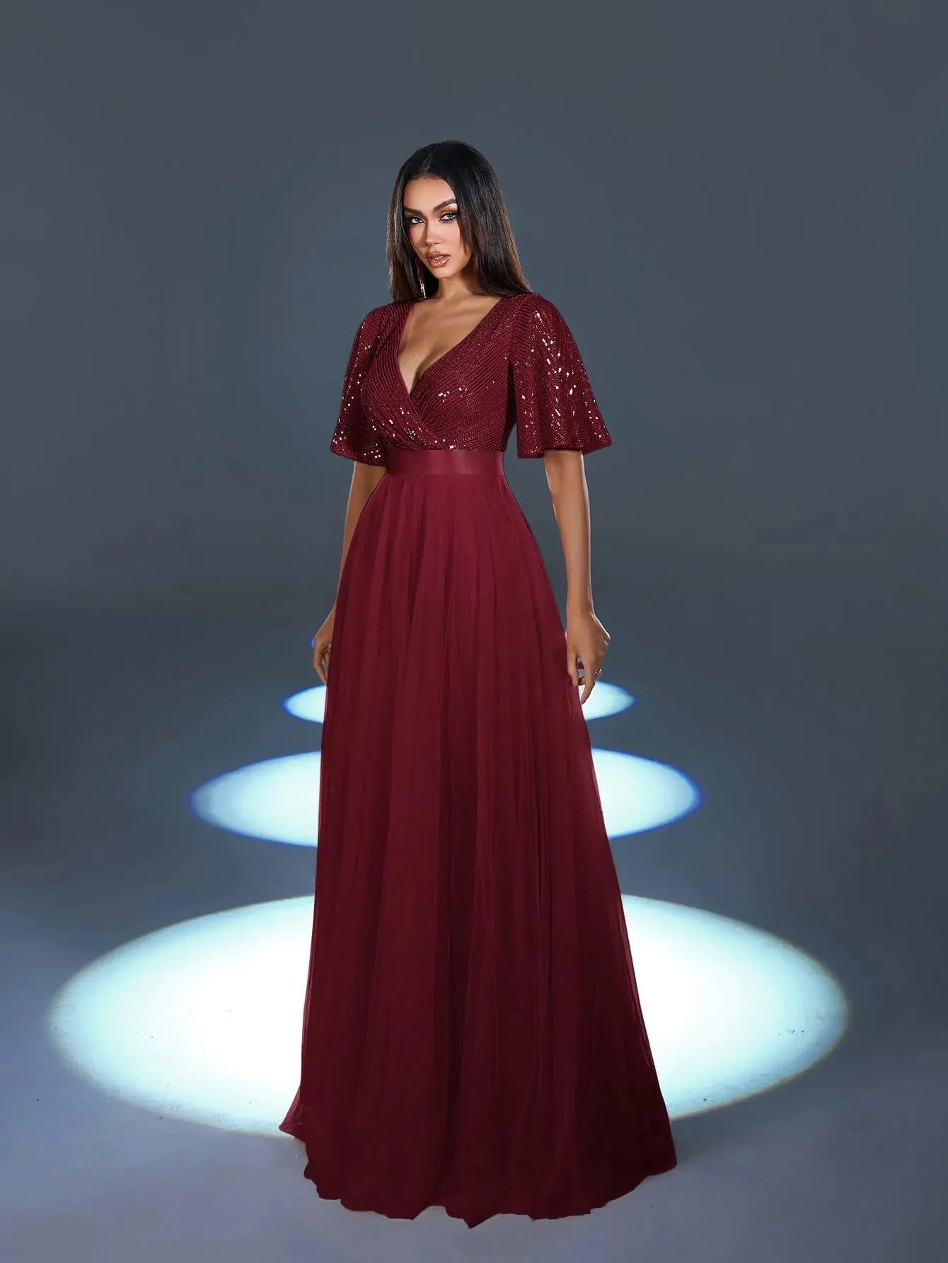 Dazzle in our luxurious evening gown, designed to make a statement. The bodice is adorned with shimmering sequins, creating a glamorous look that captures the light beautifully. The dress features elegant flutter sleeves and a deep V-neckline, adding a touch of allure. The flowing tulle skirt ensures a graceful and ethereal appearance, perfect for any formal event.