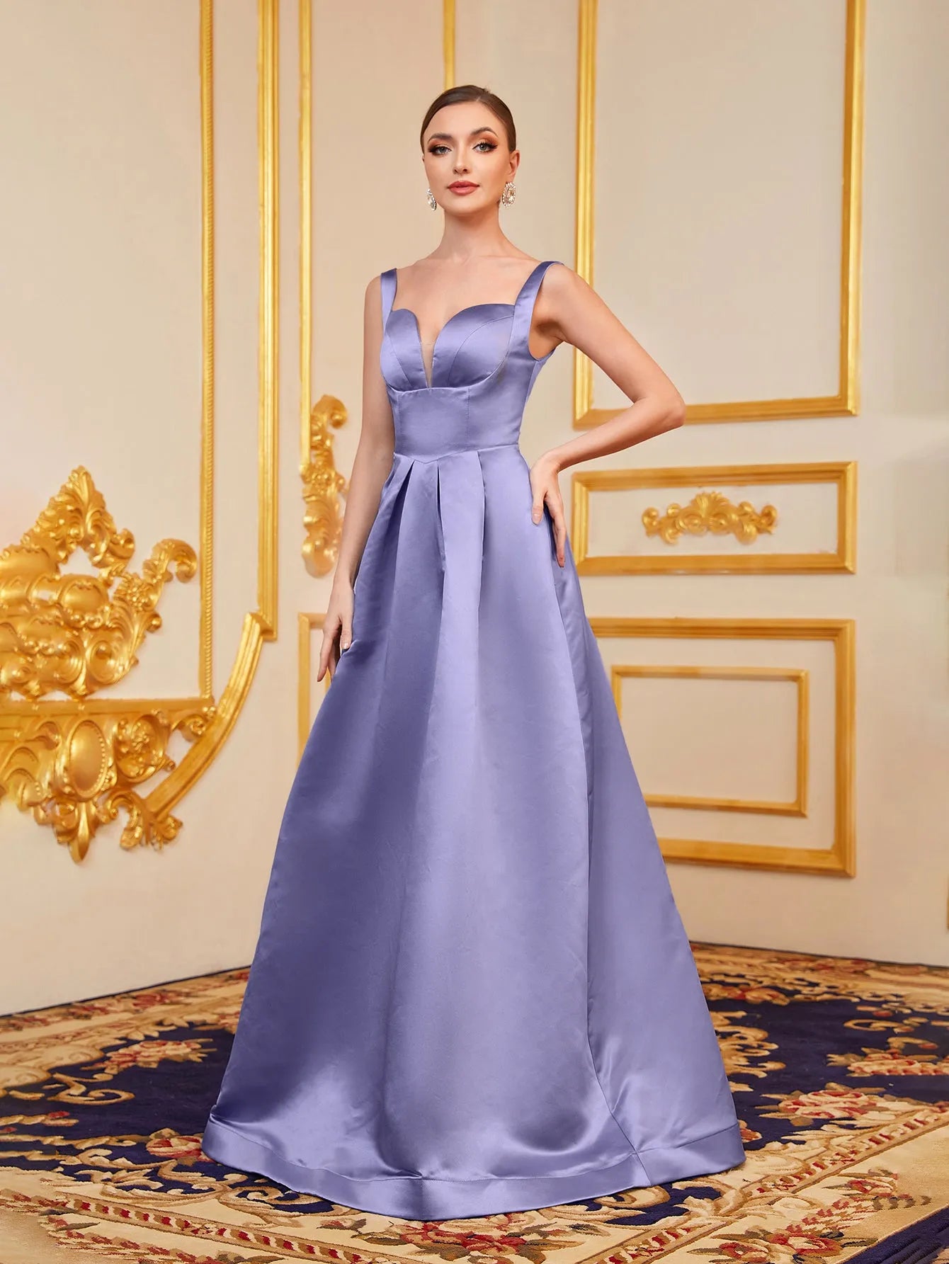 Step into elegance with our stunning satin evening gown, crafted to make a statement at any formal occasion. This gown boasts a structured sweetheart neckline with delicate, wide straps that gracefully highlight the shoulders. The bodice transitions into a pleated skirt, creating an A-line silhouette that offers both sophistication and freedom of movement. The luxurious satin fabric shimmers subtly under the light, adding a touch of opulence to your ensemble.