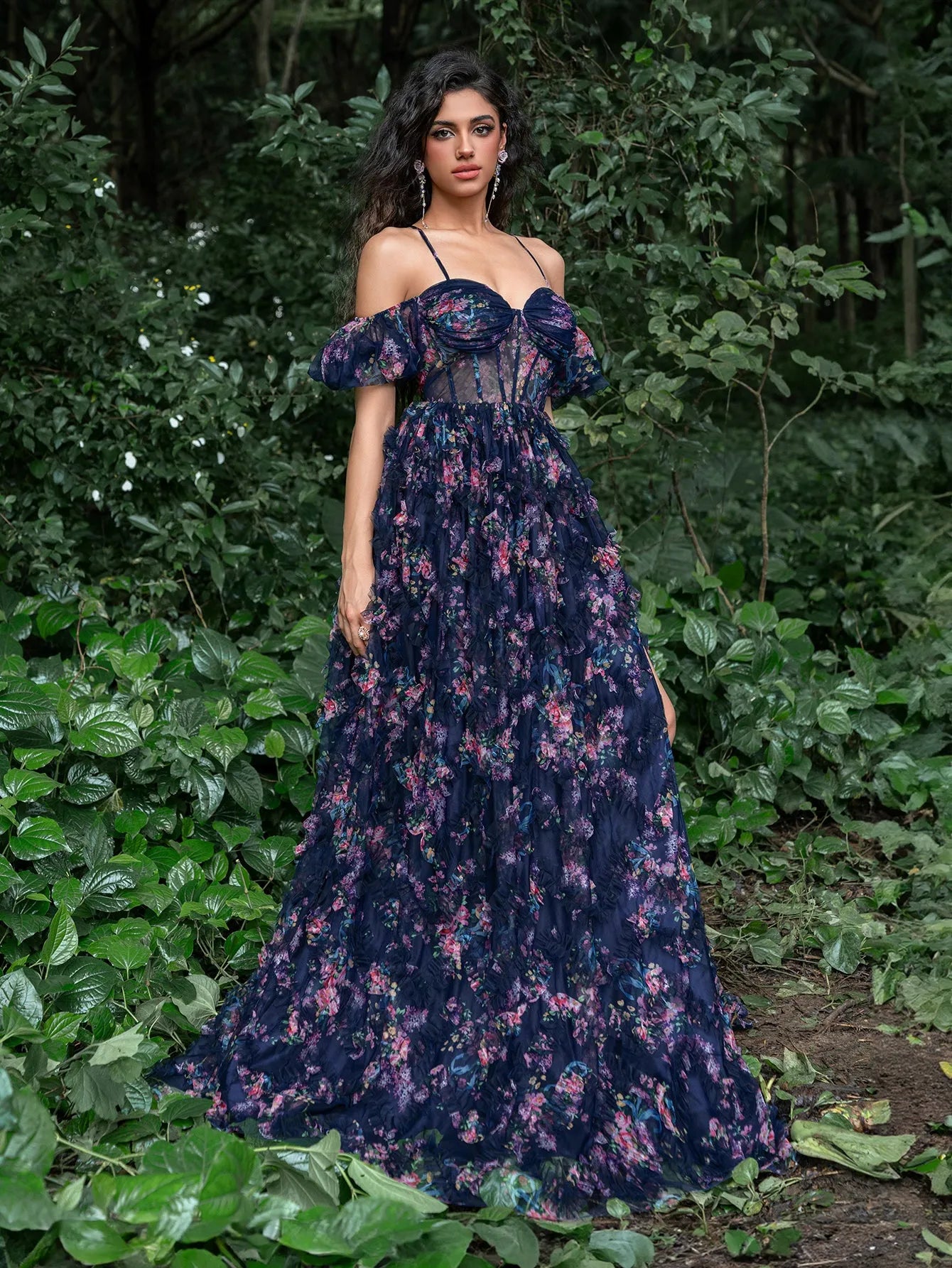 Turn every head at your next event with this captivating floral gown. This gown features a romantic off-the-shoulder design with delicate puff sleeves, ensuring you shine all night long. The fitted bodice, complemented by a lace-up back and intricate floral printed, accentuates your curves, while the flowing A-line skirt adds volume and movement, creating a stunning silhouette. The thigh-high slit adds a touch of allure and sophistication. Perfect for formal events, evening galas, and special occasions, this gown guarantees you make a lasting impression.