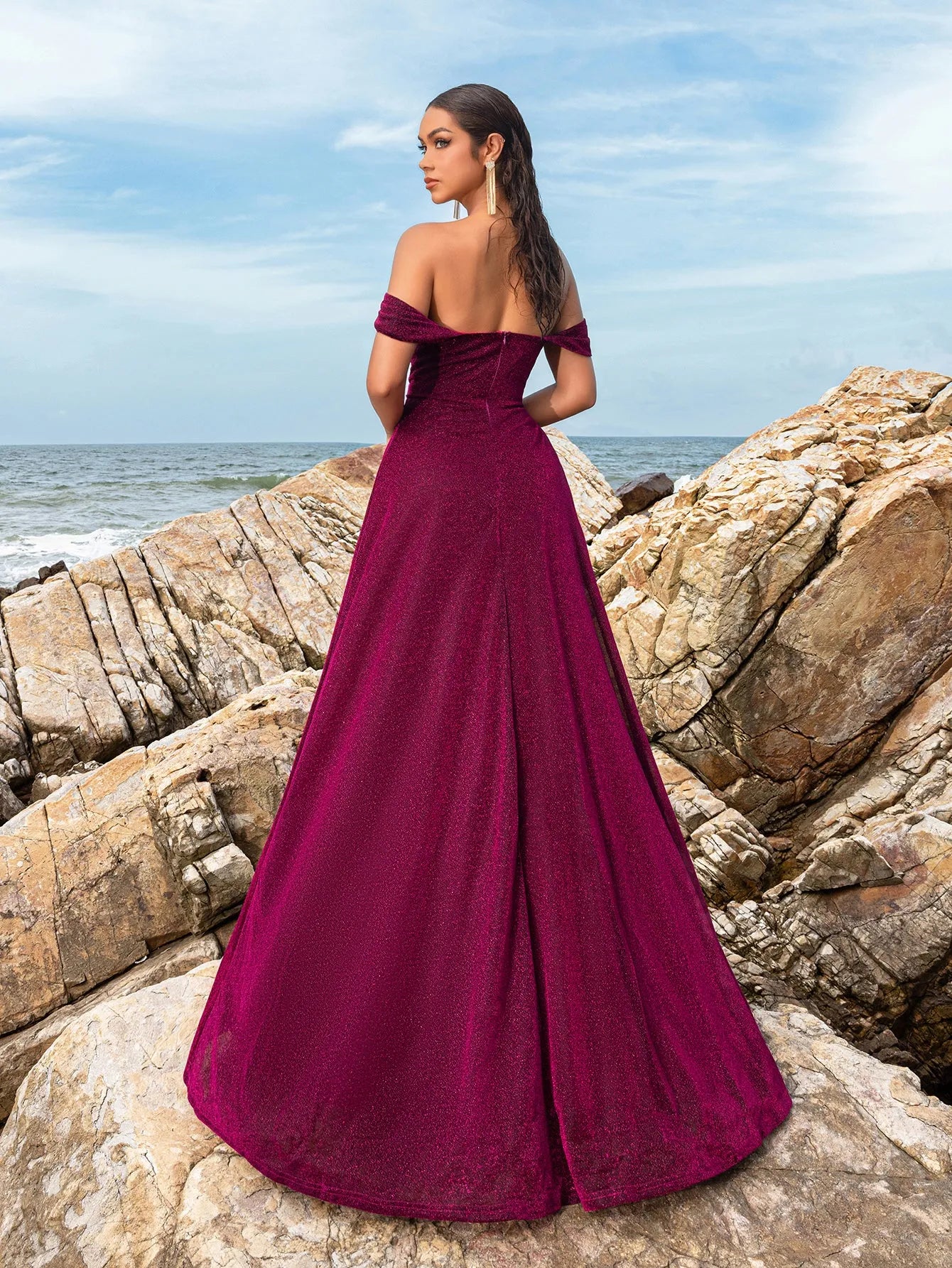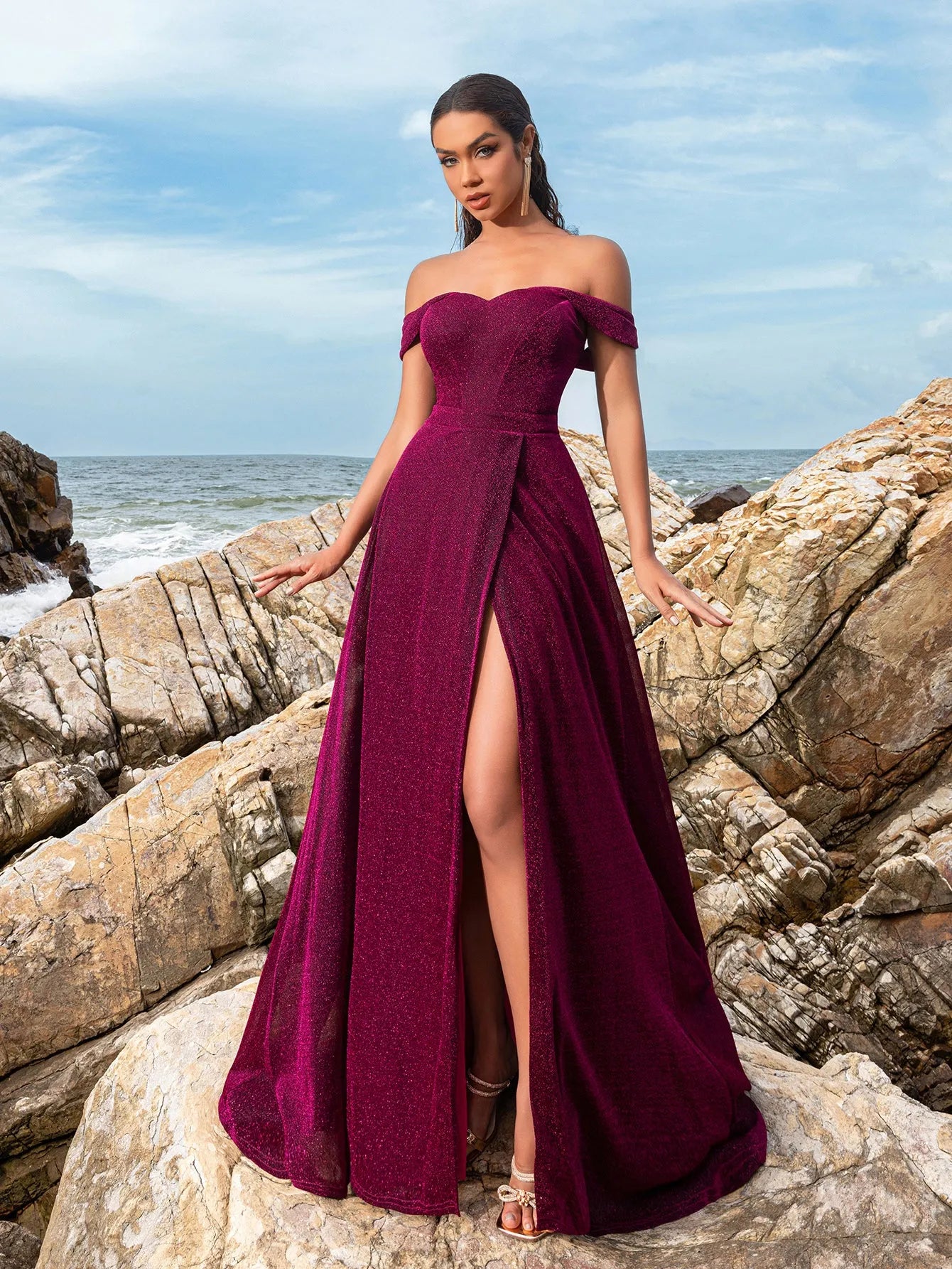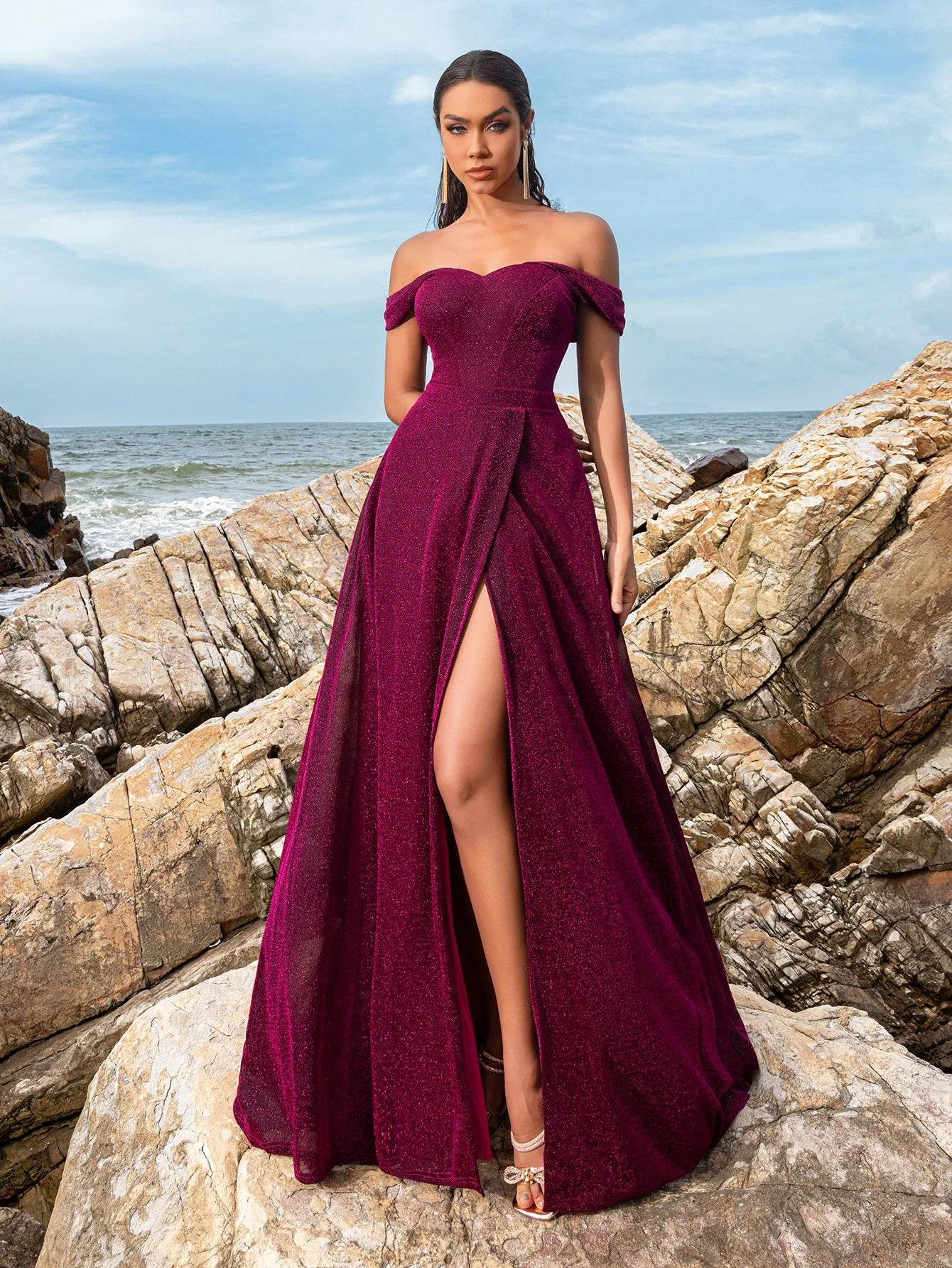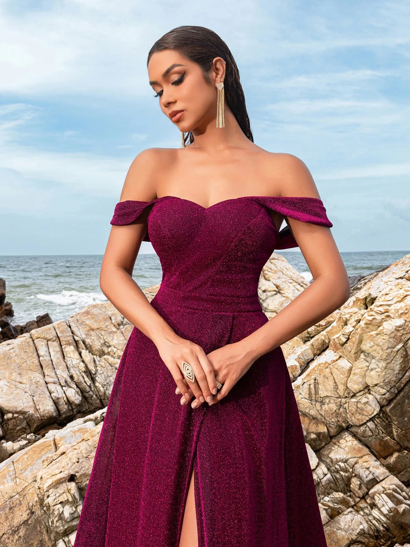 Capture the essence of timeless beauty with this enchanting off-the-shoulder gown, perfect for making a grand entrance at any special occasion. The gown crafted from a shimmering fabric that catches the light with every movement. The off-the-shoulder neckline elegantly frames your shoulders, while the fitted bodice accentuates your curves. The floor-length skirt flows effortlessly, with a dramatic front slit that adds a touch of allure and sophistication. The luxurious fabric and rich hue make this gown an unforgettable choice for any event.