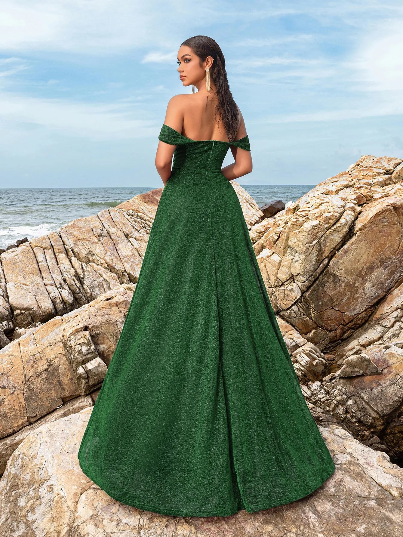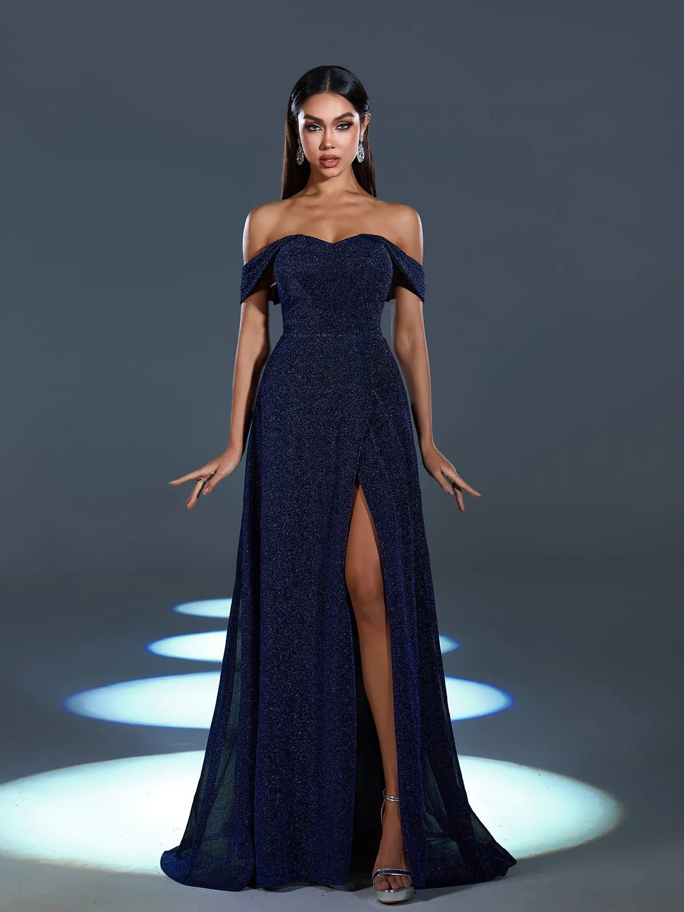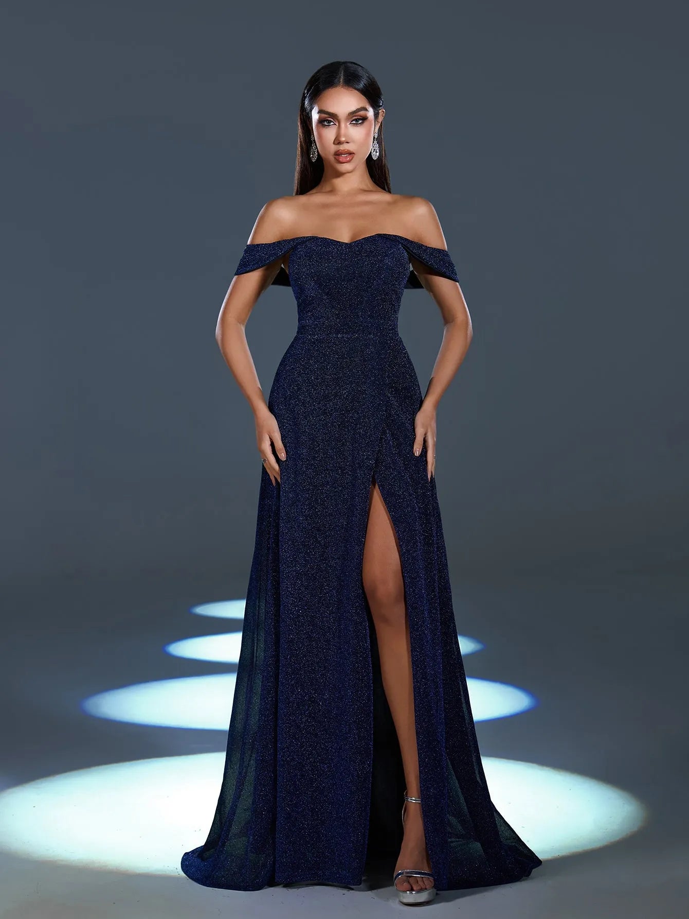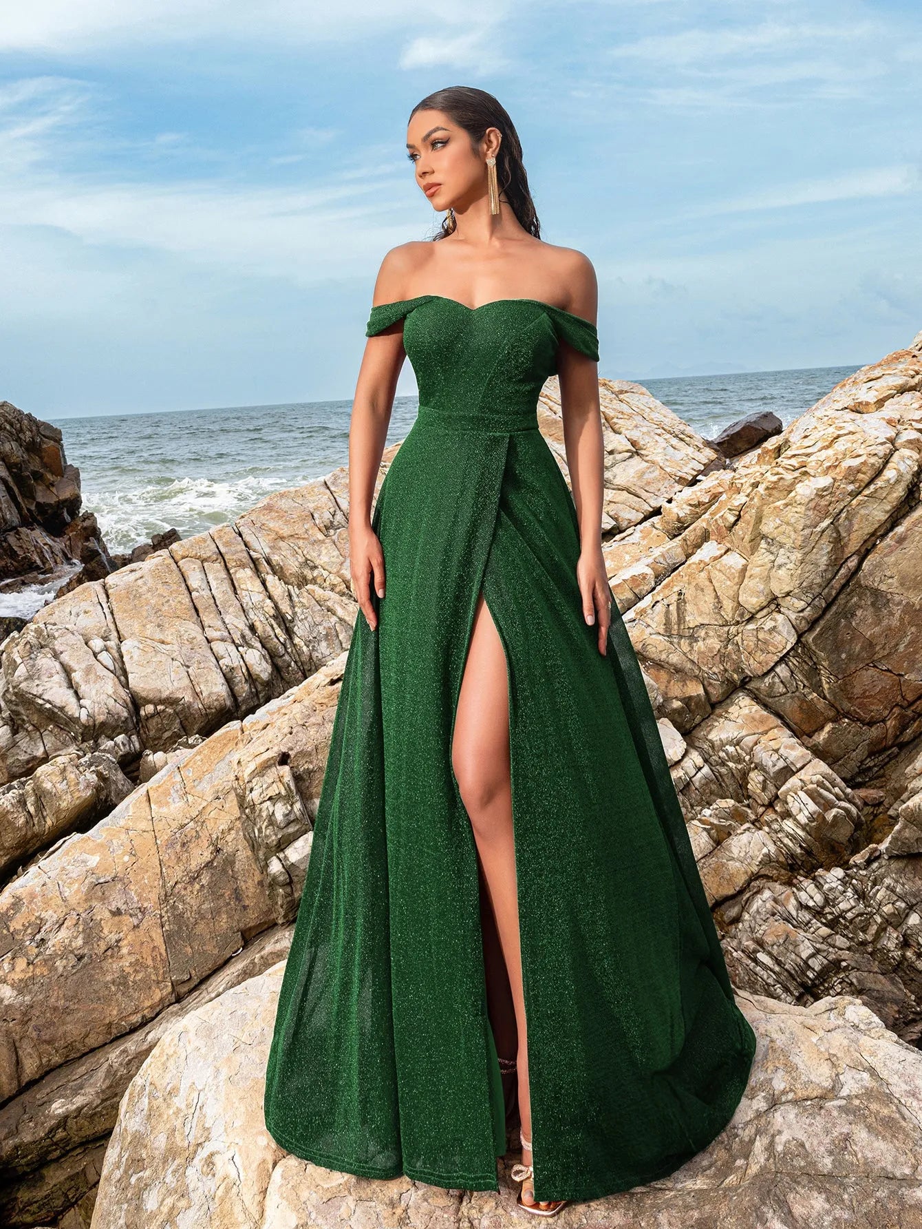 Capture the essence of timeless beauty with this enchanting off-the-shoulder gown, perfect for making a grand entrance at any special occasion. The gown crafted from a shimmering fabric that catches the light with every movement. The off-the-shoulder neckline elegantly frames your shoulders, while the fitted bodice accentuates your curves. The floor-length skirt flows effortlessly, with a dramatic front slit that adds a touch of allure and sophistication. The luxurious fabric and rich hue make this gown an unforgettable choice for any event.