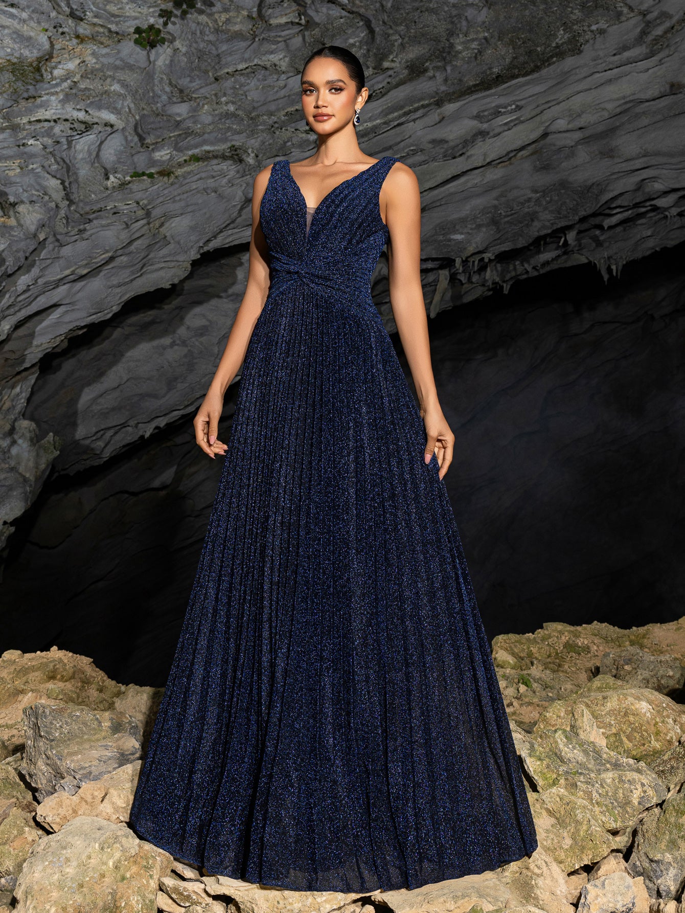 Step into a world of elegance with our enchanted evening gown, designed to captivate and charm at any formal gathering. The gown boasts a luxurious pleated fabric that flows effortlessly to the floor, ensuring a grand entrance. Featuring a plunging V-neckline that leads to an alluring low-cut back, this dress masterfully balances sophistication with a hint of seduction. The waist is accentuated by a tastefully gathered detail, highlighting a silhouette that celebrates the essence of femininity. Ideal for high-profile events, weddings, or any occasion where glamour is a must, this gown is the embodiment of grace and timeless style.