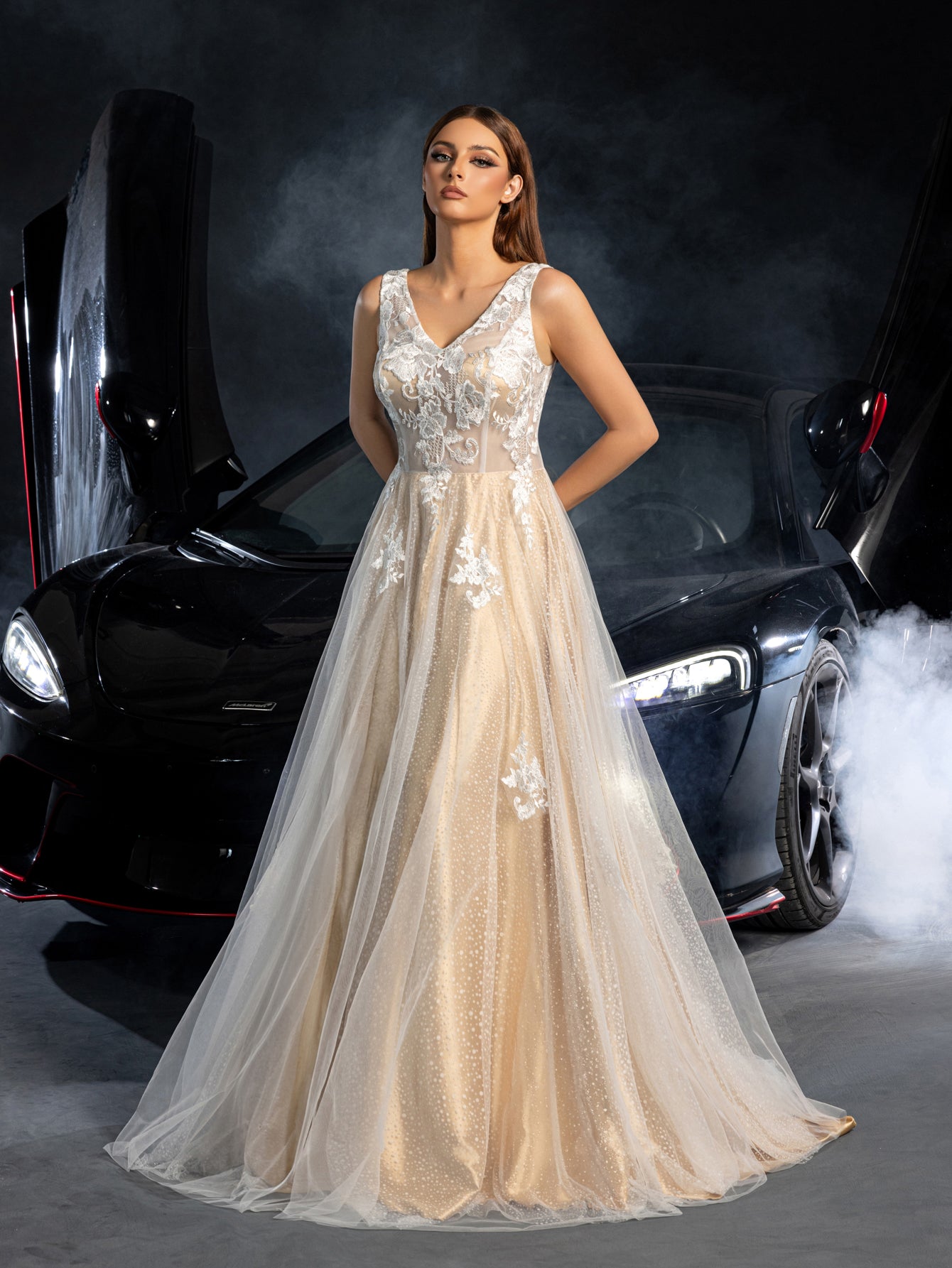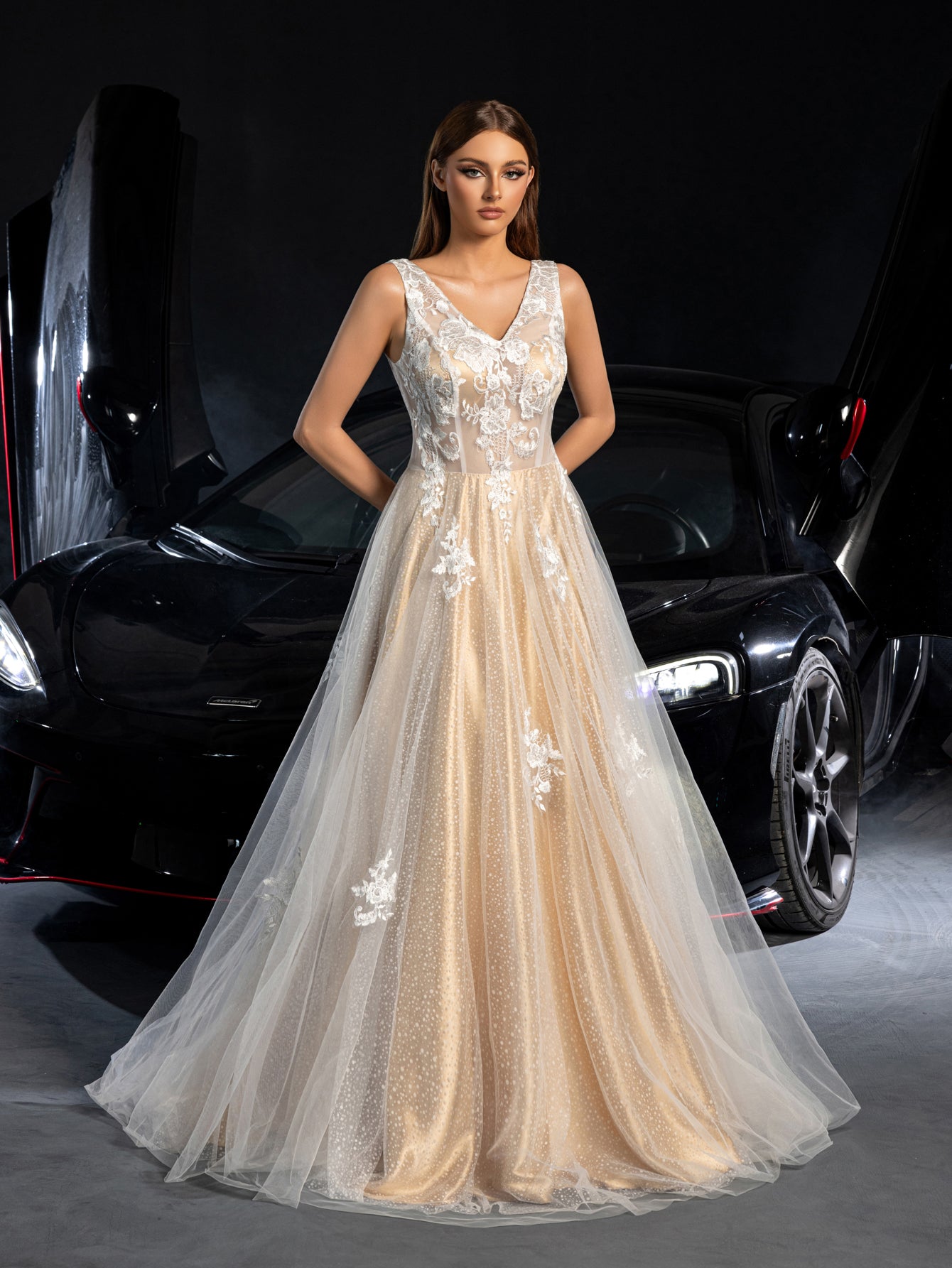 Elegant and sophisticated, this bridal gown is a masterpiece of design and craftsmanship. The gown features a V-neckline that accentuates the décolletage, while the sleeveless design offers a classic and timeless look. The bodice is adorned with intricate lace appliqués, adding a touch of luxury and detail to the overall design. The full-length tulle skirt flows gracefully, creating a dramatic and ethereal silhouette that is perfect for a grand entrance.