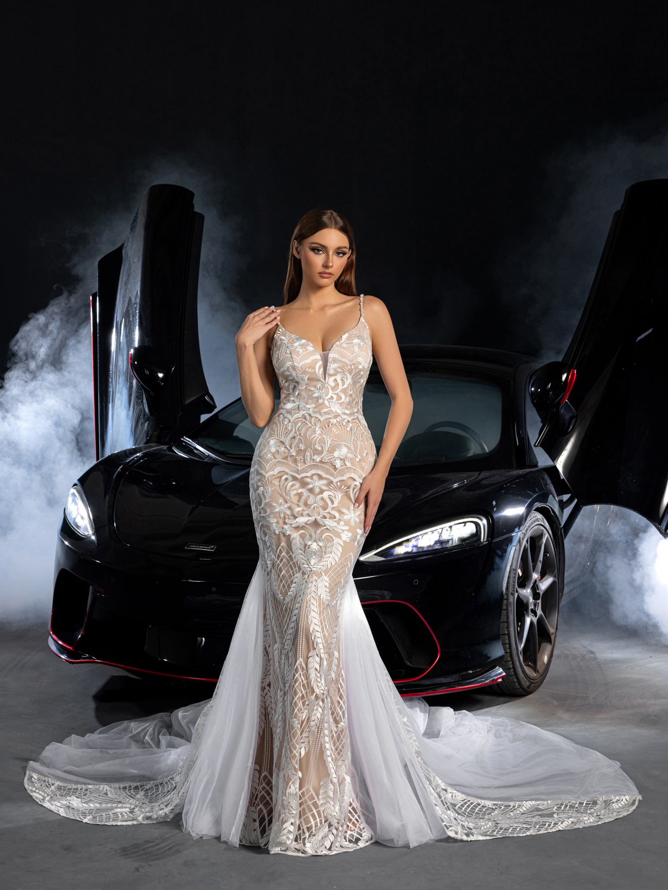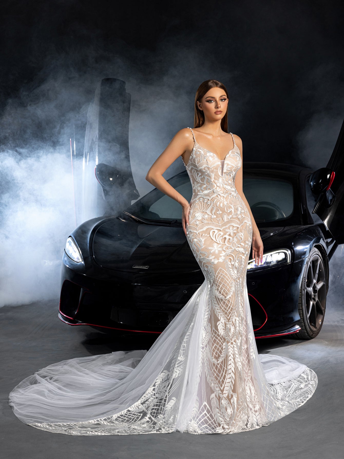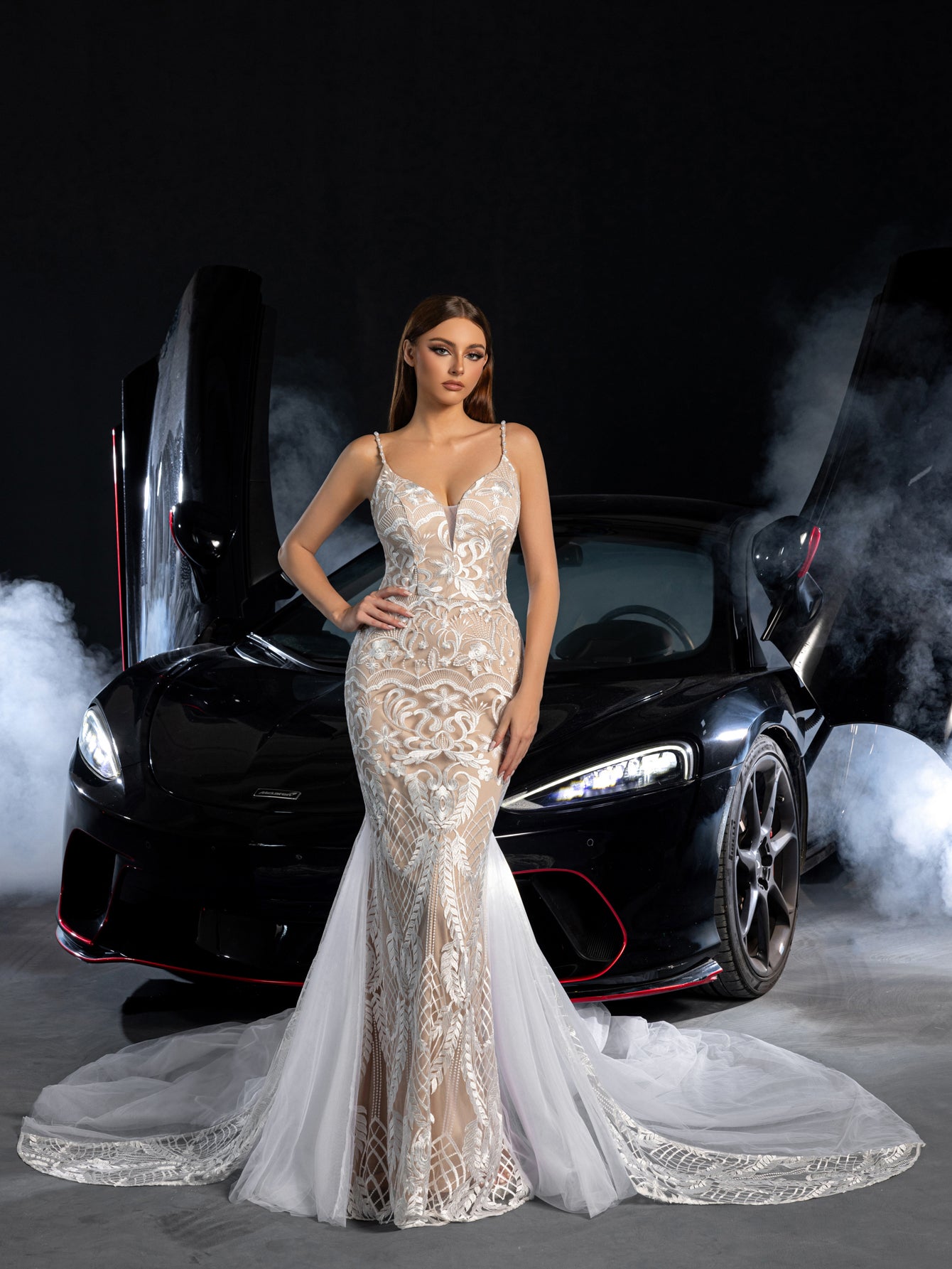 Elevate your special day with our exquisite wedding dress, crafted to embody the essence of bridal elegance. The gown features a plunging sweetheart neckline that accentuates your décolletage, paired with a fitted silhouette that gracefully follows your figure, ensuring a flattering and alluring look. The intricate lace fabric, adorned with delicate beadwork, adds a touch of luxury and sophistication, while the flowing tulle skirt cascades into a dramatic train, perfect for making a grand entrance.