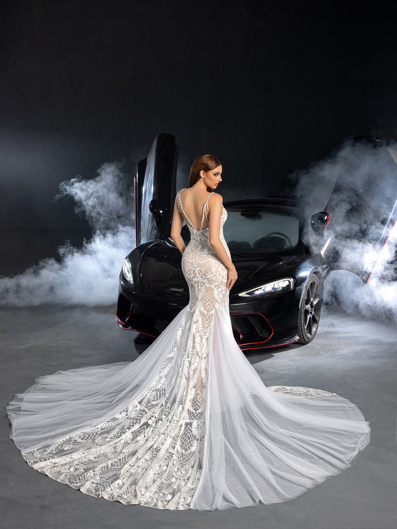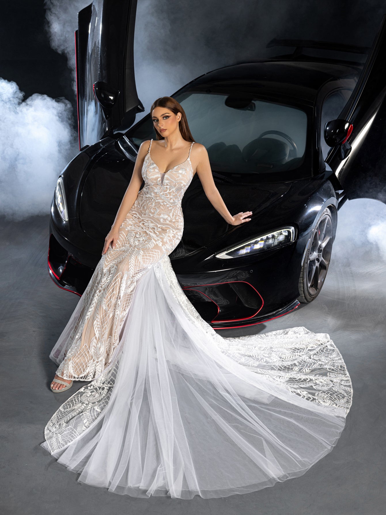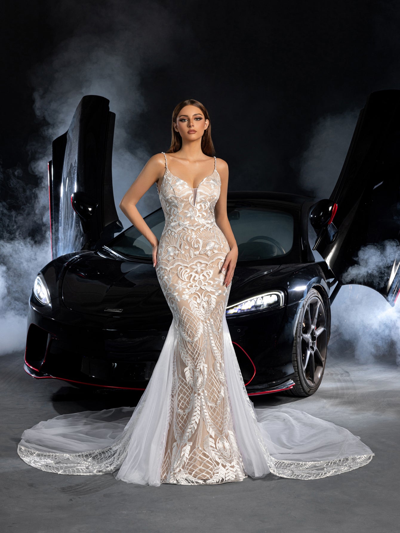 Elevate your special day with our exquisite wedding dress, crafted to embody the essence of bridal elegance. The gown features a plunging sweetheart neckline that accentuates your décolletage, paired with a fitted silhouette that gracefully follows your figure, ensuring a flattering and alluring look. The intricate lace fabric, adorned with delicate beadwork, adds a touch of luxury and sophistication, while the flowing tulle skirt cascades into a dramatic train, perfect for making a grand entrance.