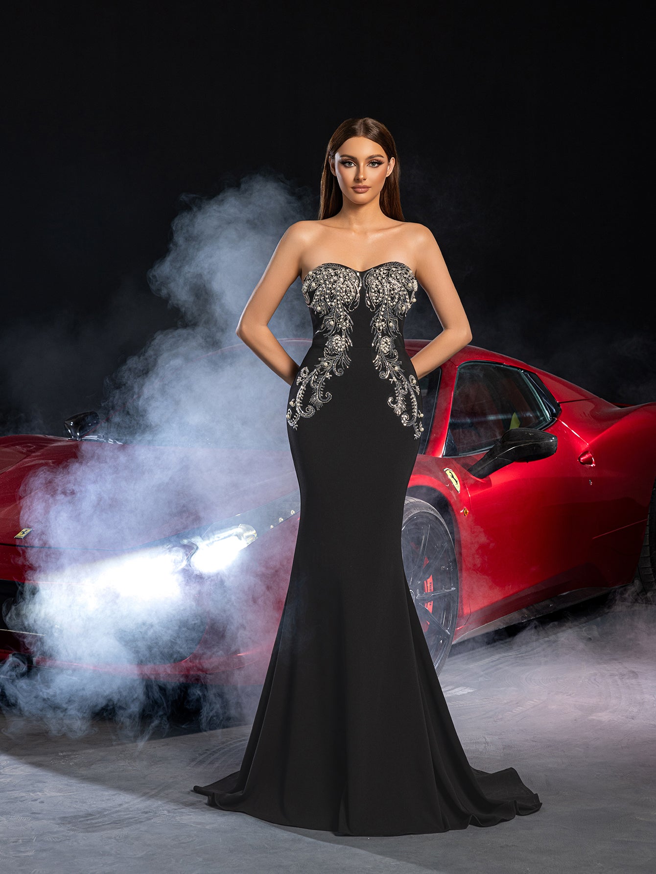 Elevate your evening look with our stunning evening gown, perfect for making a statement at any formal event. The gown features a strapless sweetheart neckline and a fitted silhouette that accentuates your curves, leading to a dramatic floor-length hem. The luxurious fabric, is adorned with intricate embellishments on the bodice, adding a touch of glamour and sophistication.