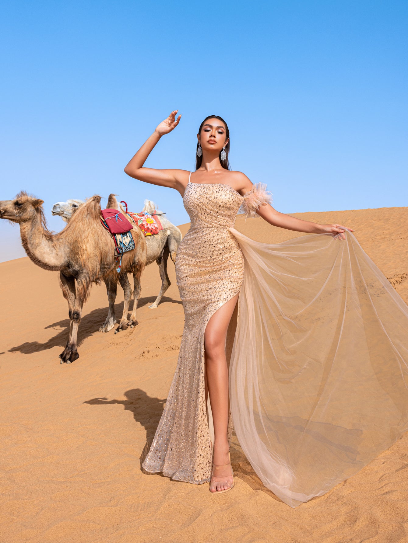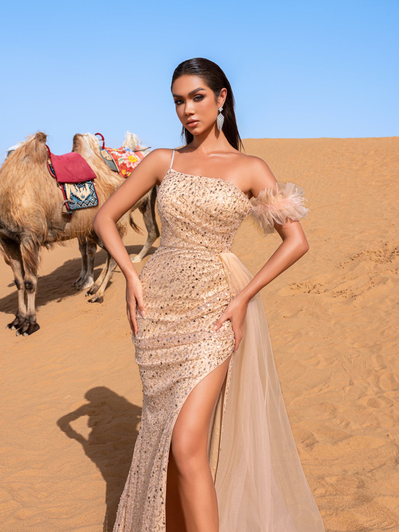 ✨ Dazzling Craftsmanship: This beaded sequin gown captivates with thousands of sequins and beads arranged in cascading patterns, creating a shimmering effect like liquid gold. The mermaid silhouette hugs curves elegantly, while the high-leg slit adds a daring yet sophisticated touch, perfect for commanding attention at exclusive events.