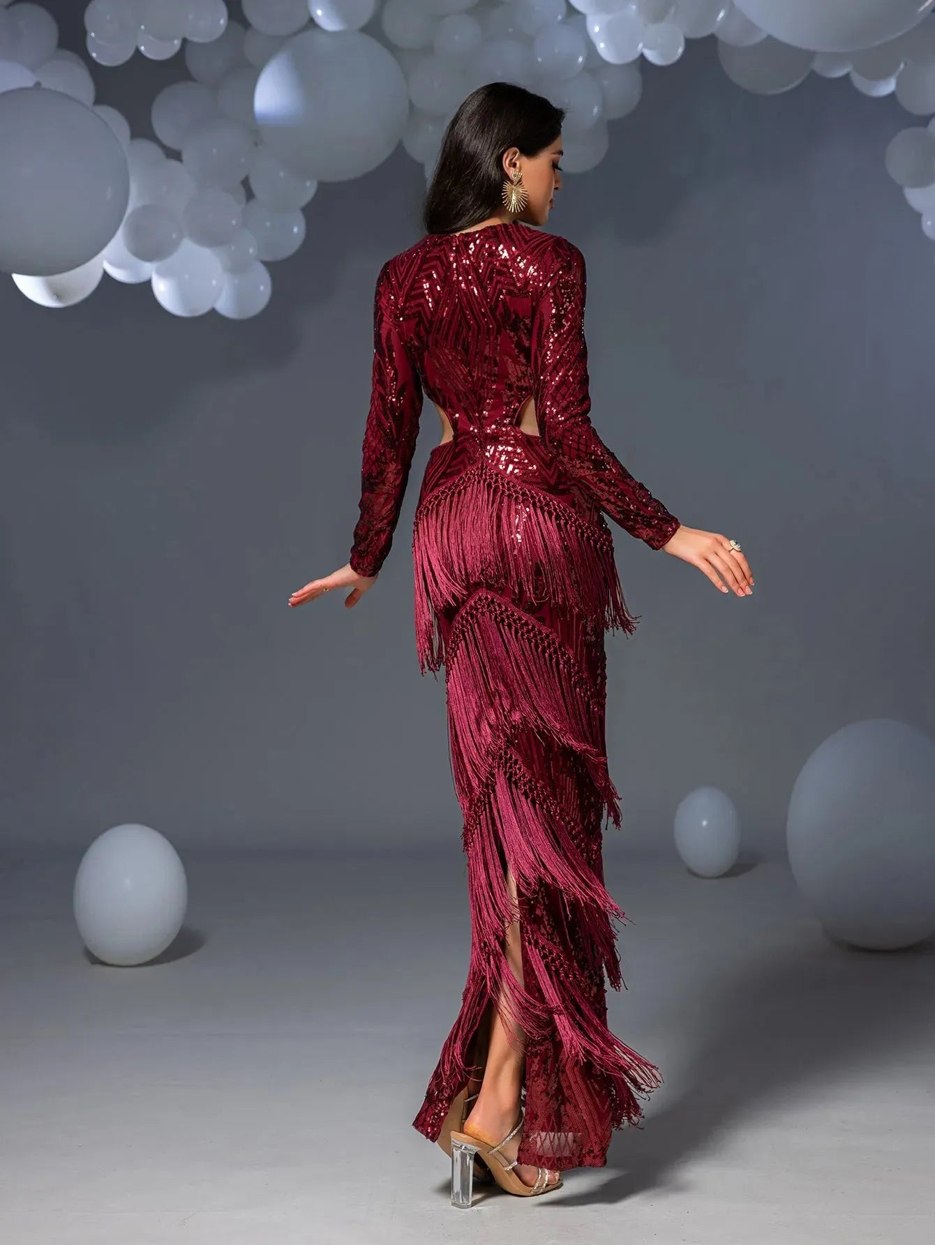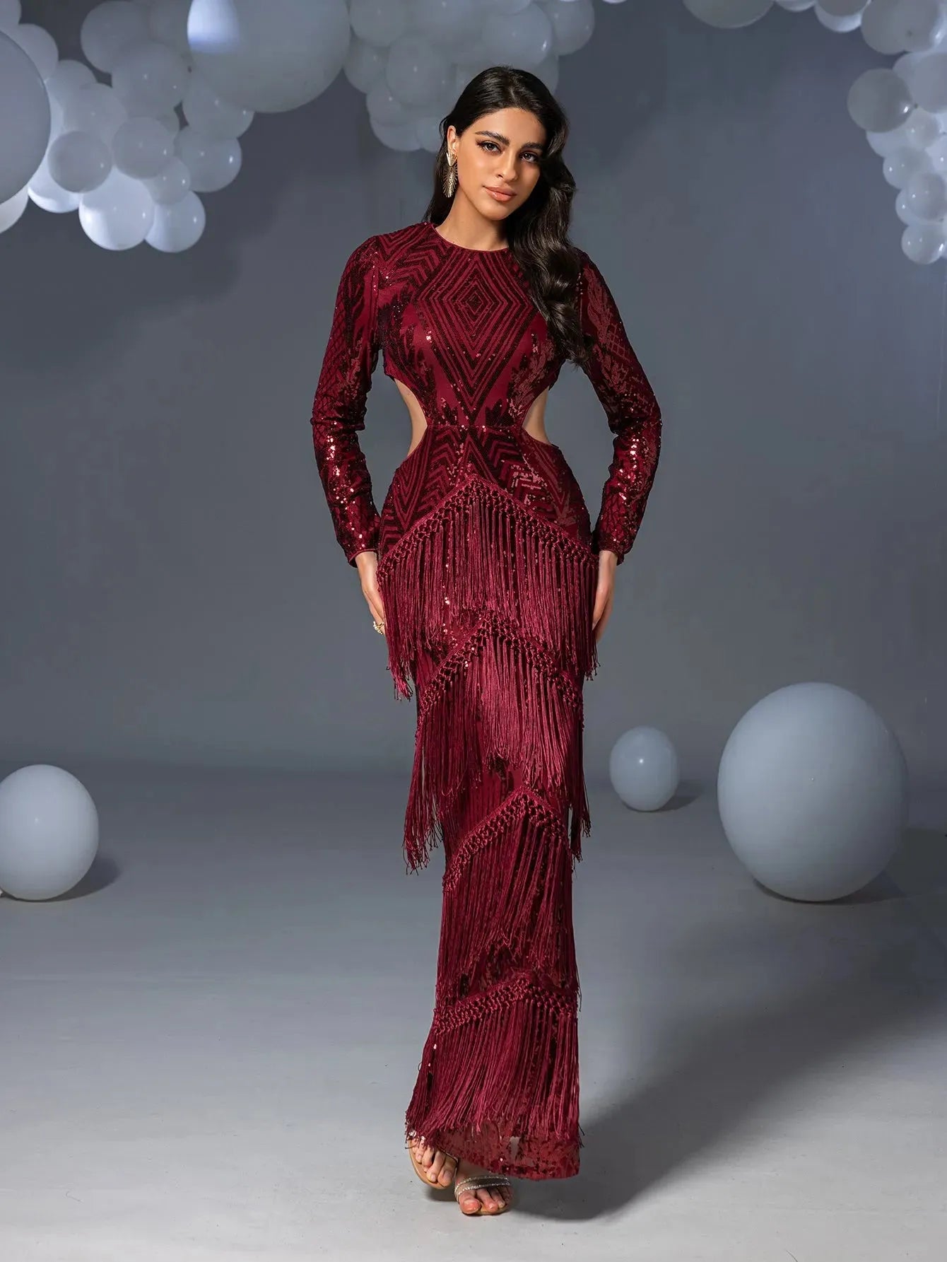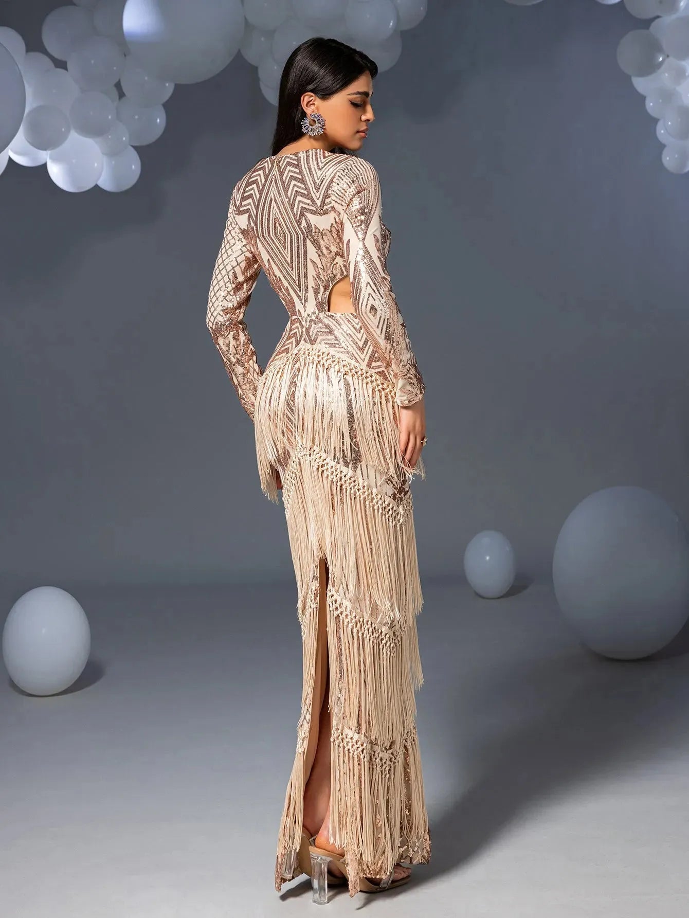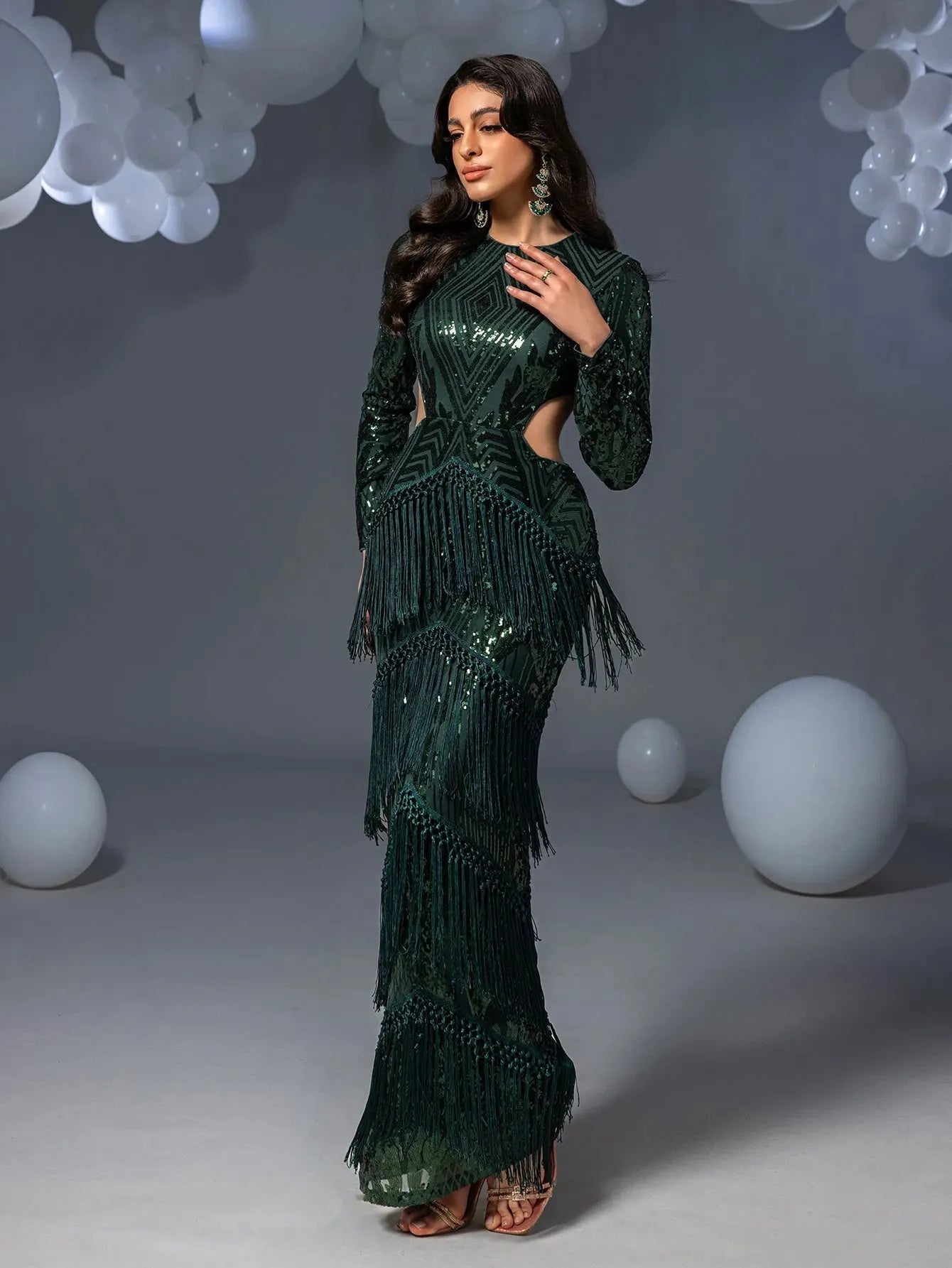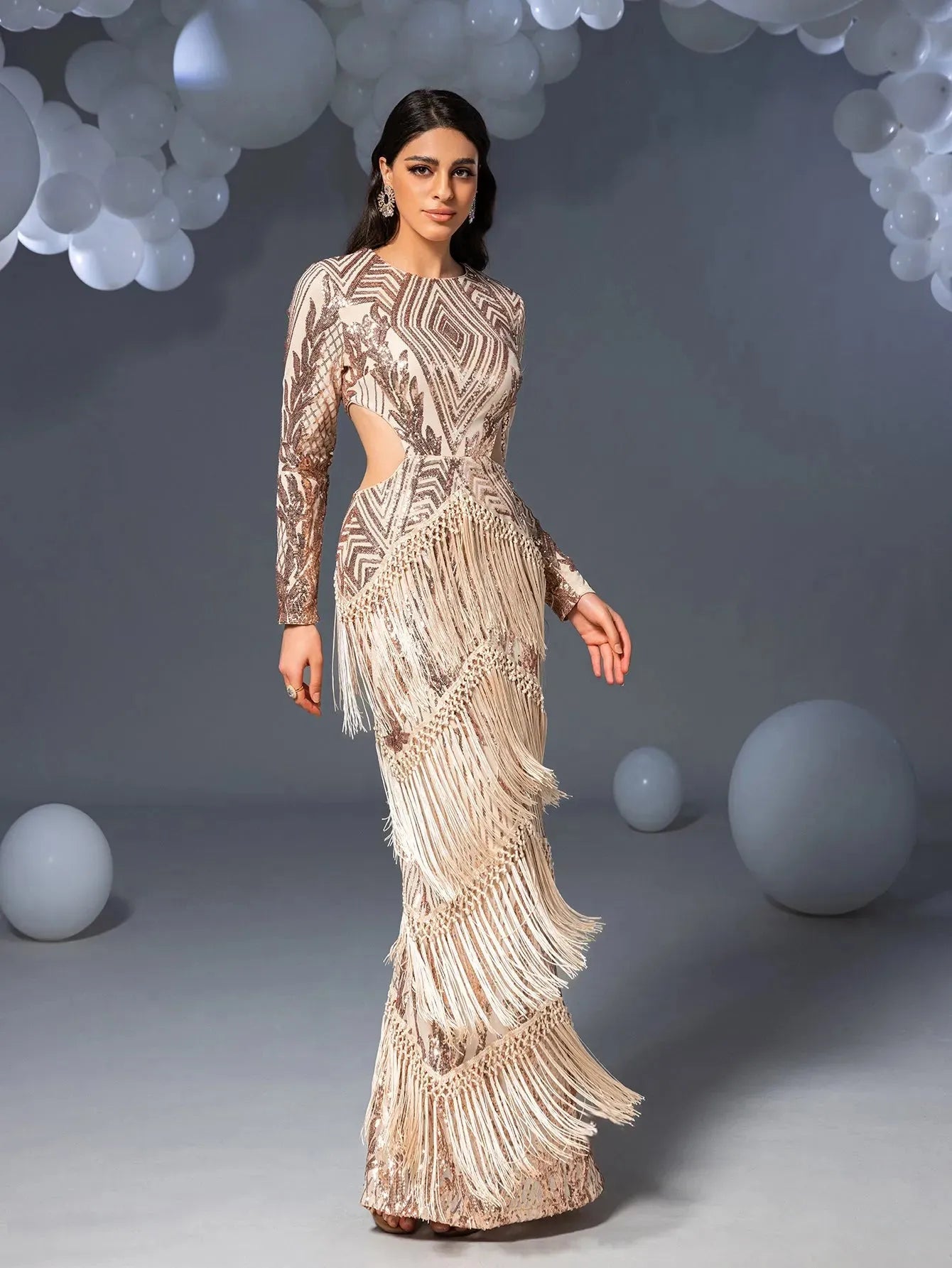 Turn heads in this stunning full-length gown, featuring intricate geometric sequin patterns that glisten with every movement. The dress boasts long sleeves and daring side cut-outs, accentuating your figure while adding a touch of modern sophistication. The luxurious fringe detailing cascades down the skirt, creating a mesmerizing effect as you walk. Perfect for glamorous events or upscale parties, this gown ensures you make a statement of elegance and style.