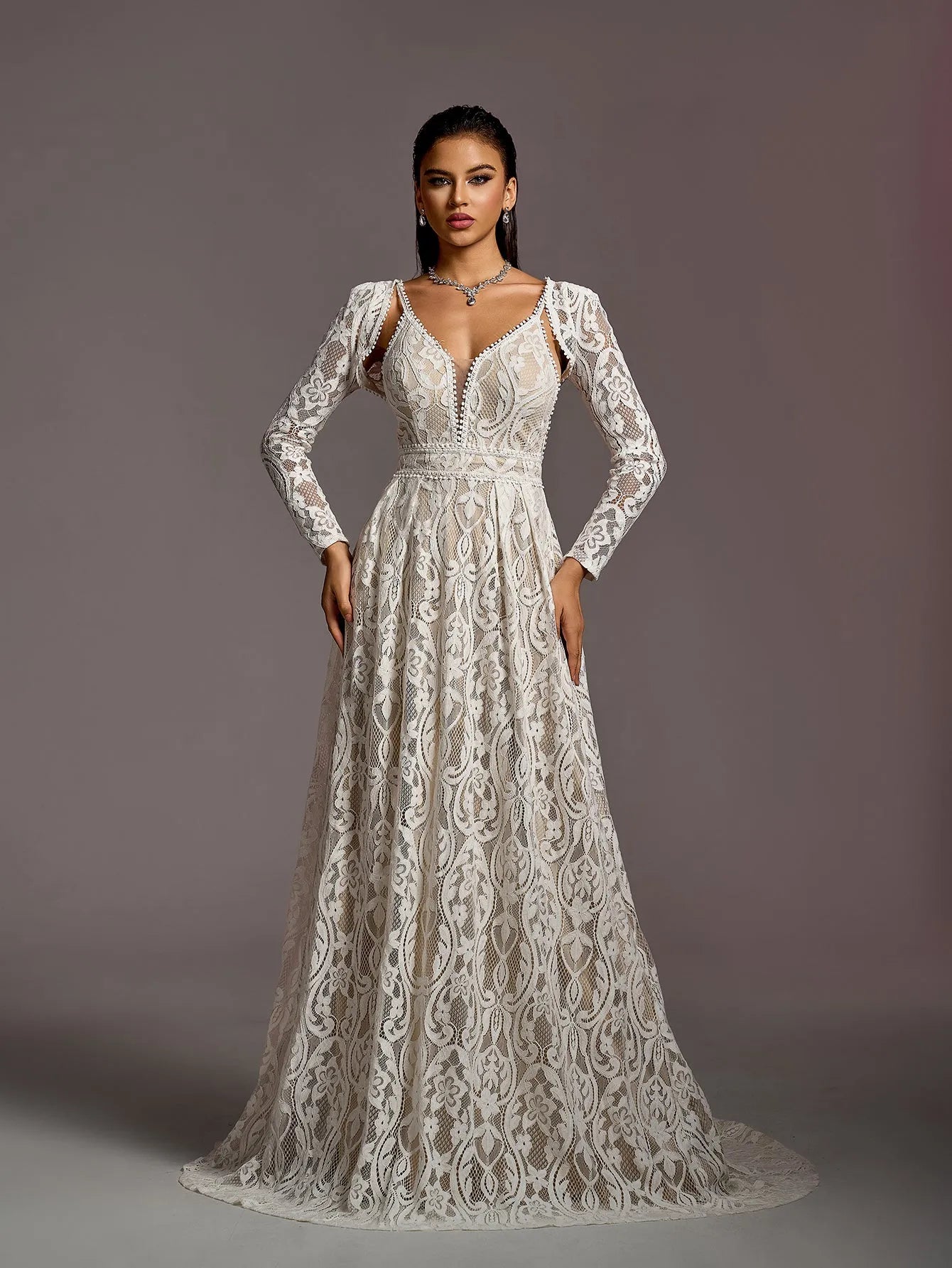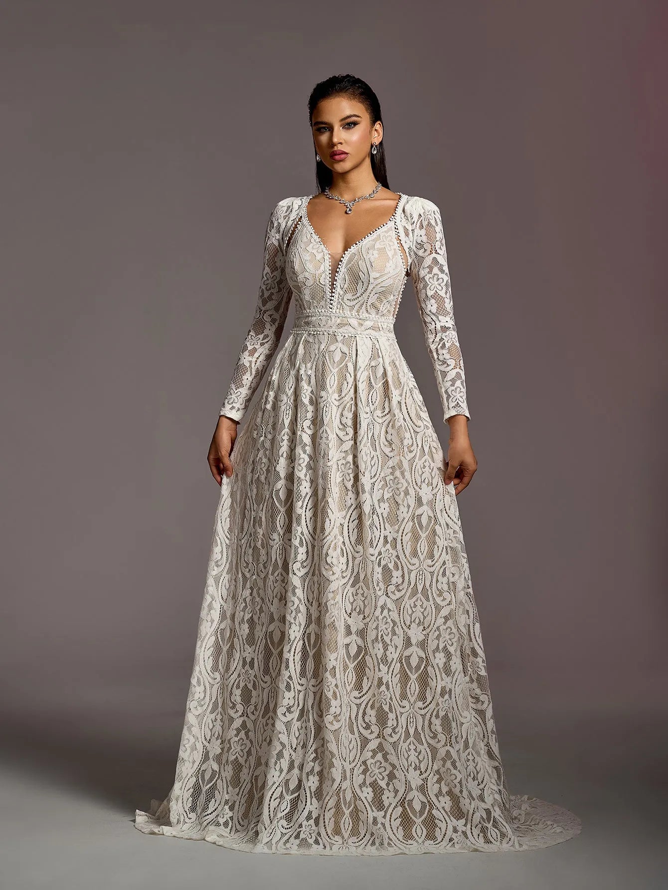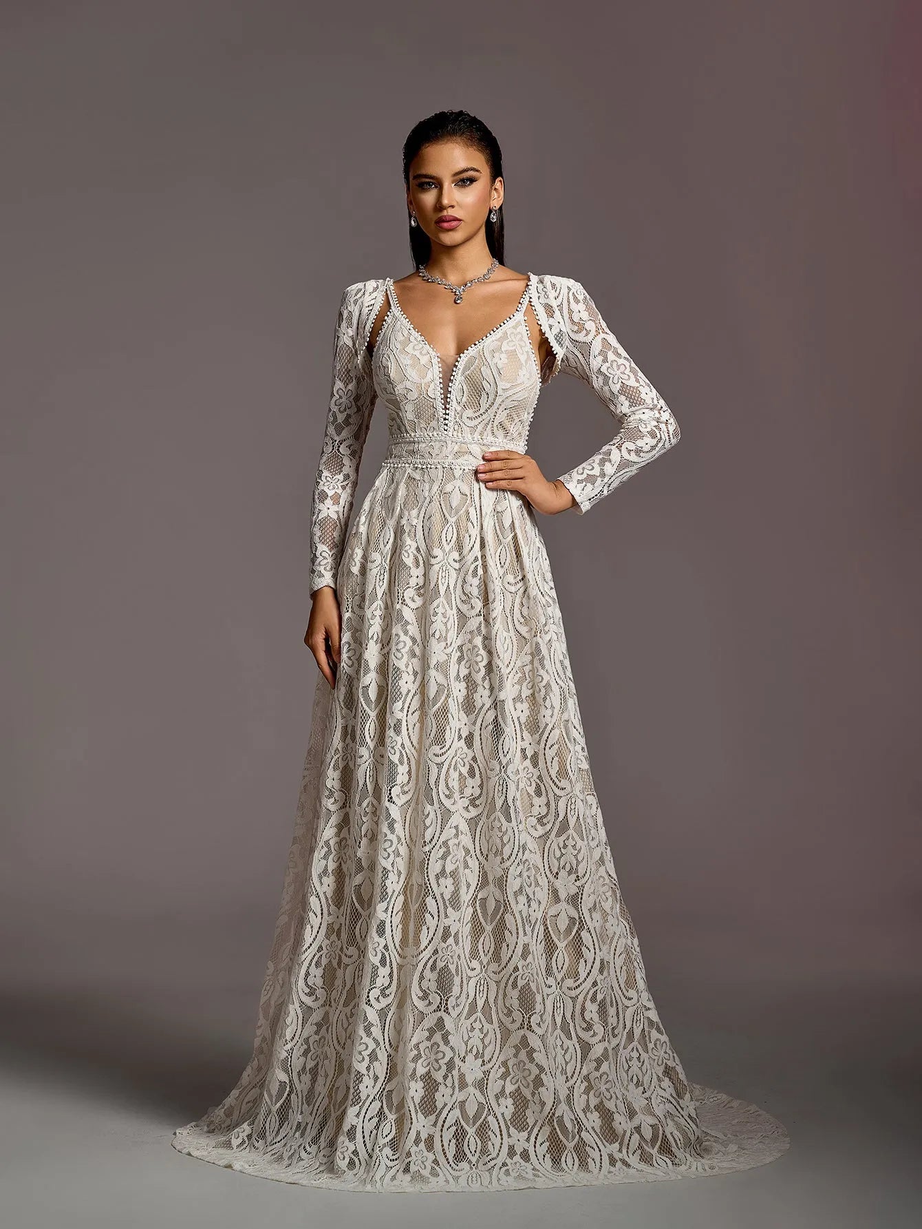 Step into timeless romance on your special day with our exquisitely crafted lace wedding dress. This gown features a deep V-neckline that perfectly balances elegance and allure, complemented by long, sheer lace sleeves for a vintage-inspired touch. The fitted bodice flows gracefully into a floor-length A-line skirt, adorned with delicate lace patterns that capture a classic, ethereal look. The open back adds a hint of modern sophistication, creating a memorable silhouette for the bride.