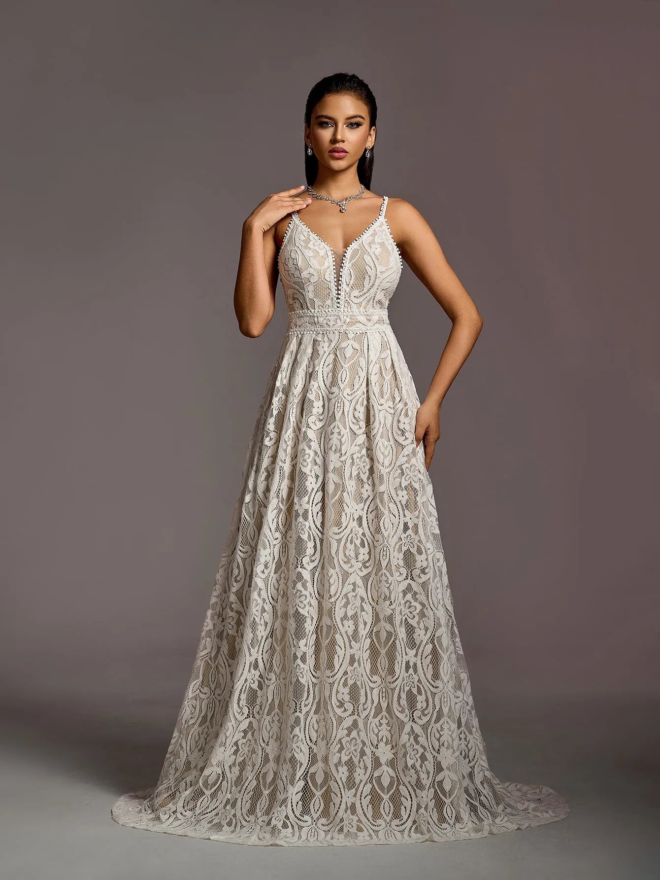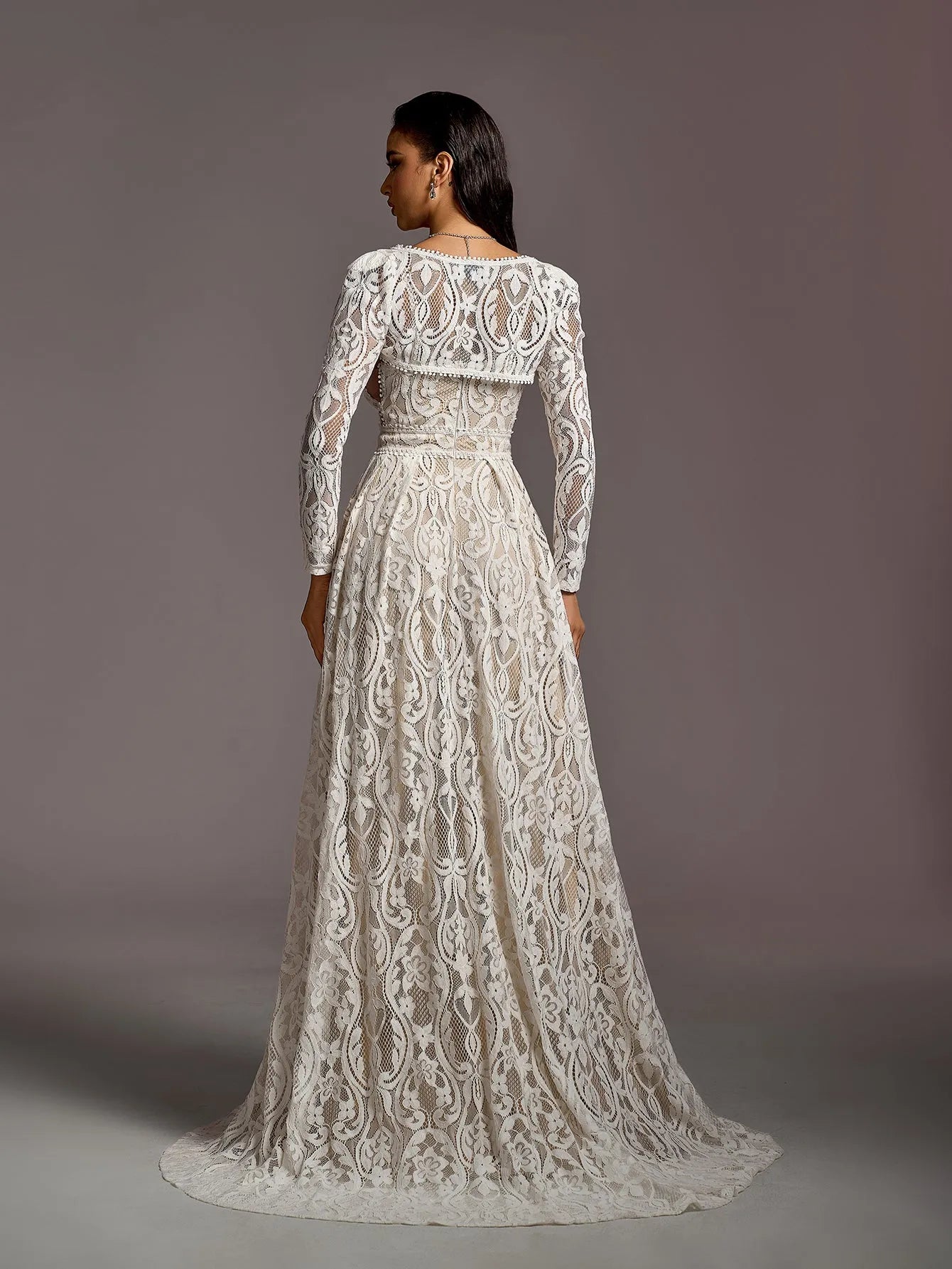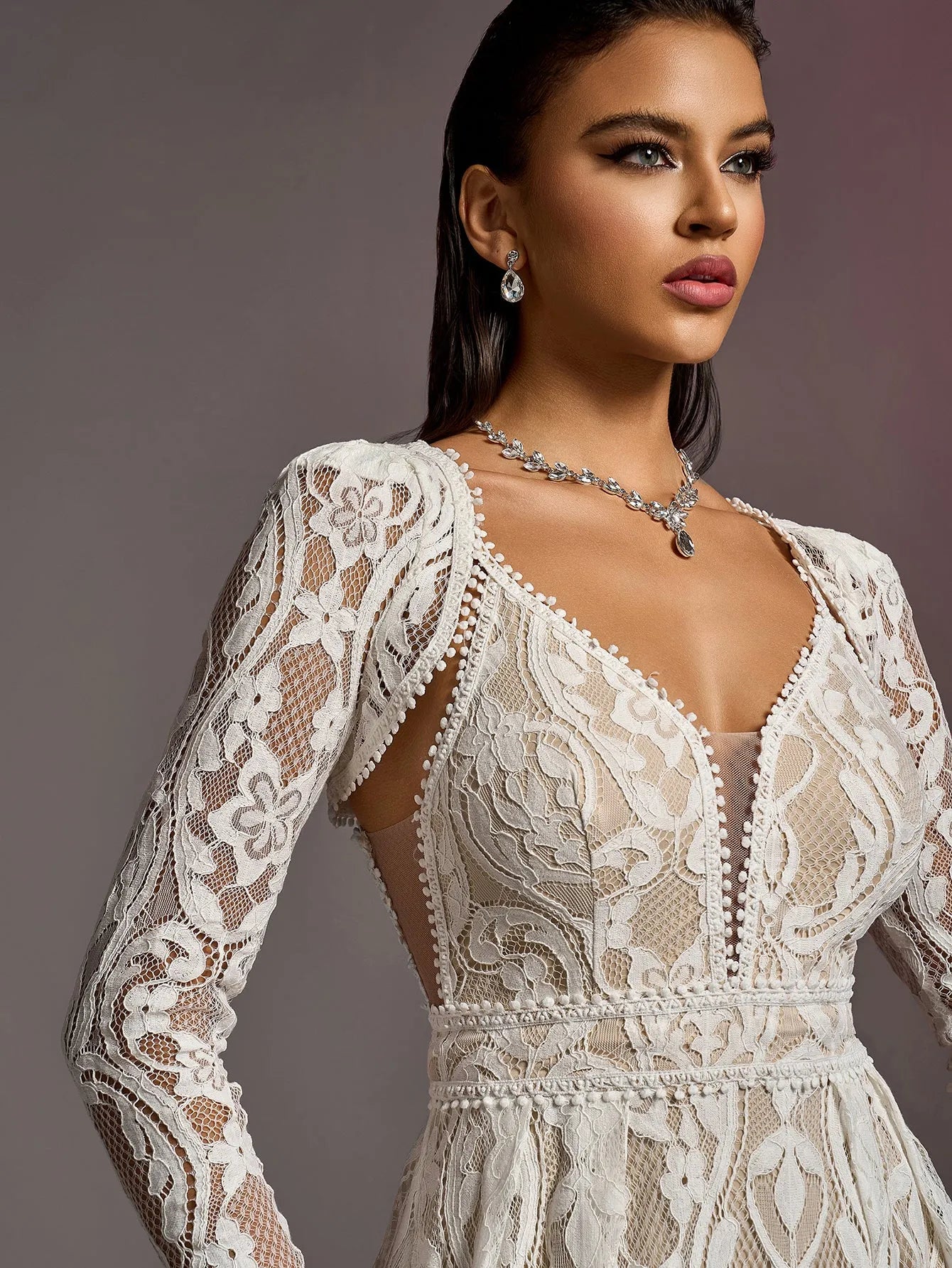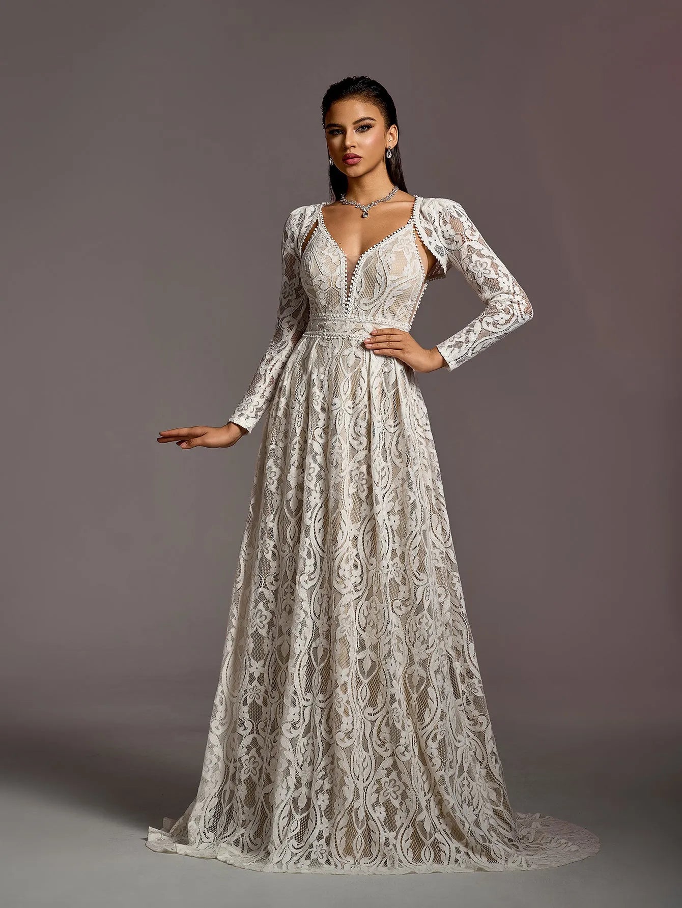 Step into timeless romance on your special day with our exquisitely crafted lace wedding dress. This gown features a deep V-neckline that perfectly balances elegance and allure, complemented by long, sheer lace sleeves for a vintage-inspired touch. The fitted bodice flows gracefully into a floor-length A-line skirt, adorned with delicate lace patterns that capture a classic, ethereal look. The open back adds a hint of modern sophistication, creating a memorable silhouette for the bride.