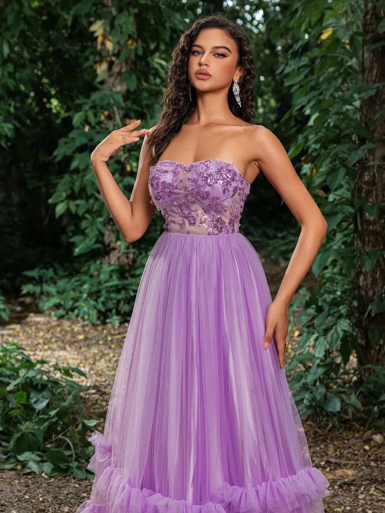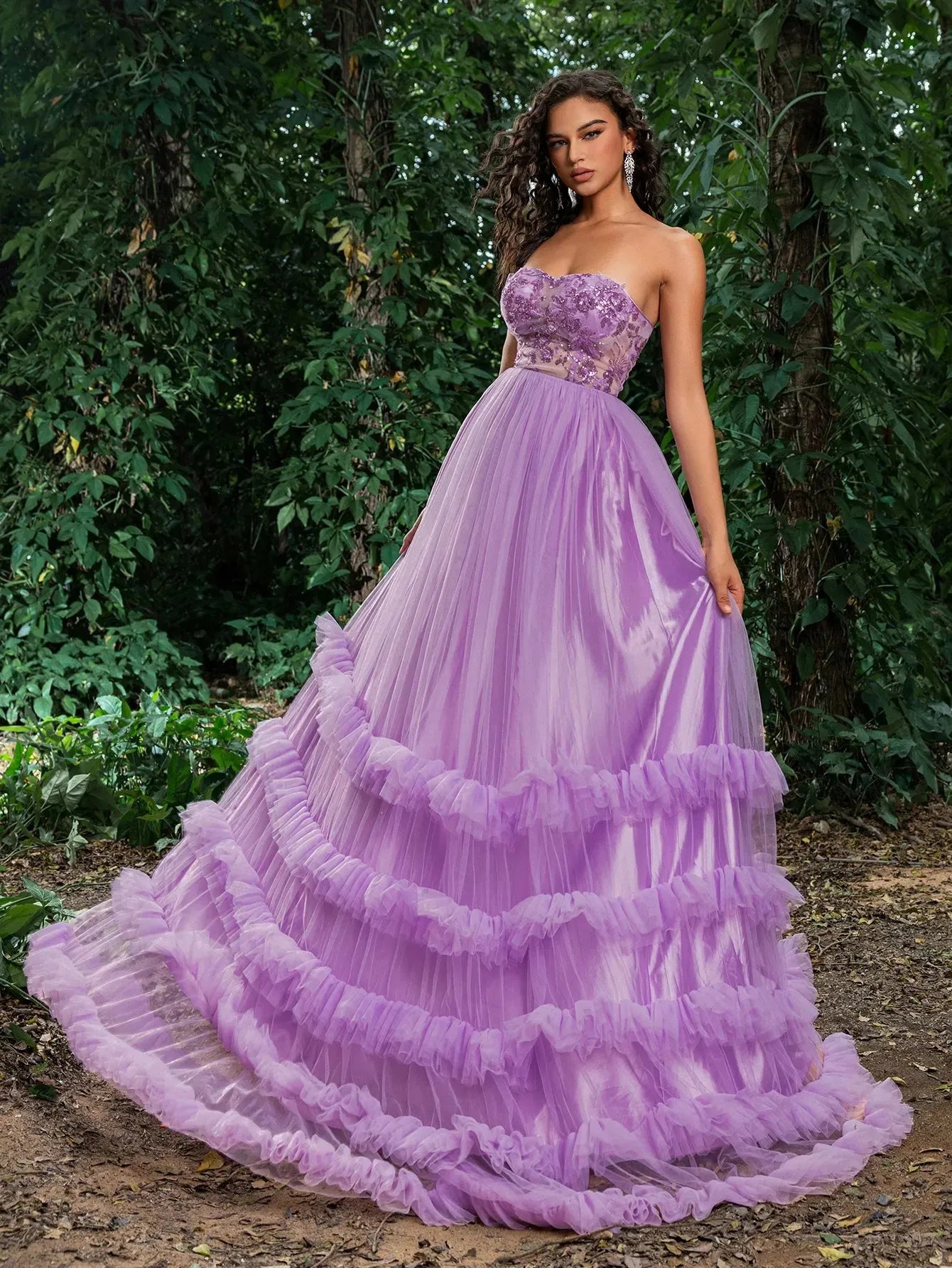 Step into a world of enchantment with our enchantment ball gown. This breathtaking dress features a rich hue, with intricate floral embroidery on the fitted bodice, creating a look of ethereal beauty. The strapless design and sweetheart neckline accentuate your natural elegance, while the voluminous layered tulle skirt with ruffle detailing adds a whimsical touch. Perfect for proms, weddings, or any grand event where you wish to make a lasting impression. The lace-up back ensures a perfect fit, and the lightweight fabric keeps you comfortable throughout the evening. Pair it with statement jewelry and elegant heels to complete your enchanting ensemble.