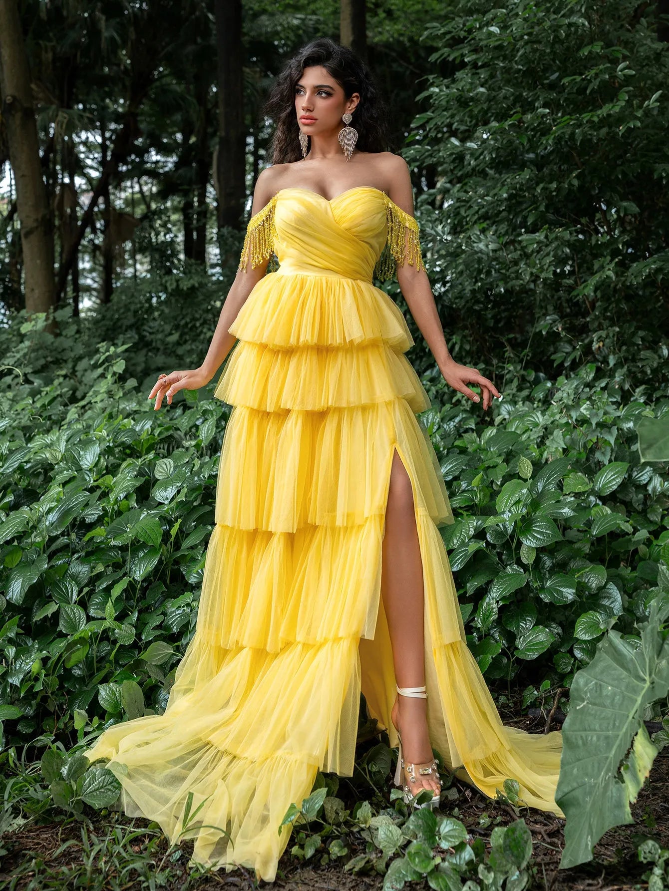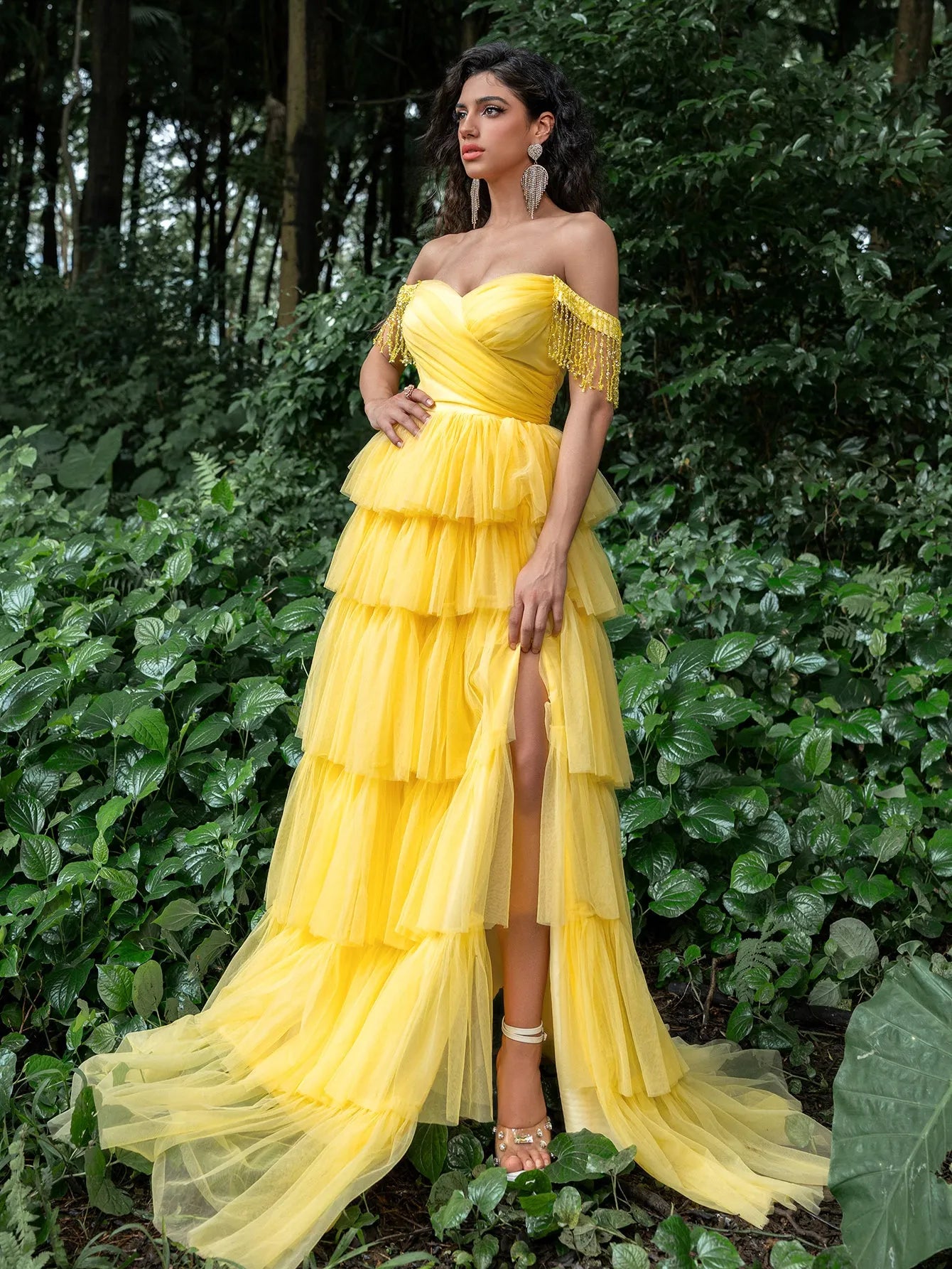 Capture attention with our bold and vibrant tiered gown, designed for those who love to make a statement. This gown features an off-the-shoulder neckline adorned with shimmering fringe detailing, adding a touch of glamour to its already dramatic look. The tiered tulle skirt creates a voluminous, flowing silhouette that moves with every step, while the lace-up corset back ensures a perfect fit.