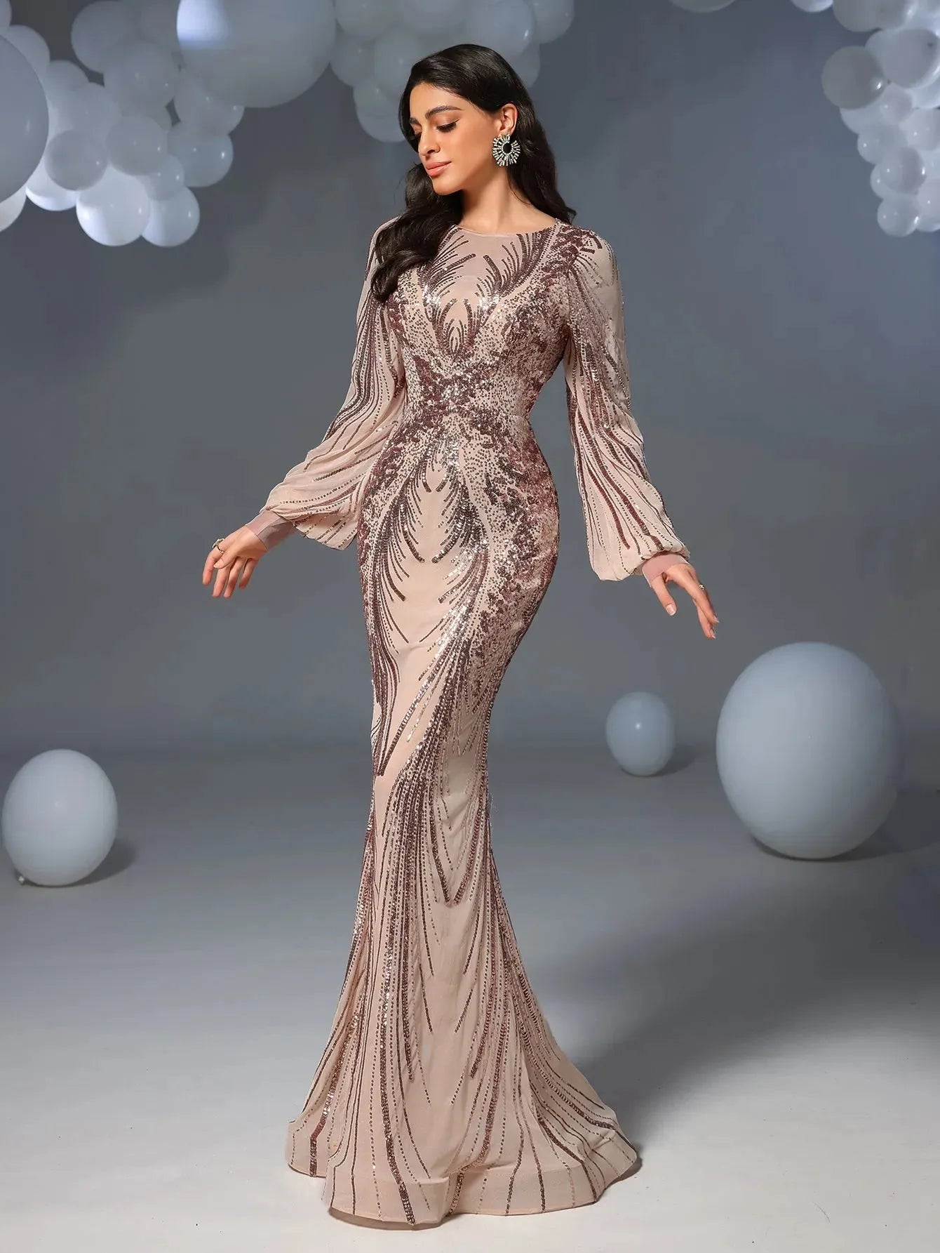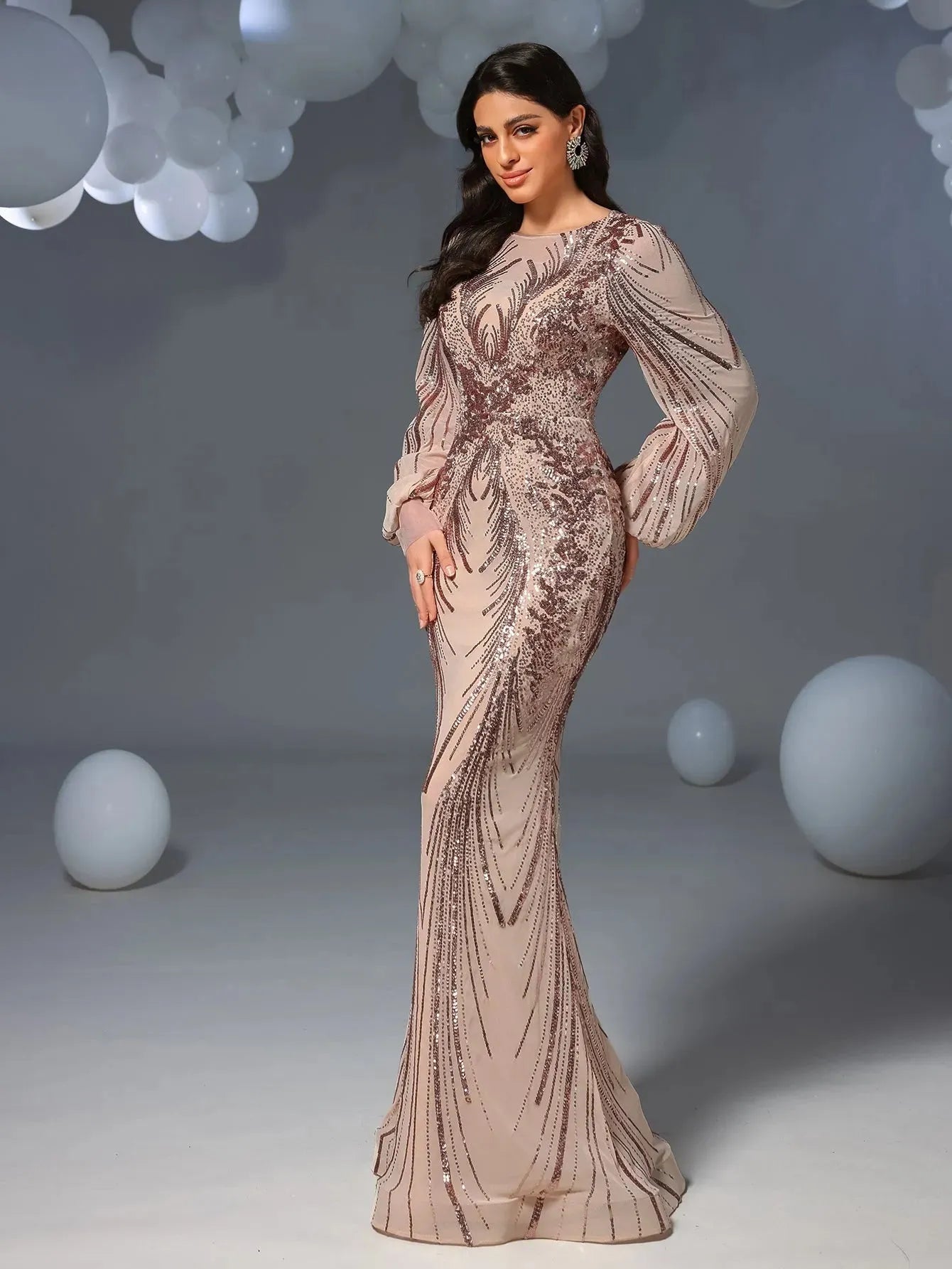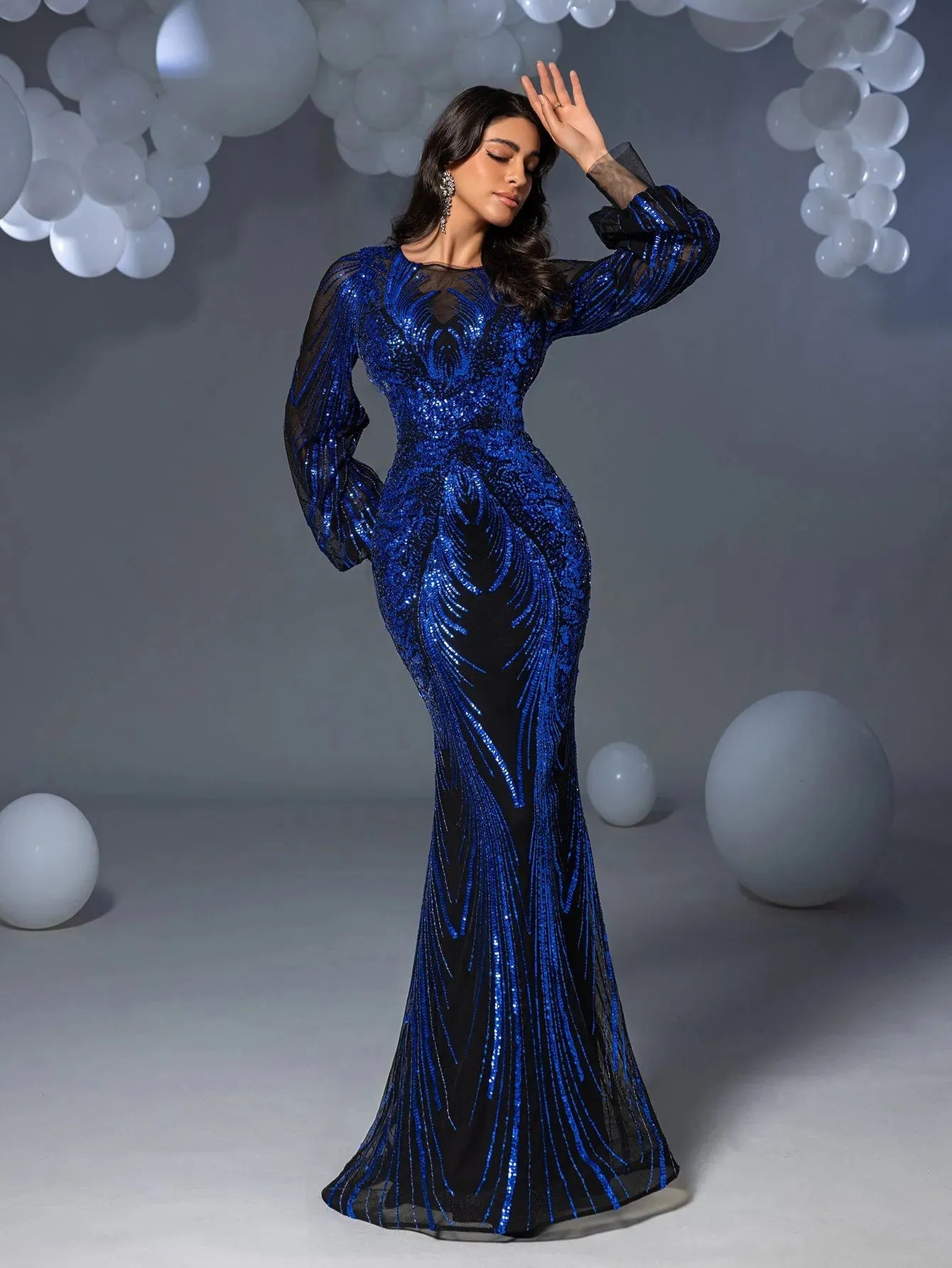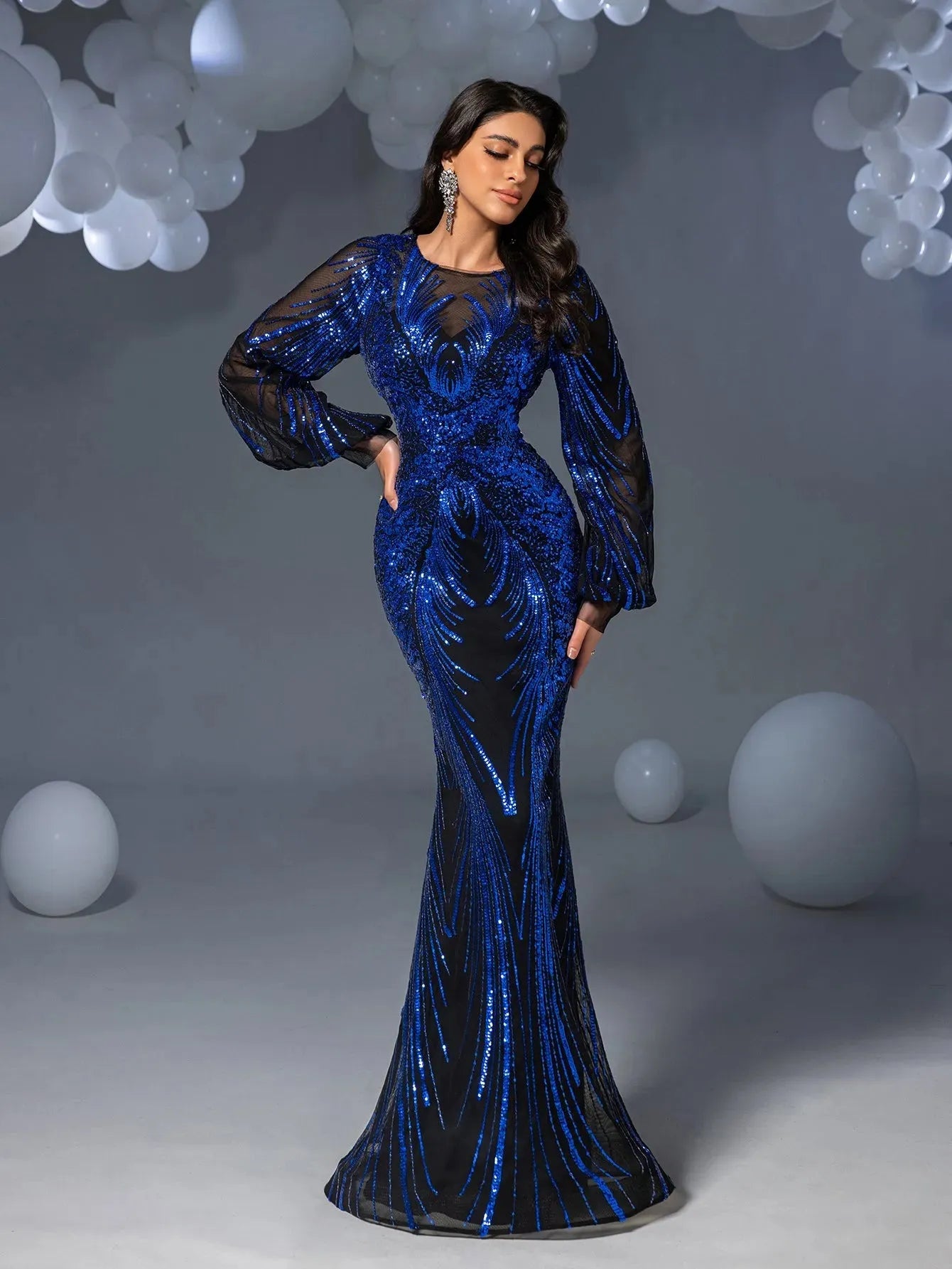 Turn heads in our sophisticated evening gown, adorned with intricate sequins. This striking dress features a fitted silhouette that enhances your curves, while the long, sheer sleeves add a touch of elegance and mystery. The exquisite sequin pattern creates a captivating design, making you the center of attention at any event.