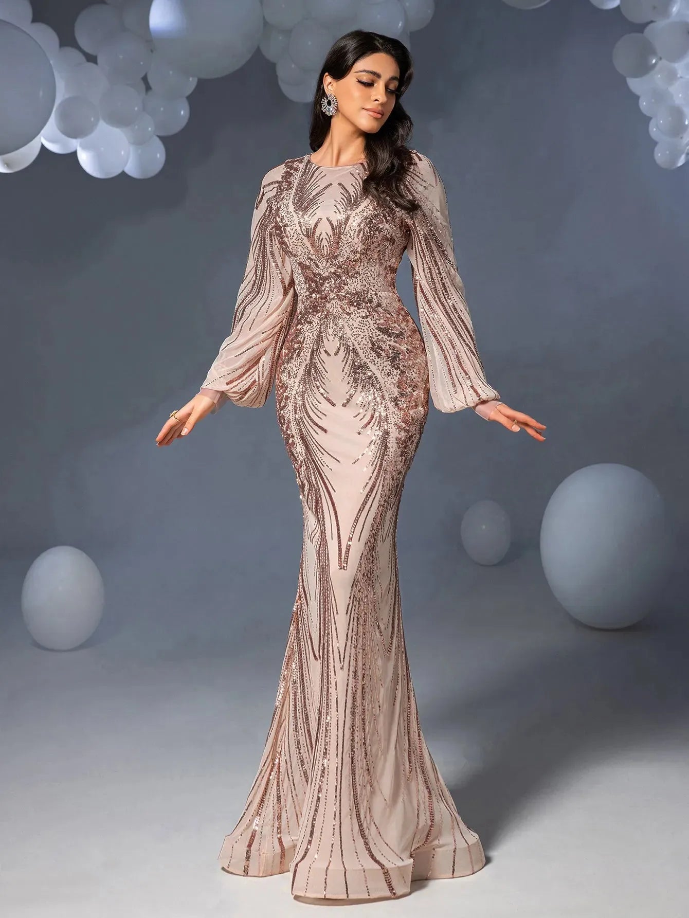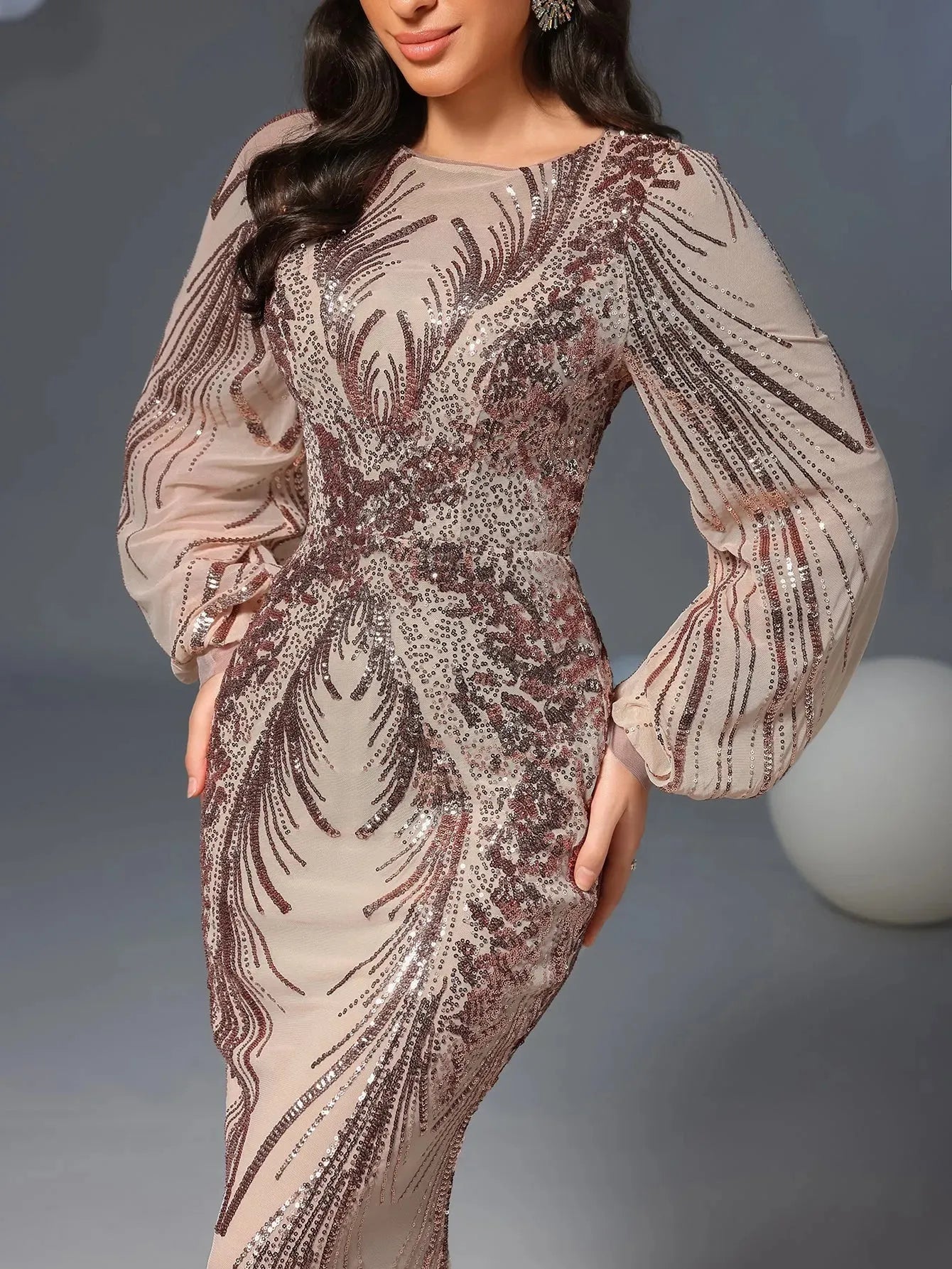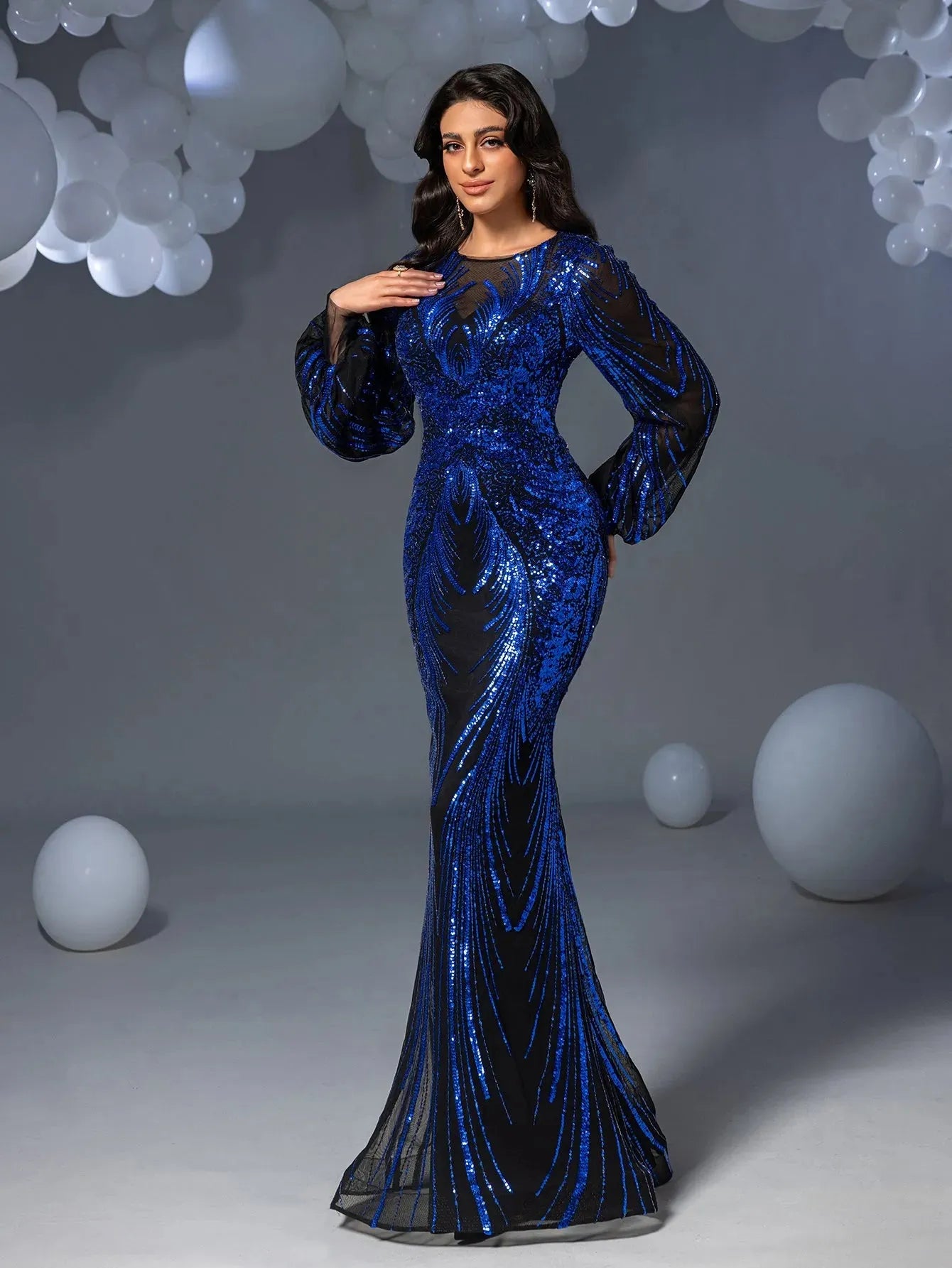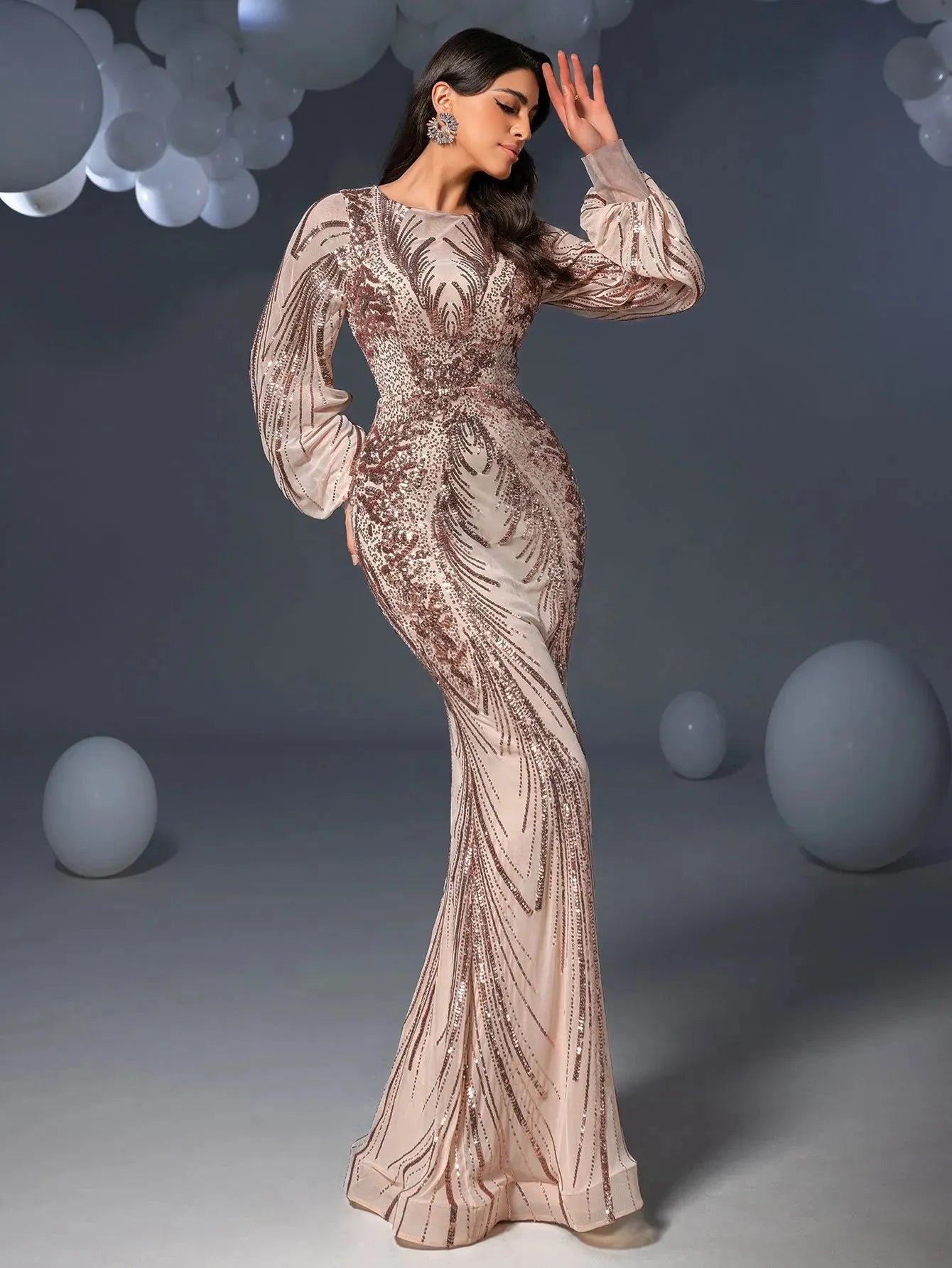 Turn heads in our sophisticated evening gown, adorned with intricate sequins. This striking dress features a fitted silhouette that enhances your curves, while the long, sheer sleeves add a touch of elegance and mystery. The exquisite sequin pattern creates a captivating design, making you the center of attention at any event.