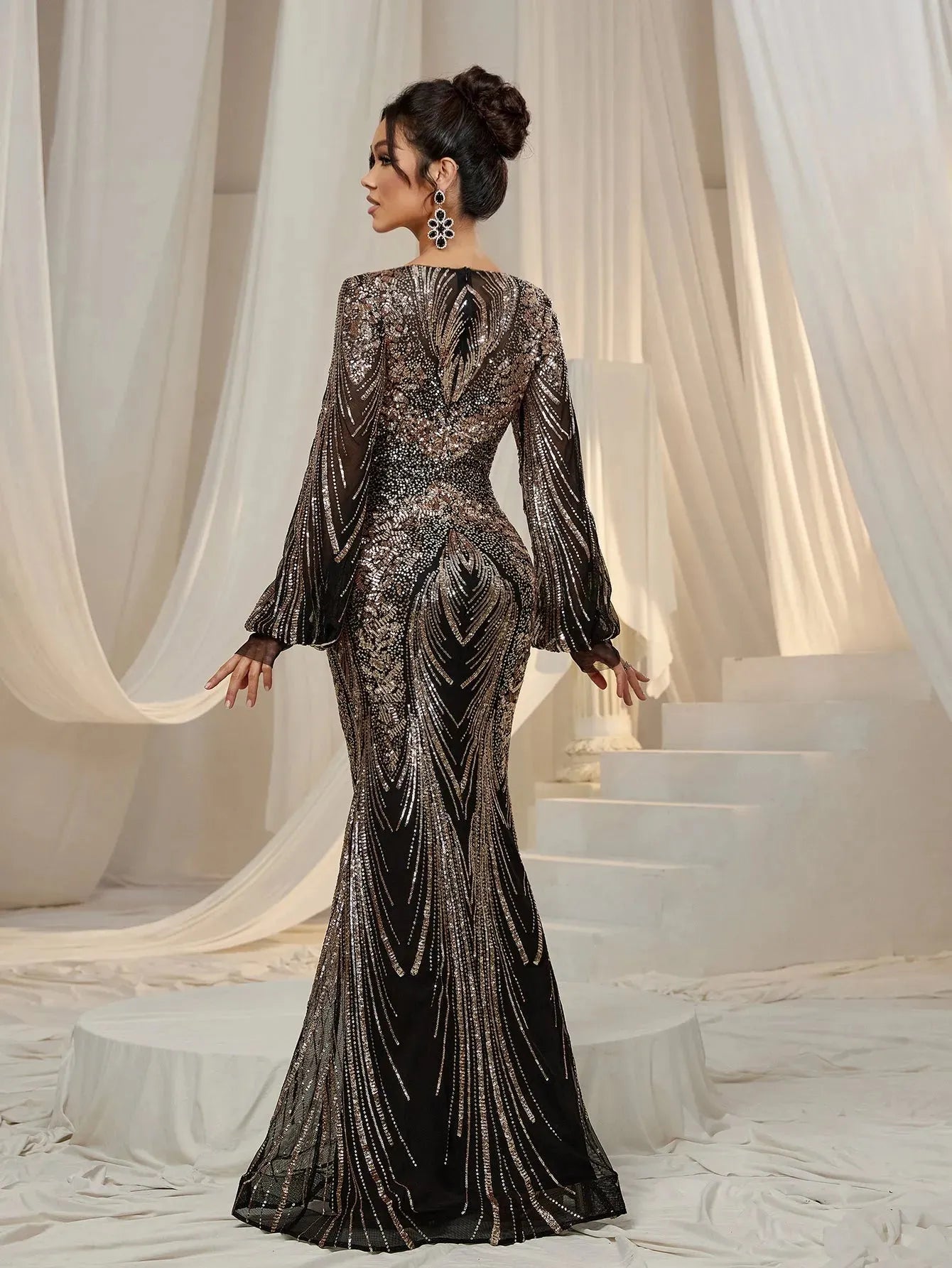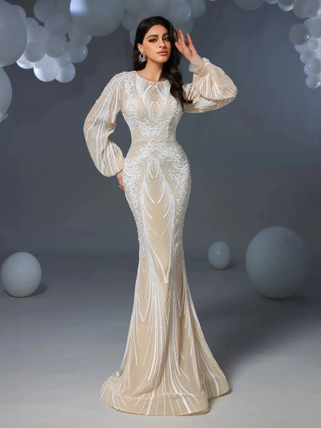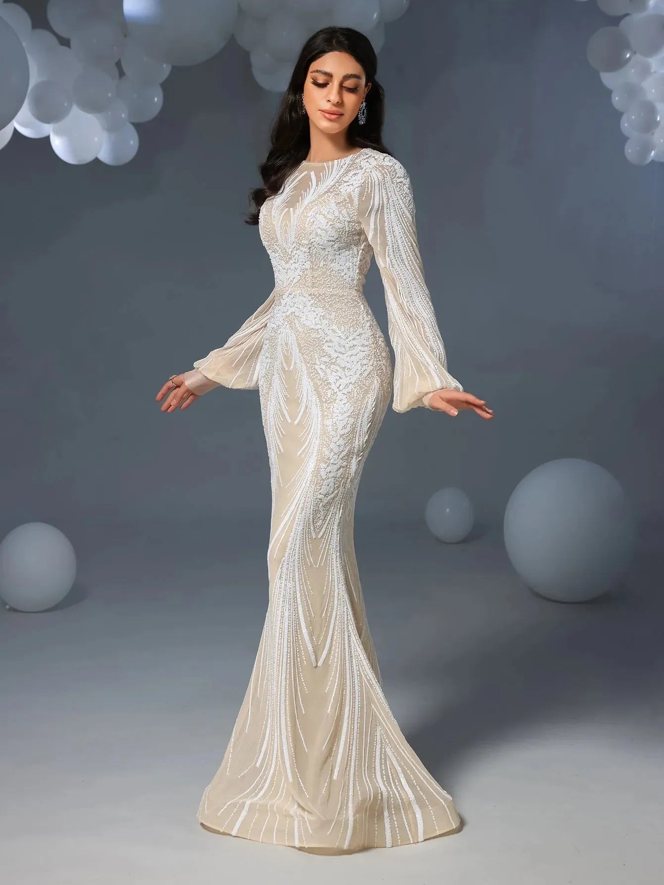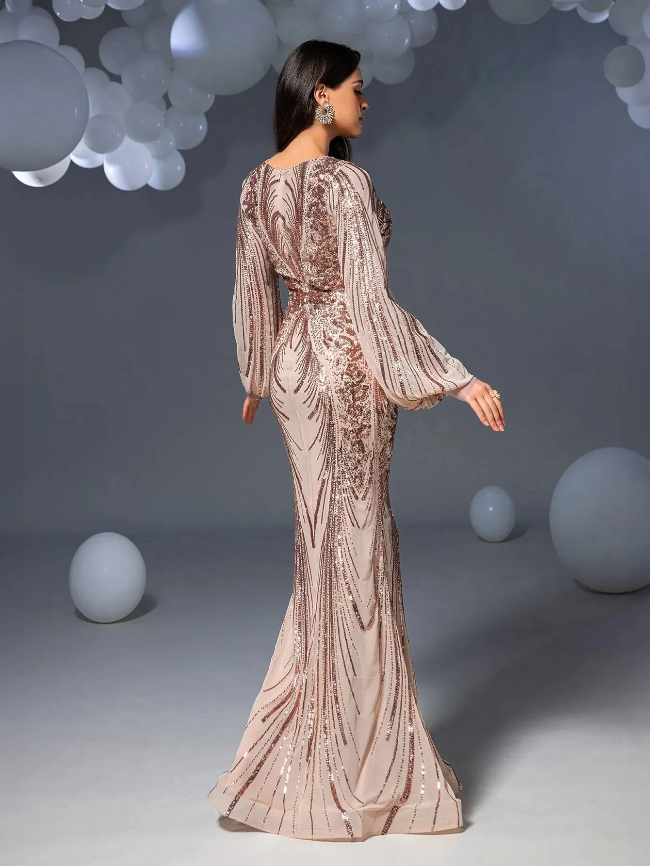 Turn heads in our sophisticated evening gown, adorned with intricate sequins. This striking dress features a fitted silhouette that enhances your curves, while the long, sheer sleeves add a touch of elegance and mystery. The exquisite sequin pattern creates a captivating design, making you the center of attention at any event.