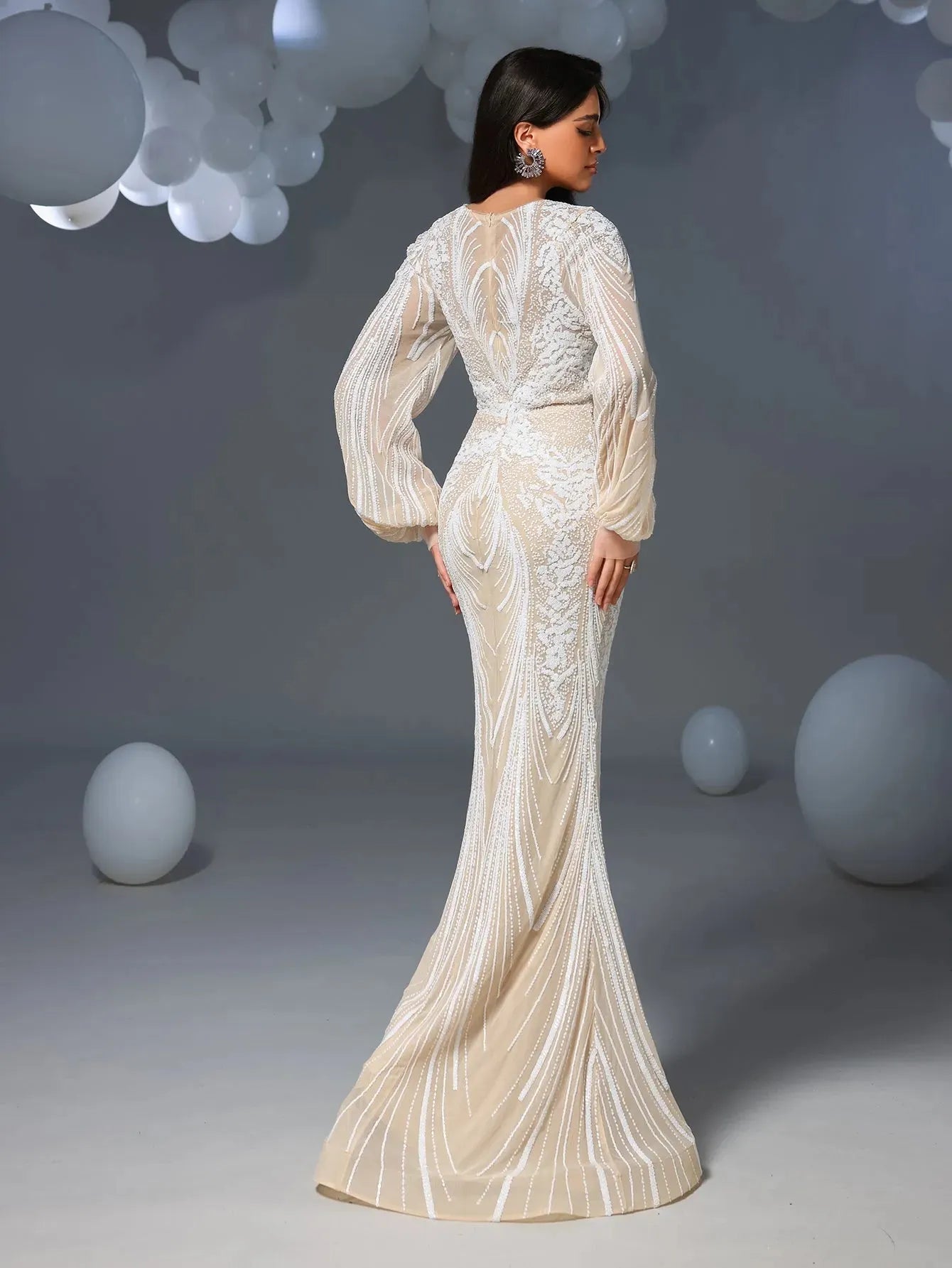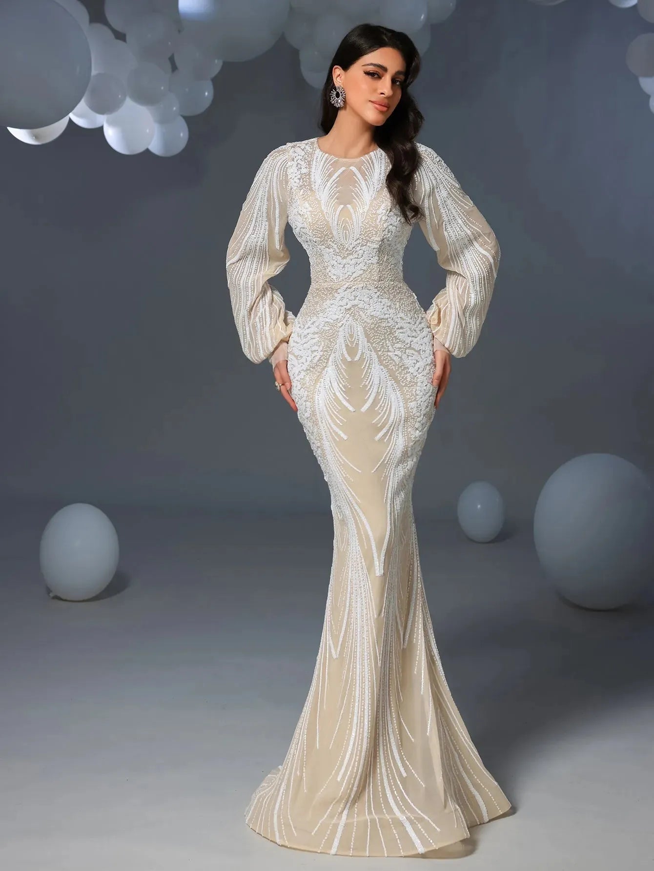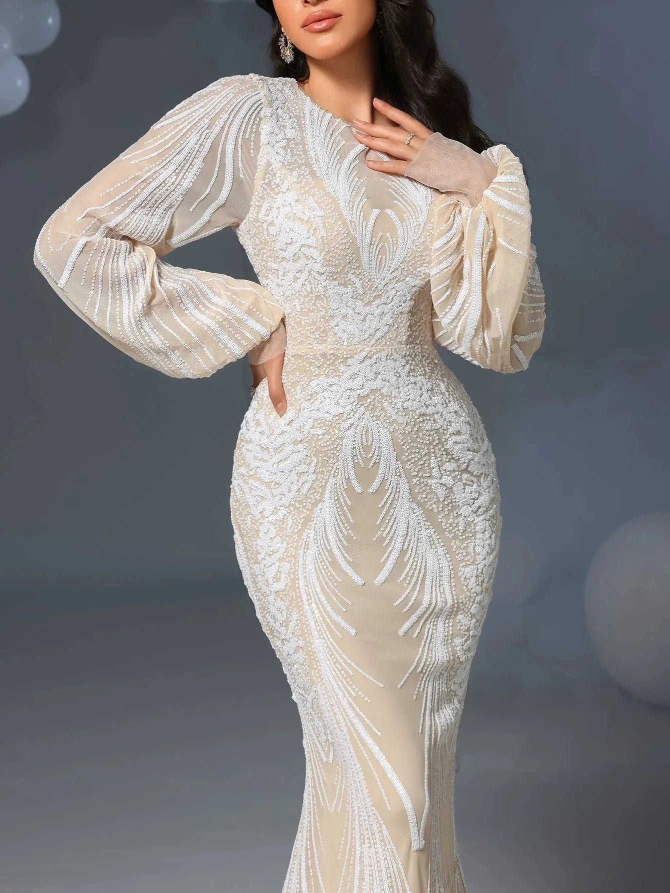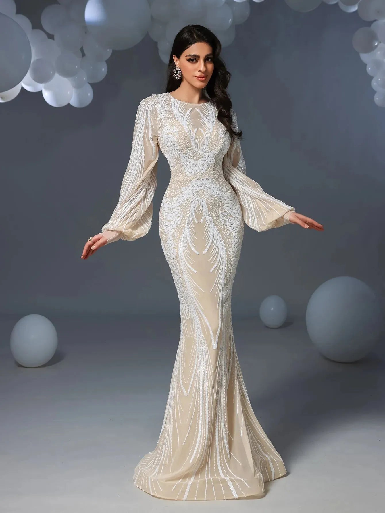 Turn heads in our sophisticated evening gown, adorned with intricate sequins. This striking dress features a fitted silhouette that enhances your curves, while the long, sheer sleeves add a touch of elegance and mystery. The exquisite sequin pattern creates a captivating design, making you the center of attention at any event.