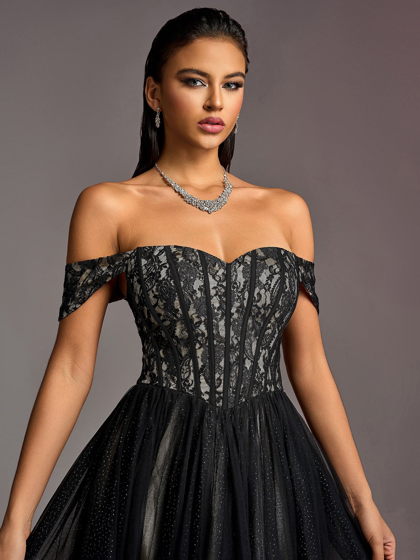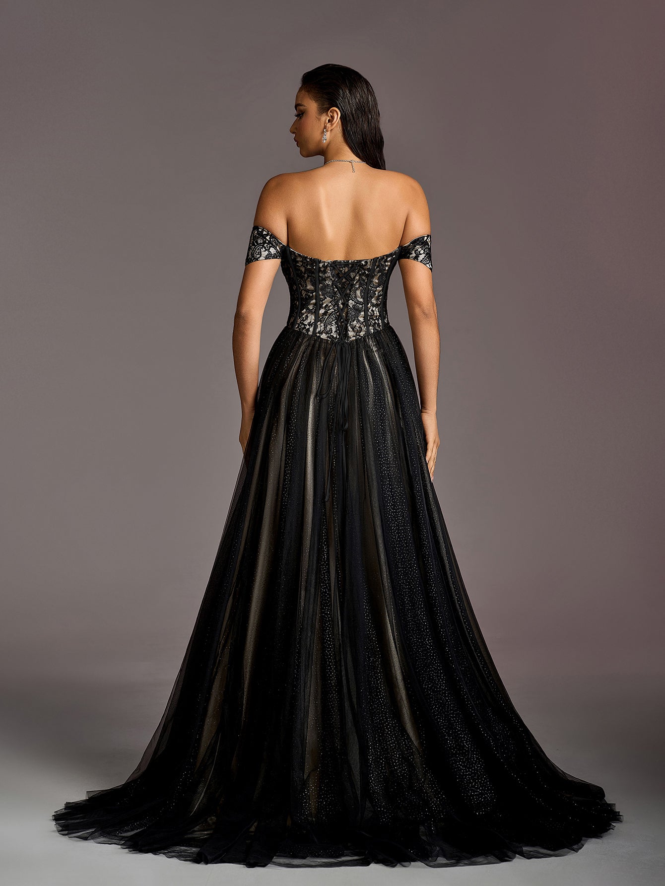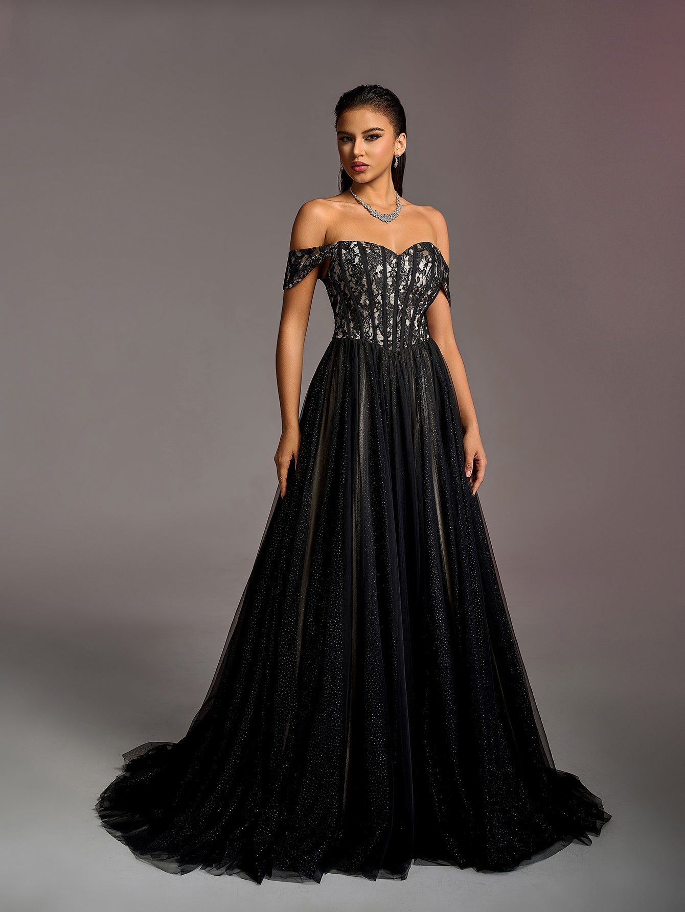 Our stunning black evening gown is crafted to make you the center of attention at any formal event. The gown features an off-the-shoulder neckline that adds a touch of sophistication and allure. The intricate lace detailing on the bodice enhances the overall design, while the full-length tulle skirt flows gracefully, creating a dramatic and regal silhouette.