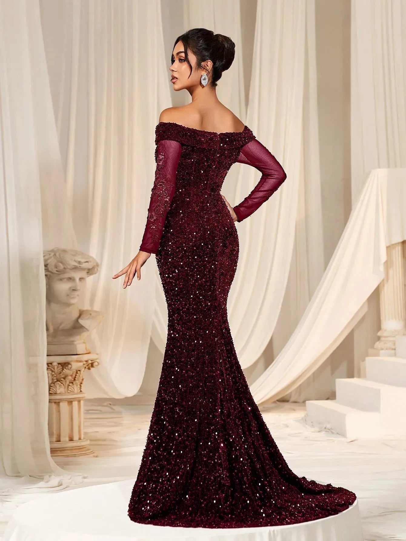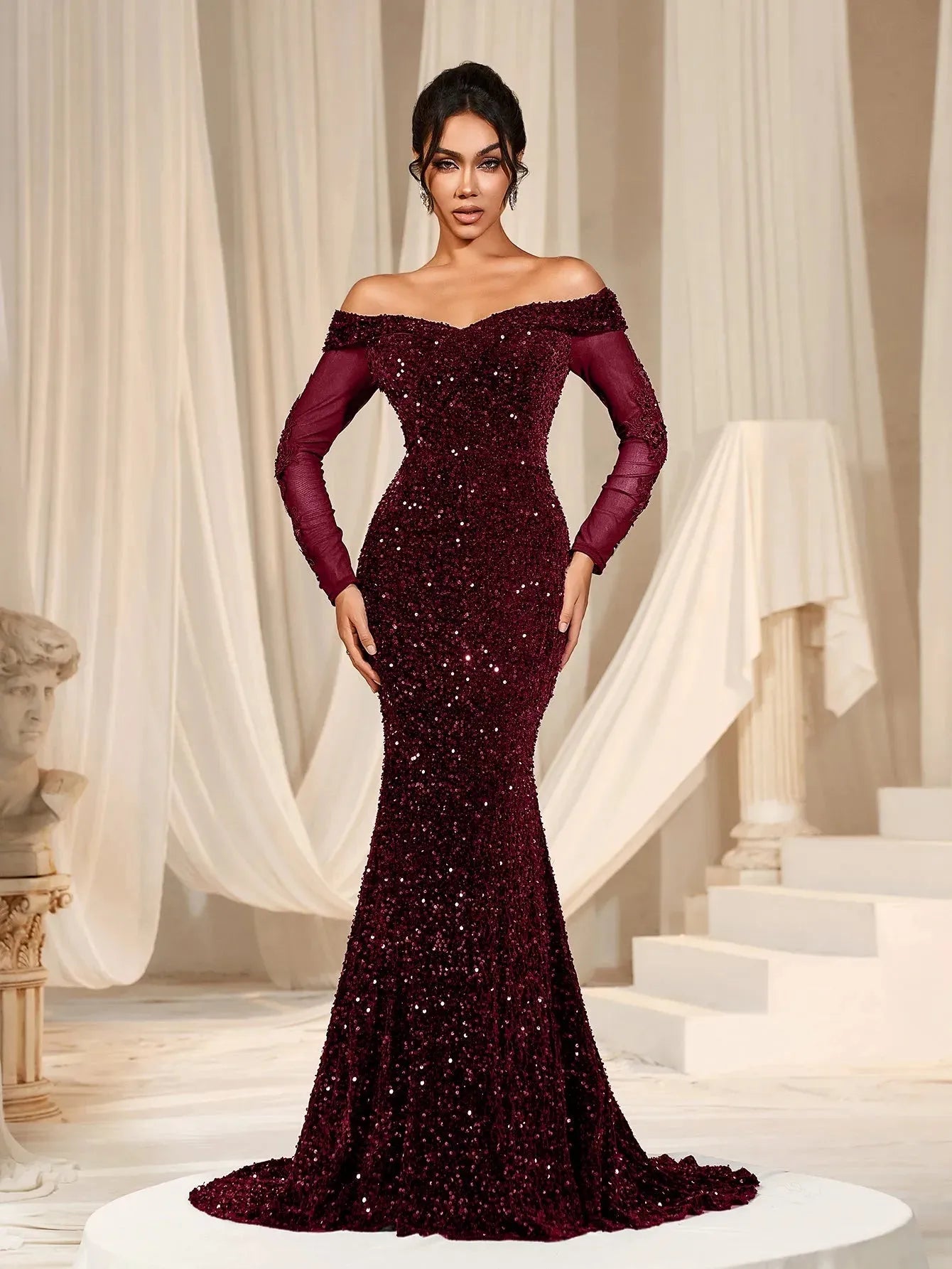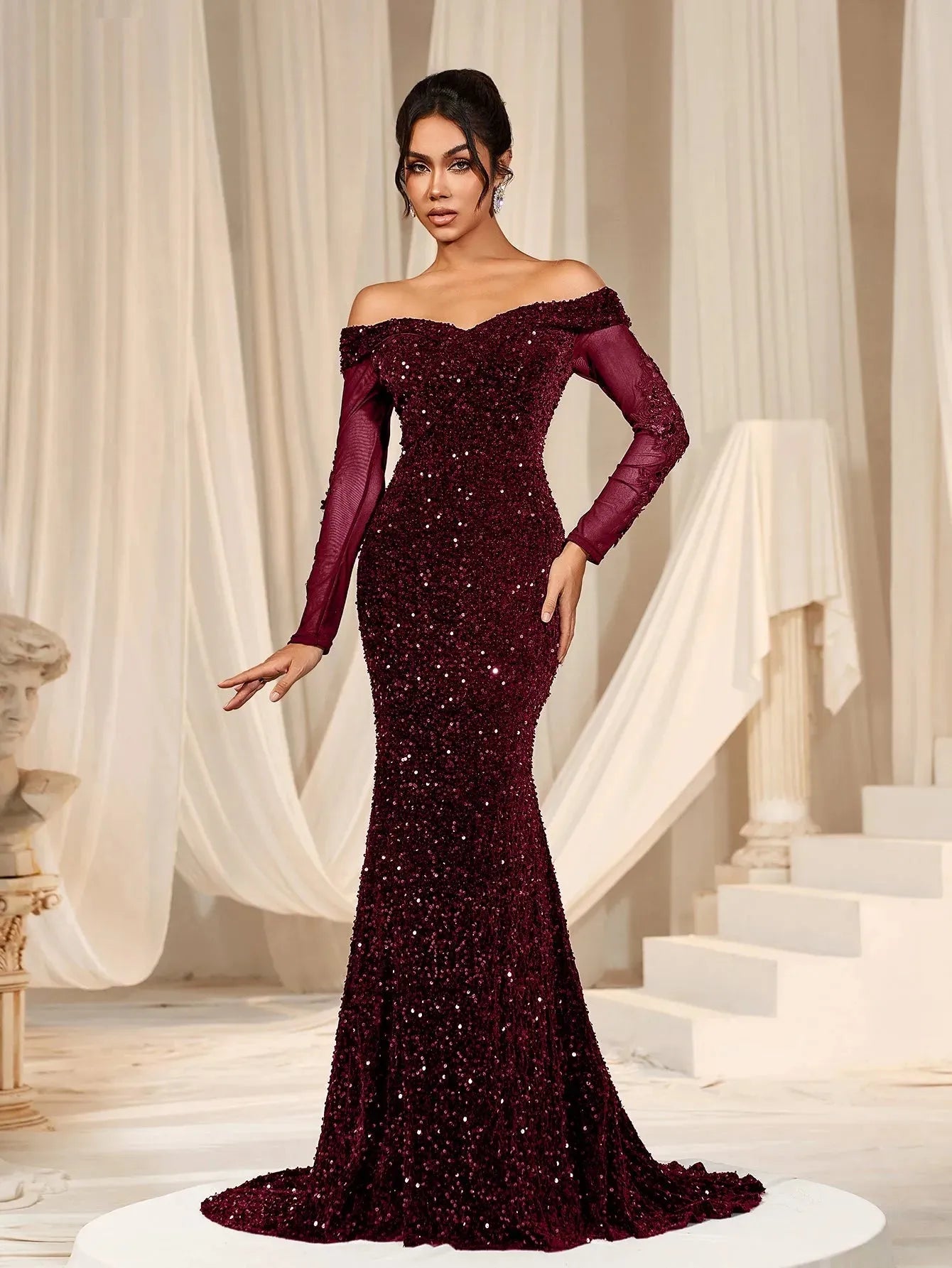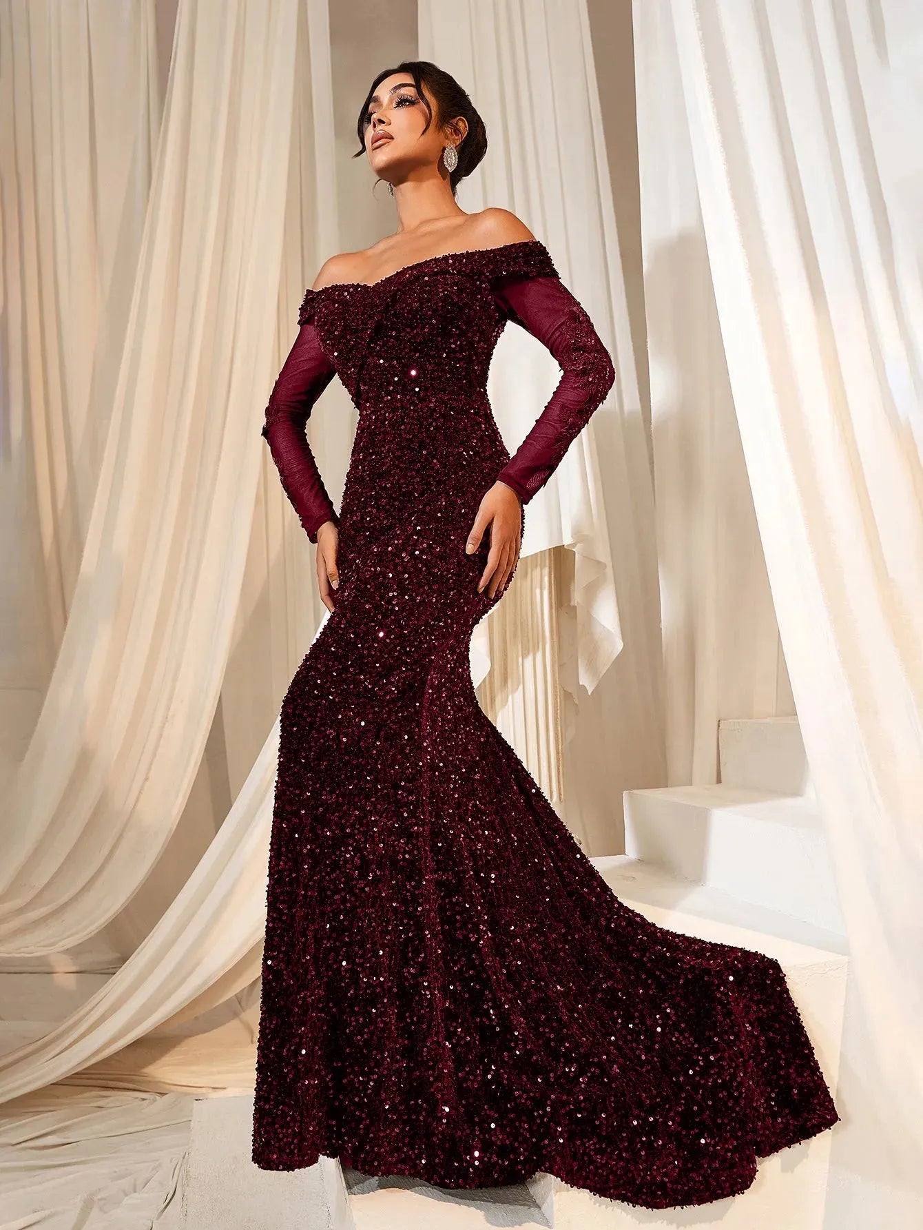 Dazzle in our elegant sequin gown, designed to make a memorable entrance. This exquisite dress features an off-shoulder neckline that beautifully highlights your collarbones and shoulders. The fitted silhouette is adorned with sparkling sequins, creating a stunning, shimmering effect. The long, sheer sleeves add a touch of sophistication, while the slight train enhances the gown's regal allure.