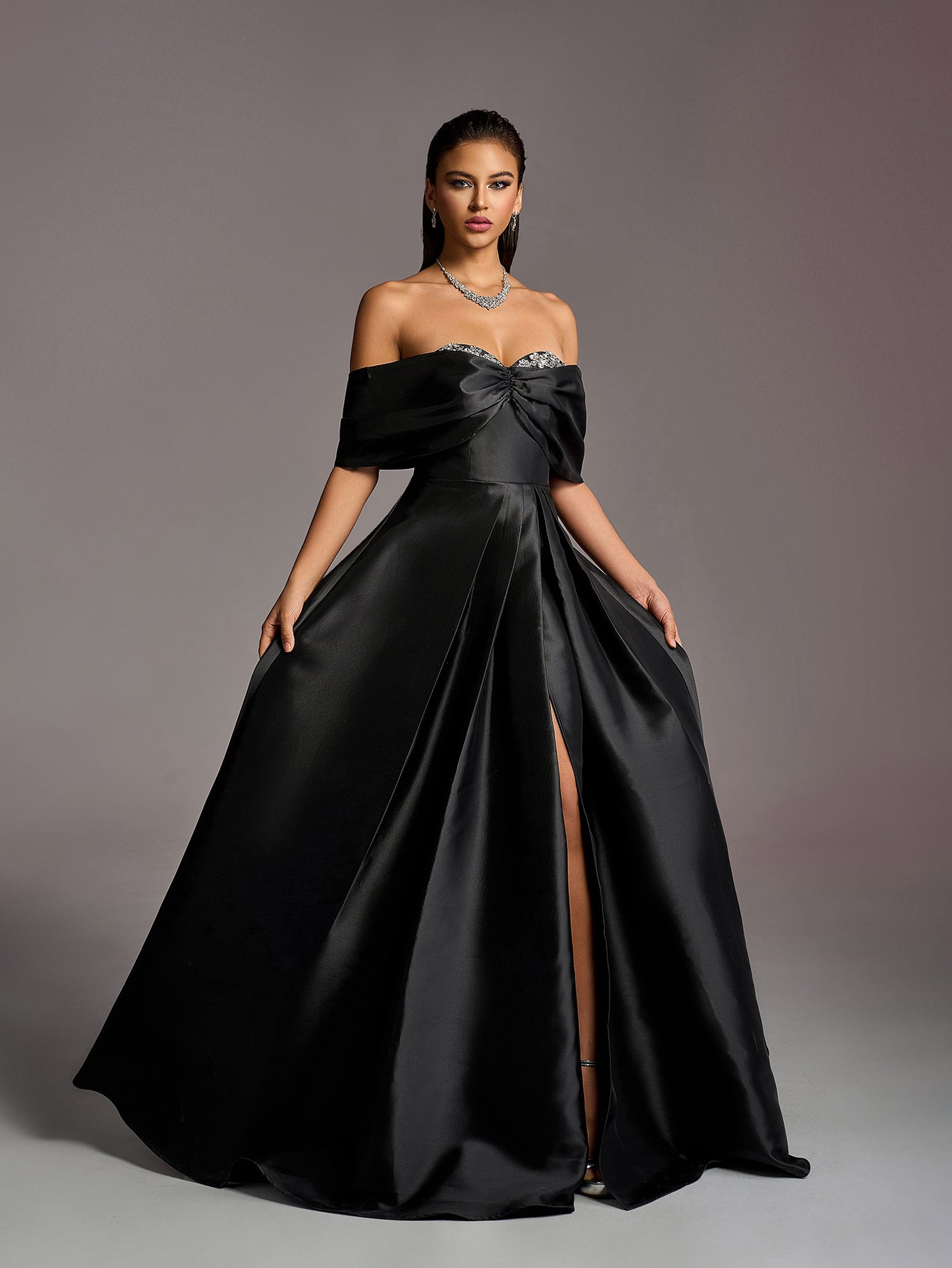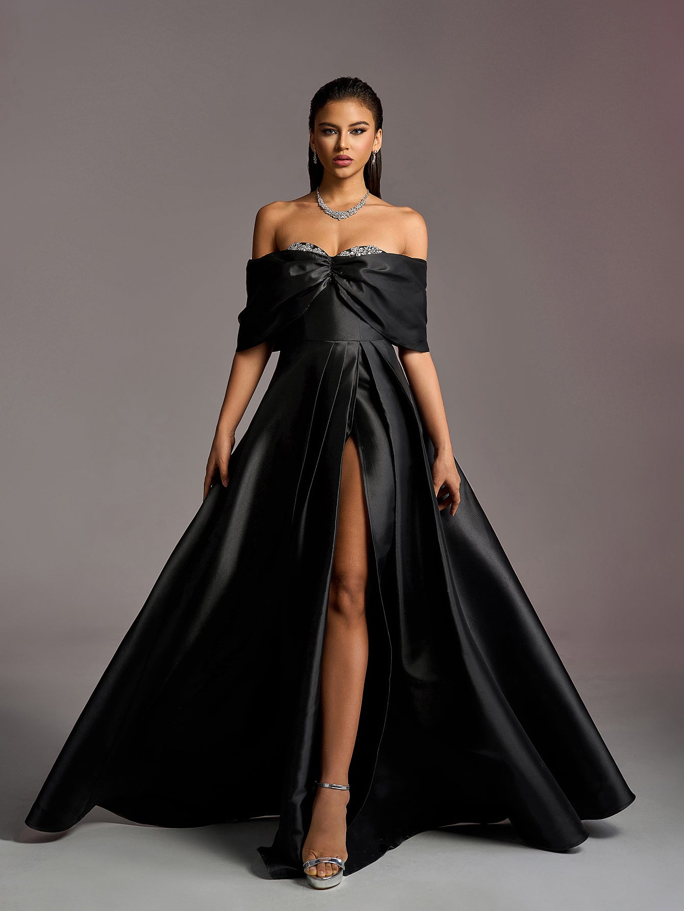 Elevate your evening look with our stunning black satin gown, perfect for any formal occasion. The gown features an off-shoulder neckline that exudes elegance and sophistication, paired with a dramatic bow detail at the bust. The full, floor-sweeping skirt offers a regal silhouette, accentuated by a high slit that adds a touch of allure.