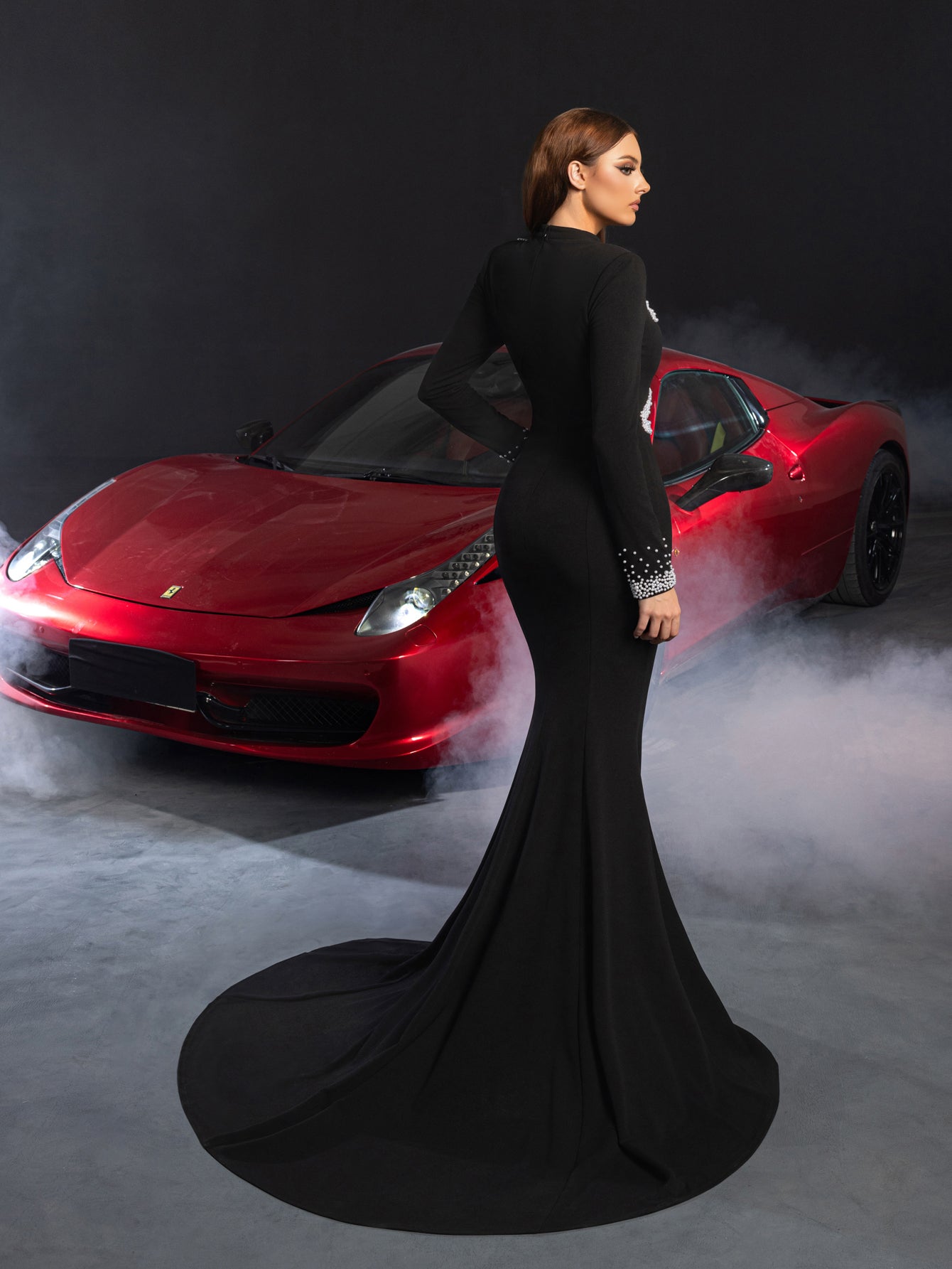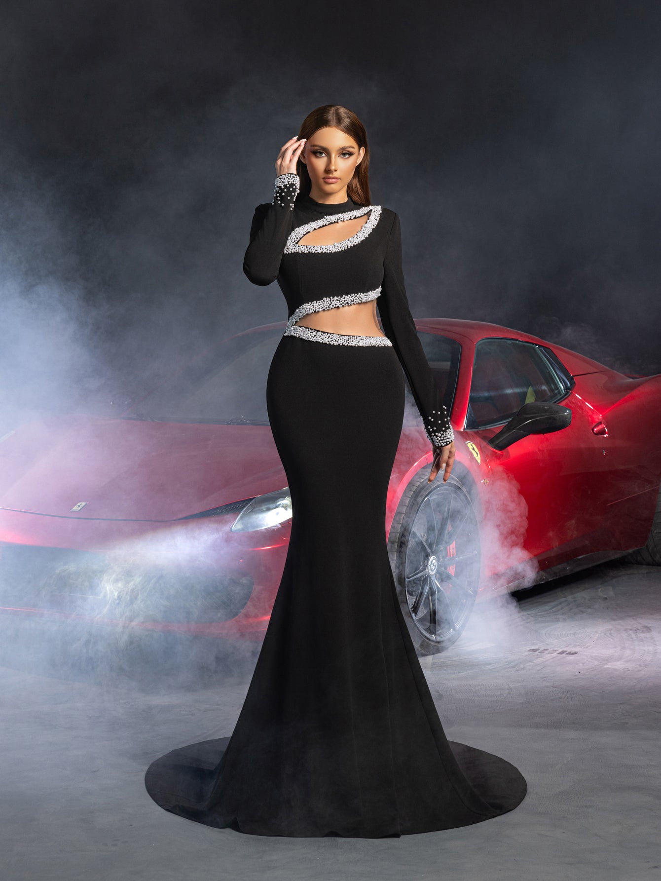 Elevate your evening look with our stunning black evening gown, perfect for making a statement at any formal event. The gown features a unique cut-out neckline adorned with intricate beading, complementing the long sleeves that add a touch of sophistication. The form-fitting silhouette flares into a dramatic train, creating an elegant and timeless aesthetic.