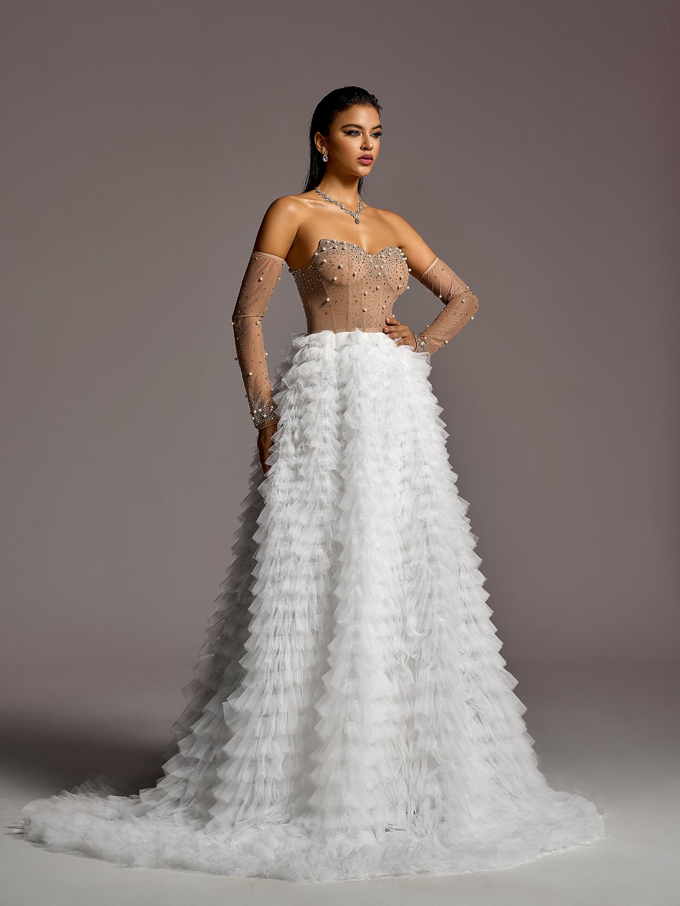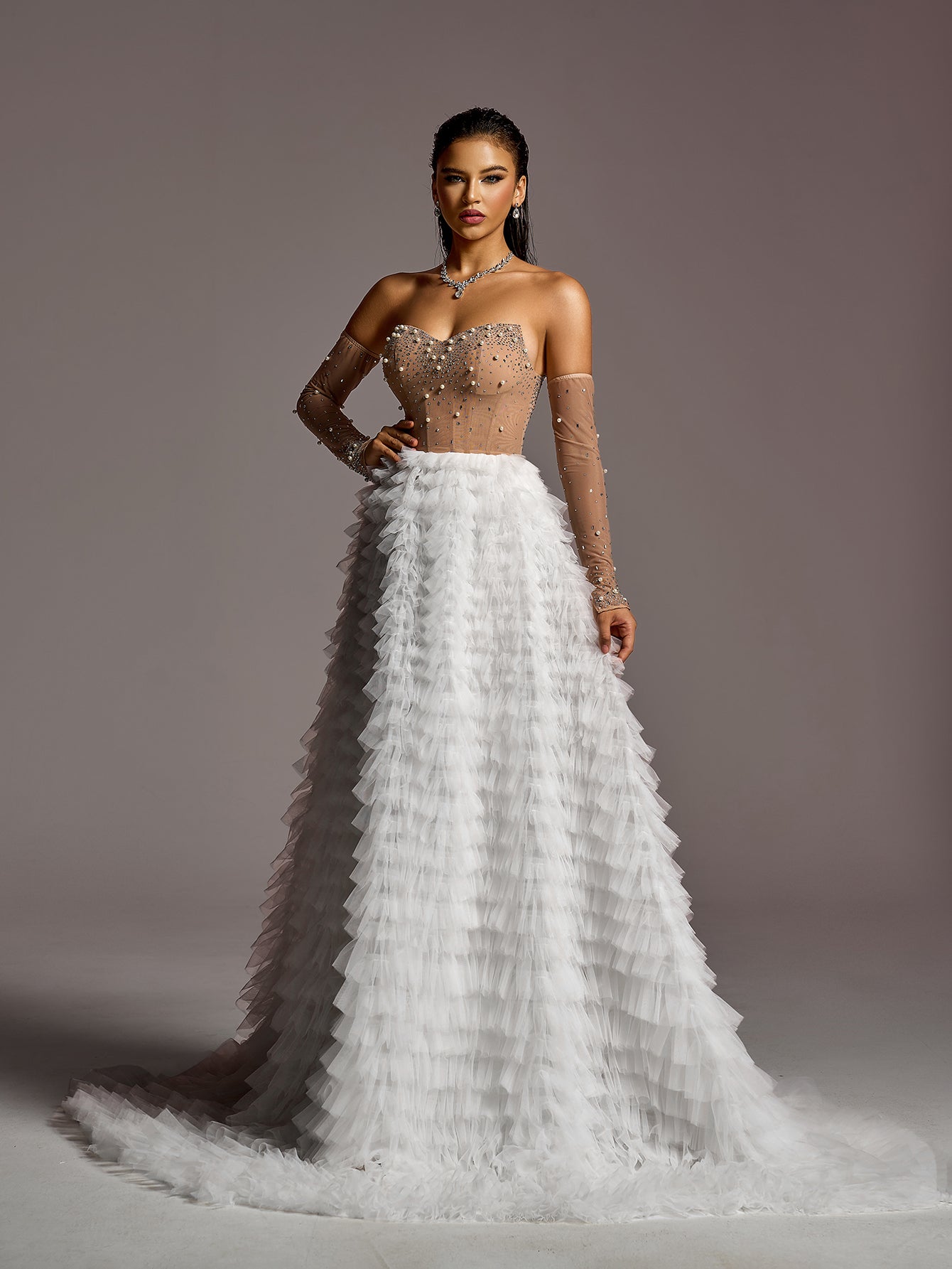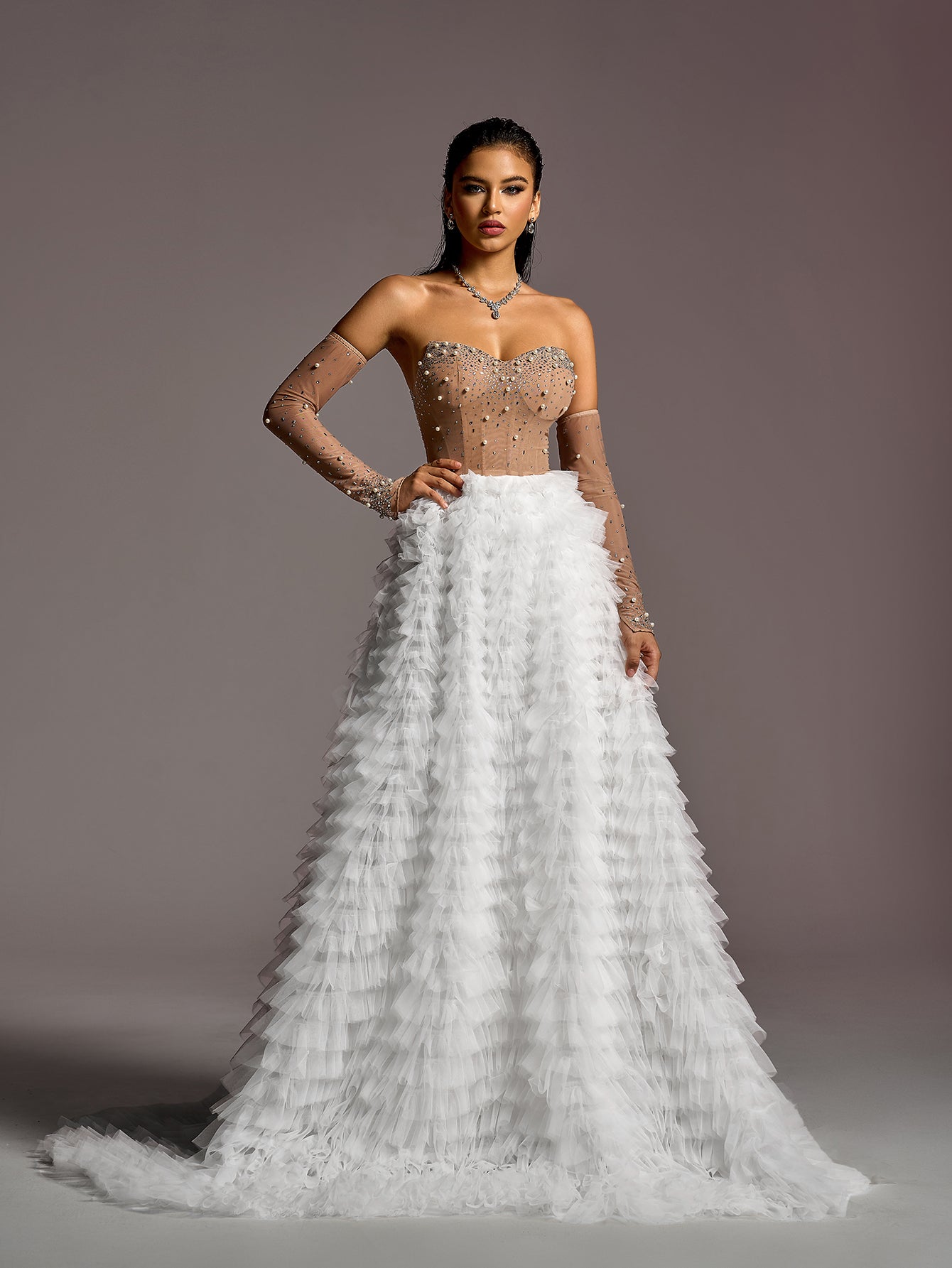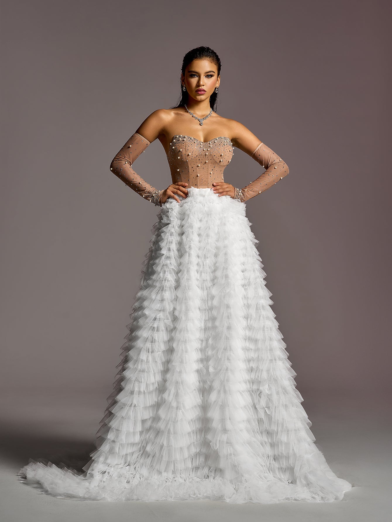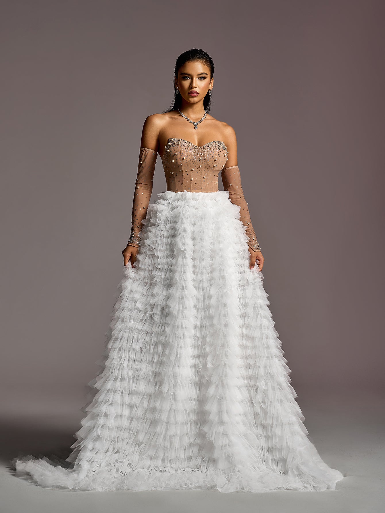 Ethereal Elegance: Our stunning wedding gown is crafted to make you feel like a true princess on your special day. The gown showcases a strapless sweetheart neckline that accentuates your décolletage, while the fitted bodice hugs your figure in all the right places. The intricate beadwork adorns the bodice, adding a touch of glamour and sophistication. The full, ruffled skirt cascades into a dramatic train, creating a breathtaking silhouette that turns heads.