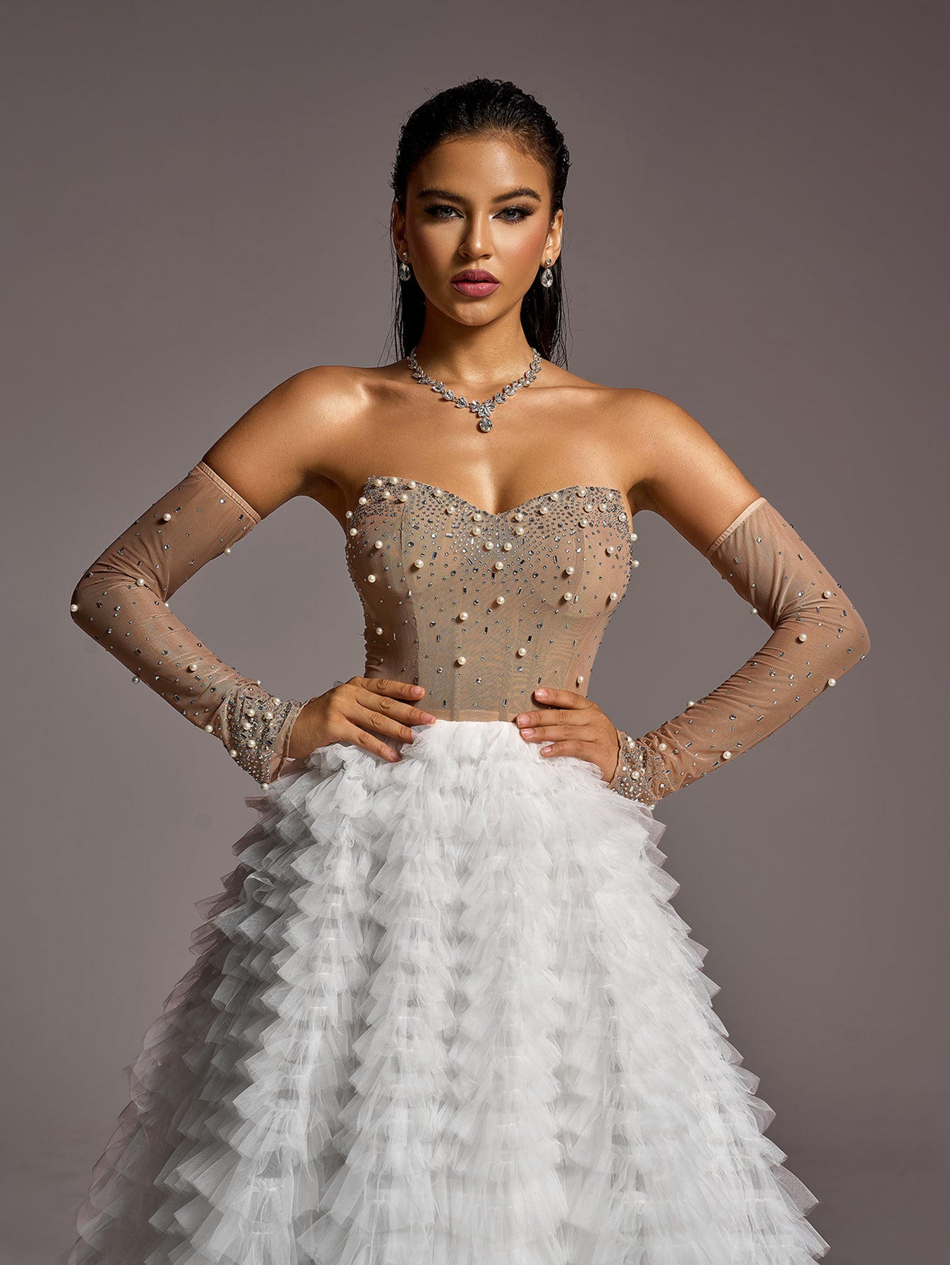 Gorgeous Pearl & Rhinestone Embellished Bodice Ruffle Layered Hem Wedding Dress