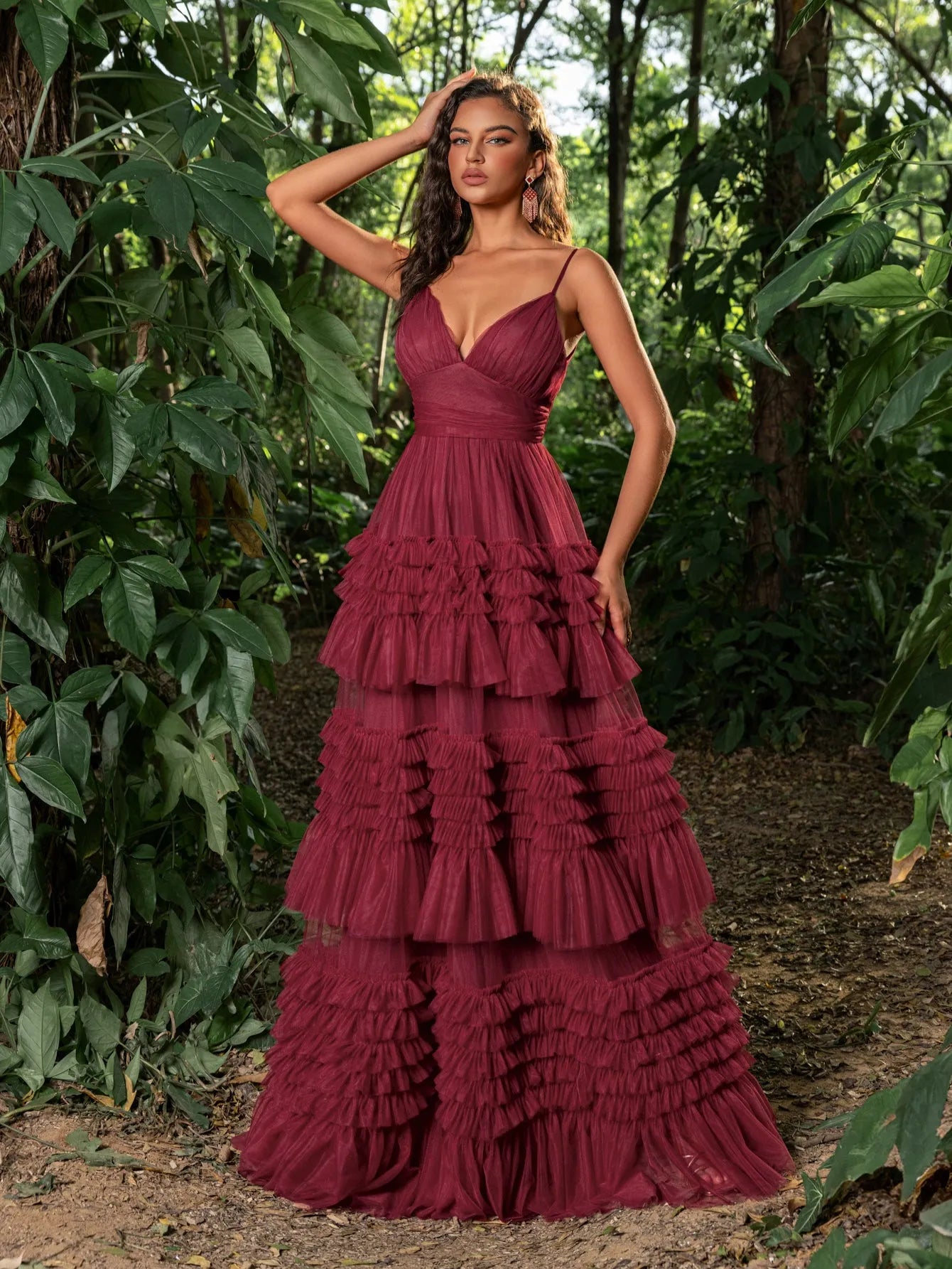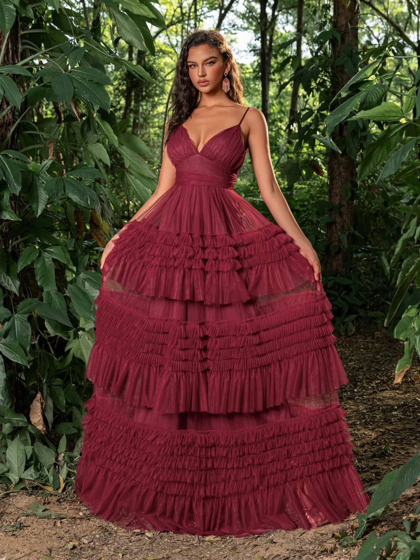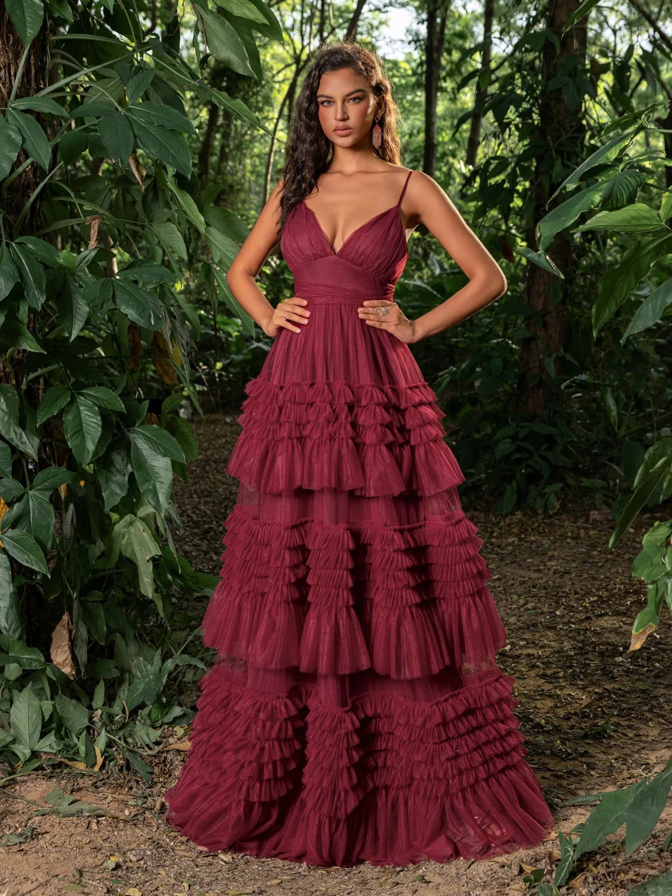 Make a bold statement with this tiered tulle gown. This captivating dress features a deep V-neckline and delicate spaghetti straps, creating a graceful and sophisticated look. The fitted bodice accentuates your curves, leading into a dramatic, multi-tiered tulle skirt that exudes elegance and charm. Perfect for making a grand entrance at any event, this gown is designed to highlight your beauty and poise. Whether it's for a wedding, gala, or any special occasion, this gown ensures you will be the center of attention.