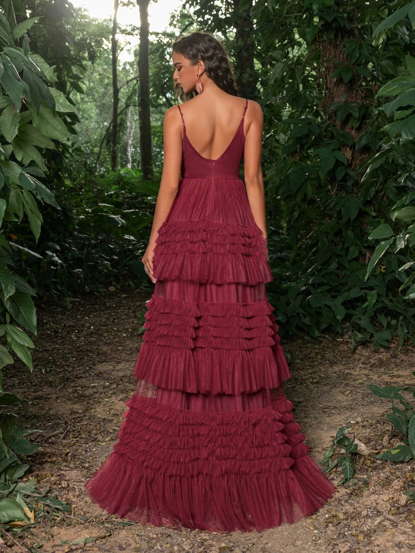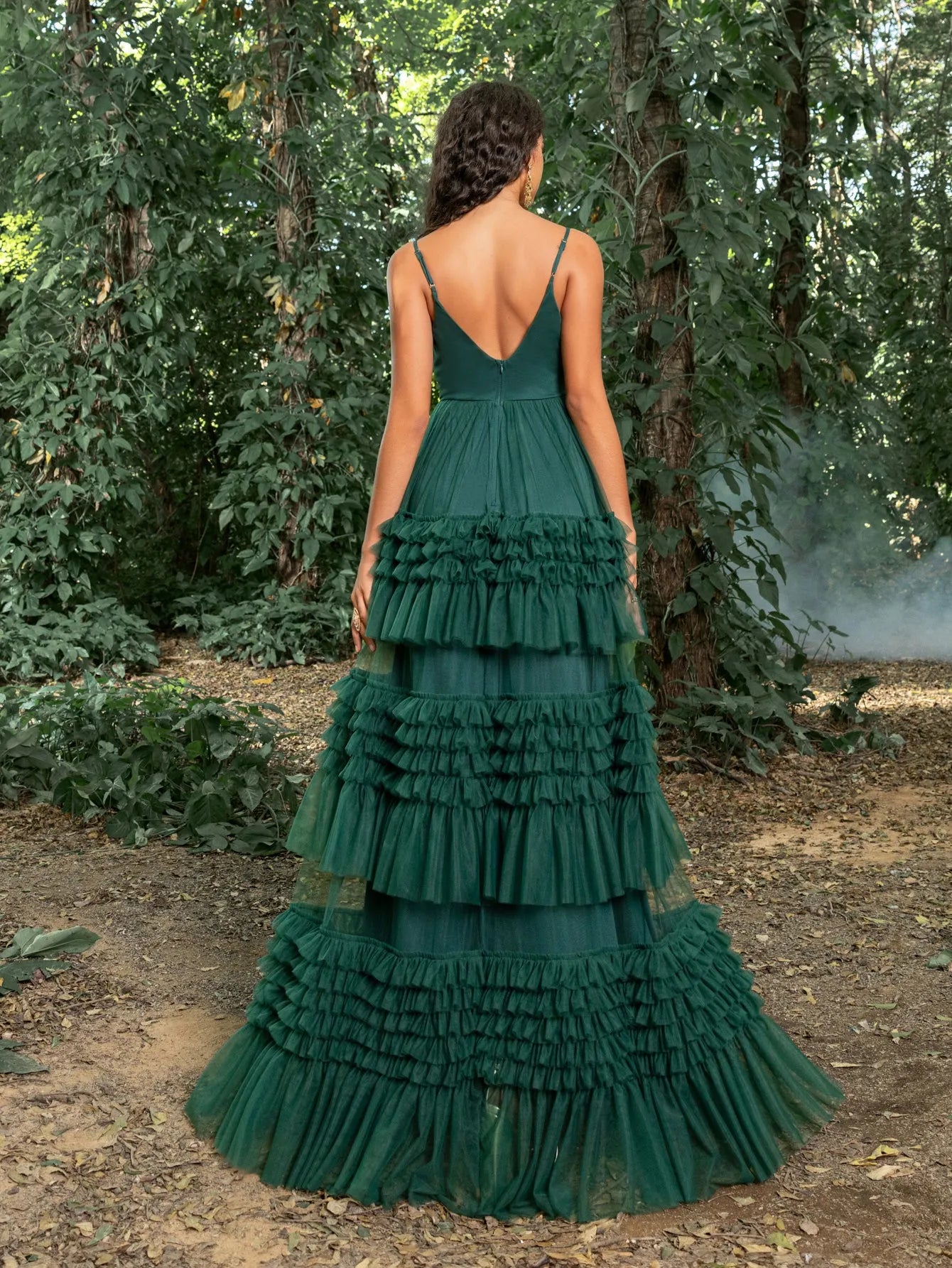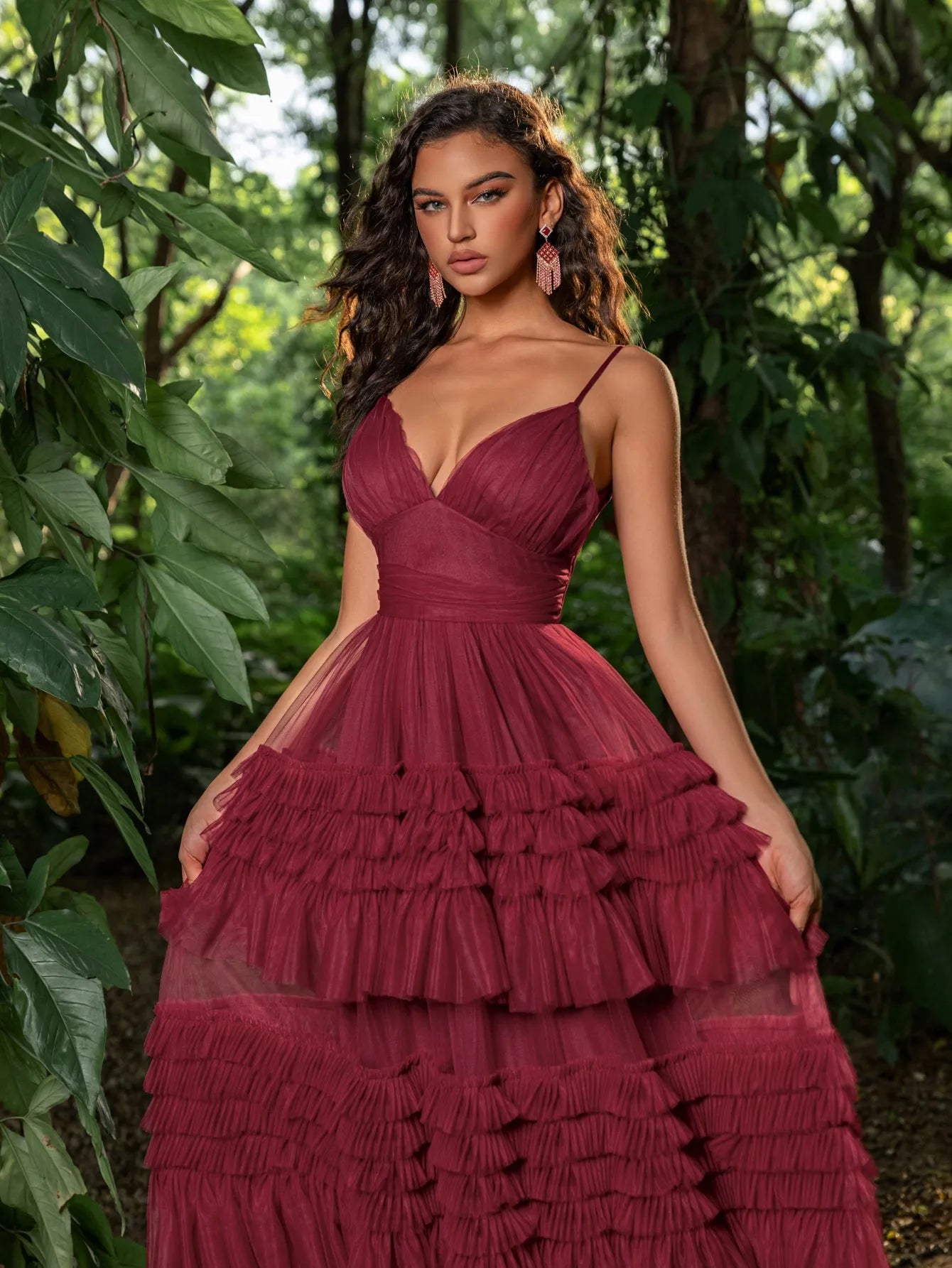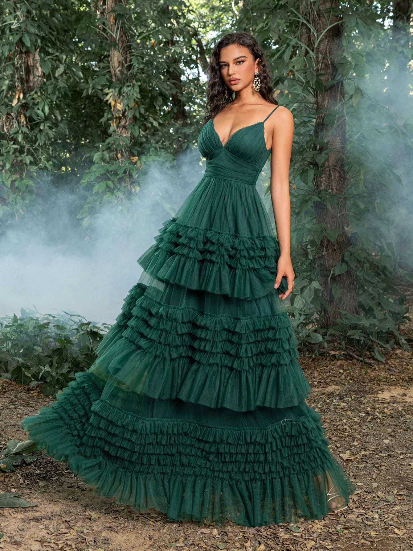 Make a bold statement with this tiered tulle gown. This captivating dress features a deep V-neckline and delicate spaghetti straps, creating a graceful and sophisticated look. The fitted bodice accentuates your curves, leading into a dramatic, multi-tiered tulle skirt that exudes elegance and charm. Perfect for making a grand entrance at any event, this gown is designed to highlight your beauty and poise. Whether it's for a wedding, gala, or any special occasion, this gown ensures you will be the center of attention.