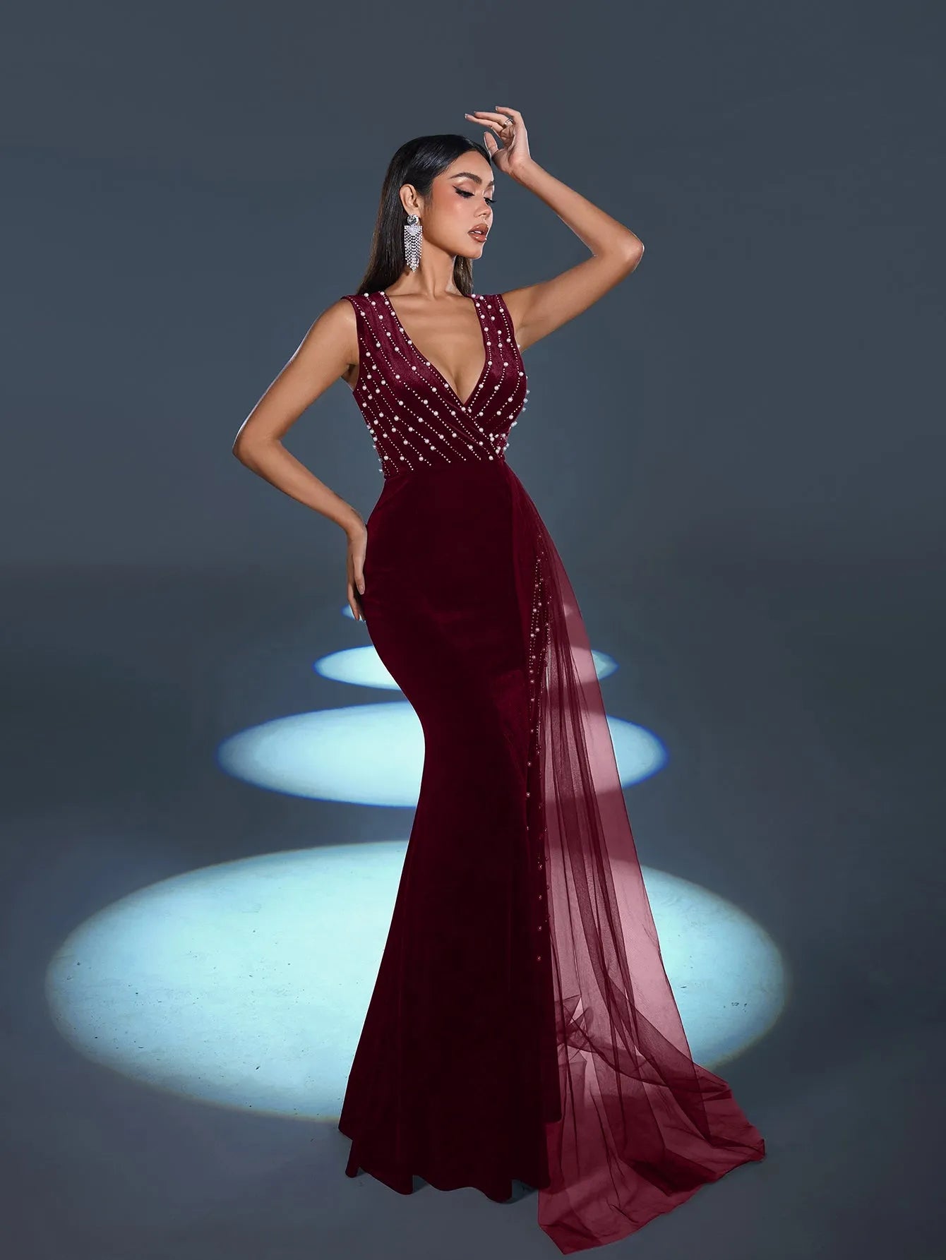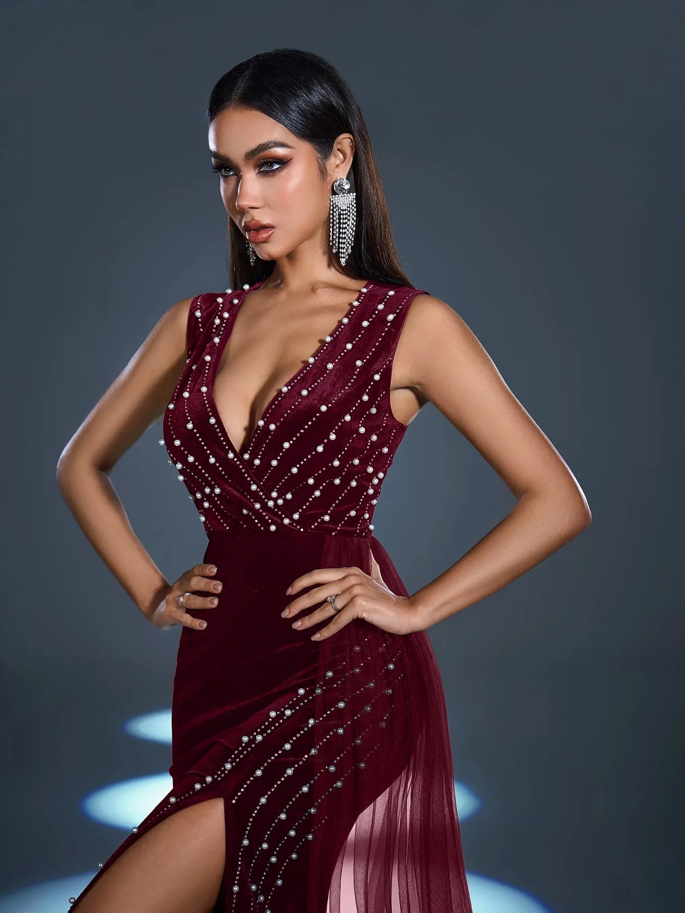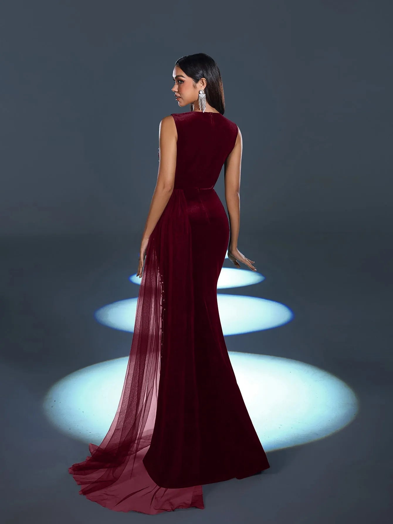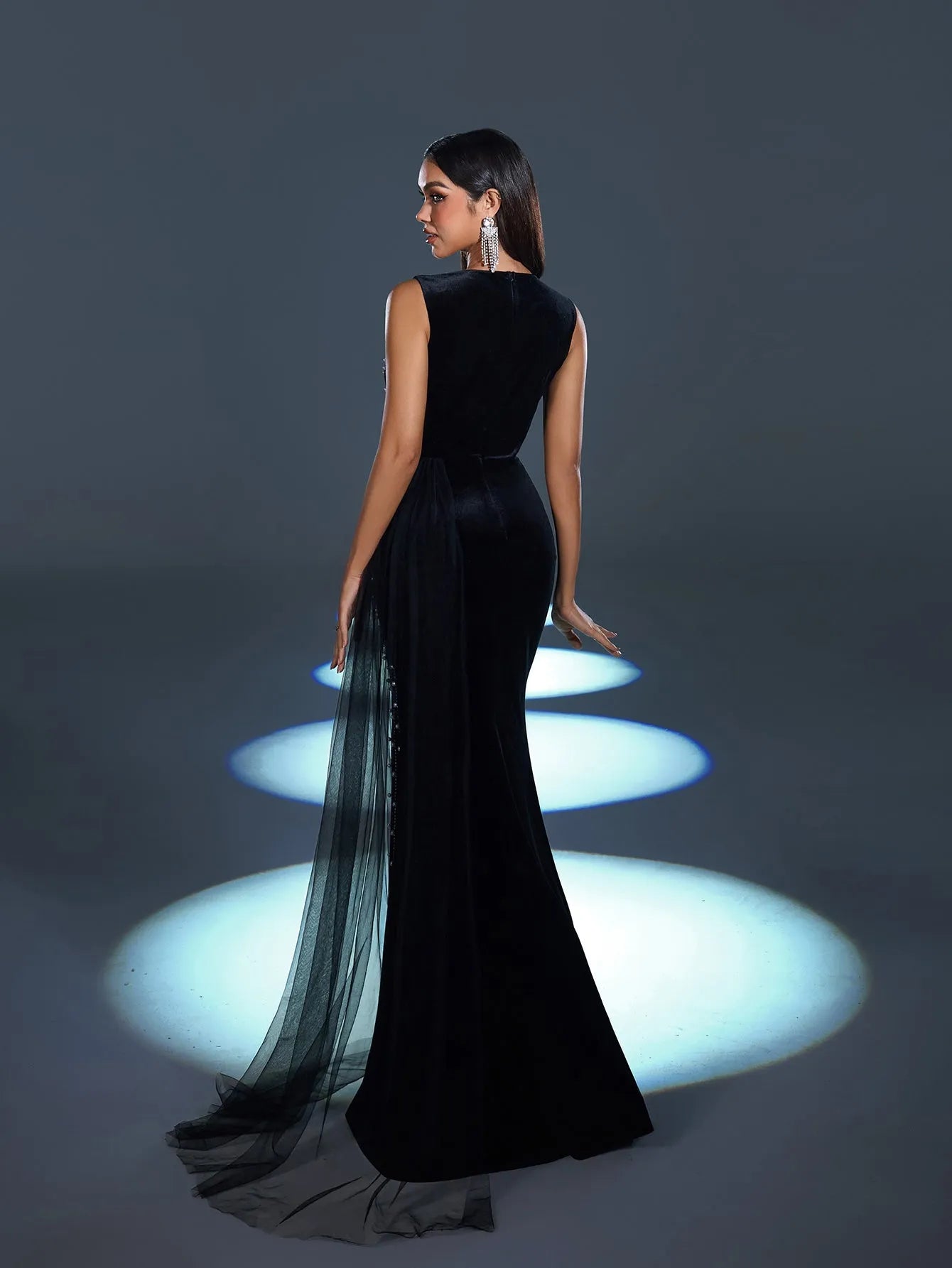 Command attention and embody sophistication in this enchanting gown, where the elegance of velvet meets the brilliance of rhinestones for an unforgettable ensemble. Perfect for those who love to make a refined statement.