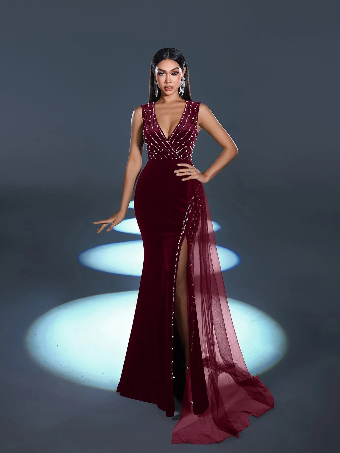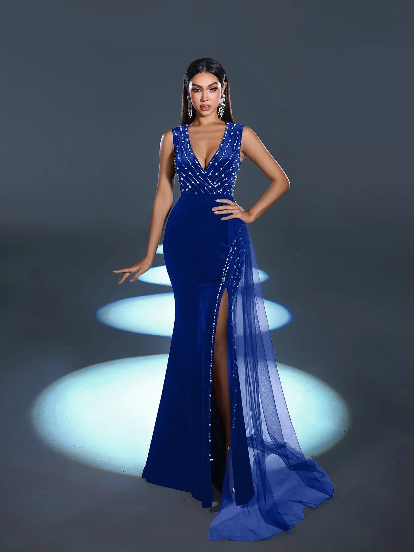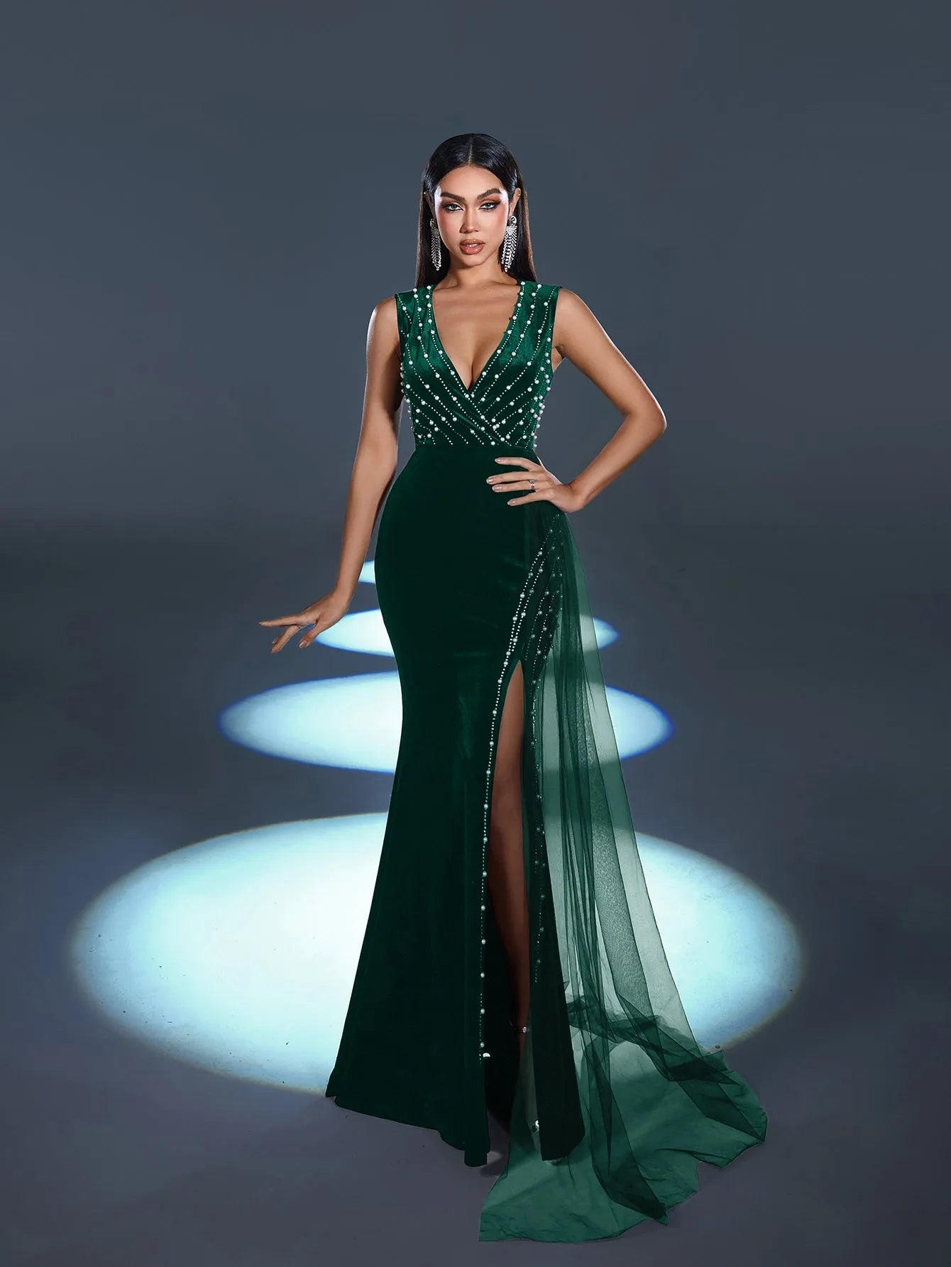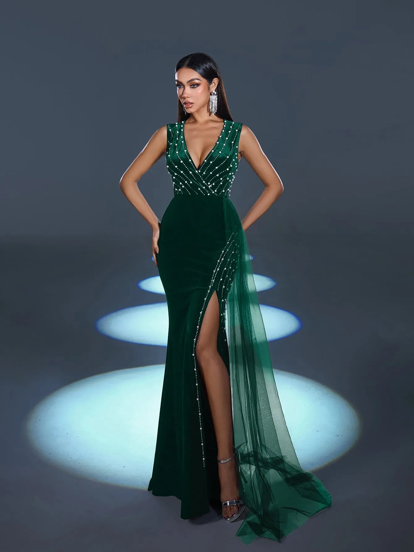 Step into elegance with this captivating evening gown, a stunning creation designed to exude refined glamour. This gown features a luxurious velvet base adorned with sparkling rhinestones that cascade down the bodice, creating a mesmerizing pattern that catches the light beautifully. The dress boasts a daring V-neckline and a thigh-high slit, adding an alluring touch to its classic silhouette. The flowing sheer overlay drapes from the waist, lending a graceful movement that follows your every step.