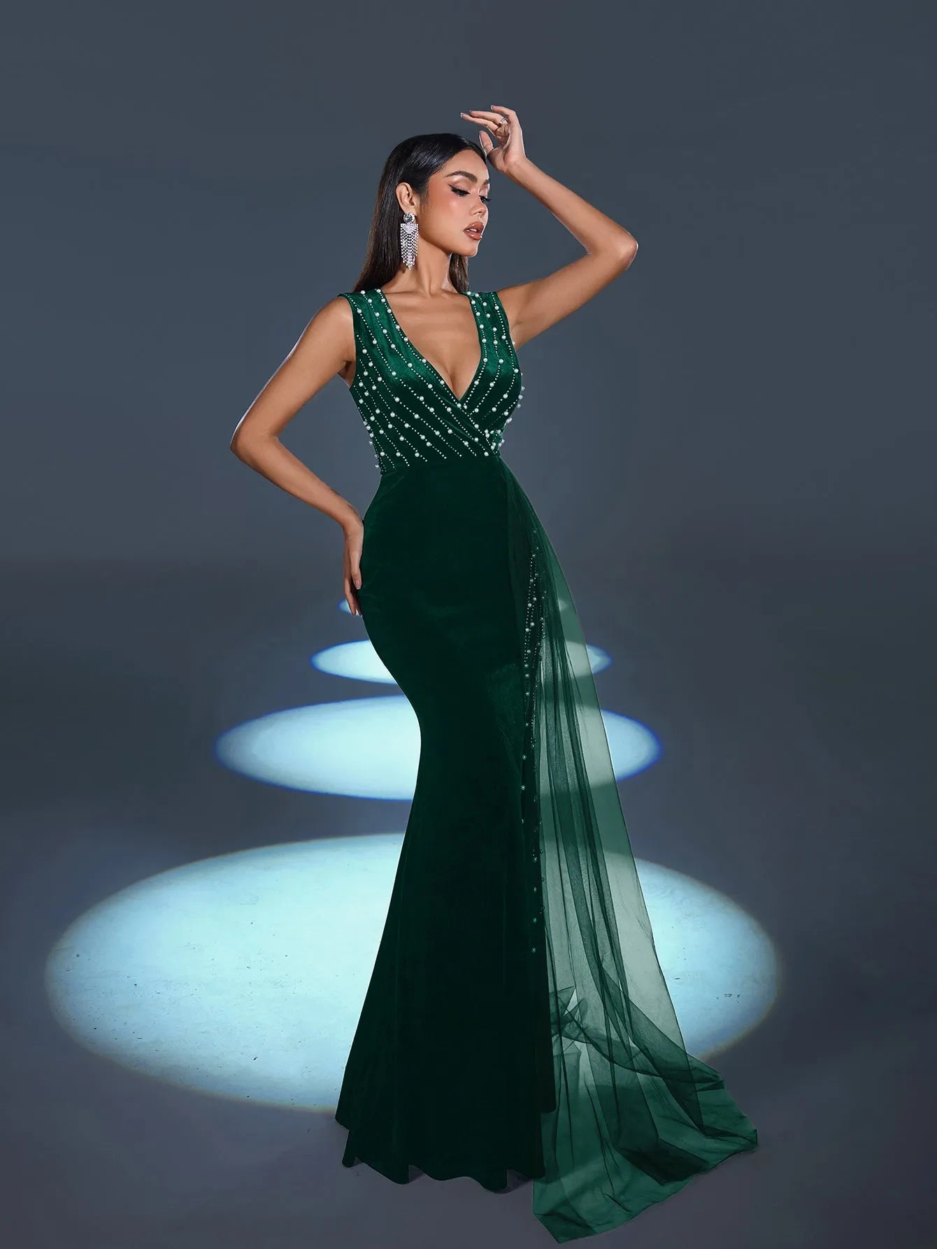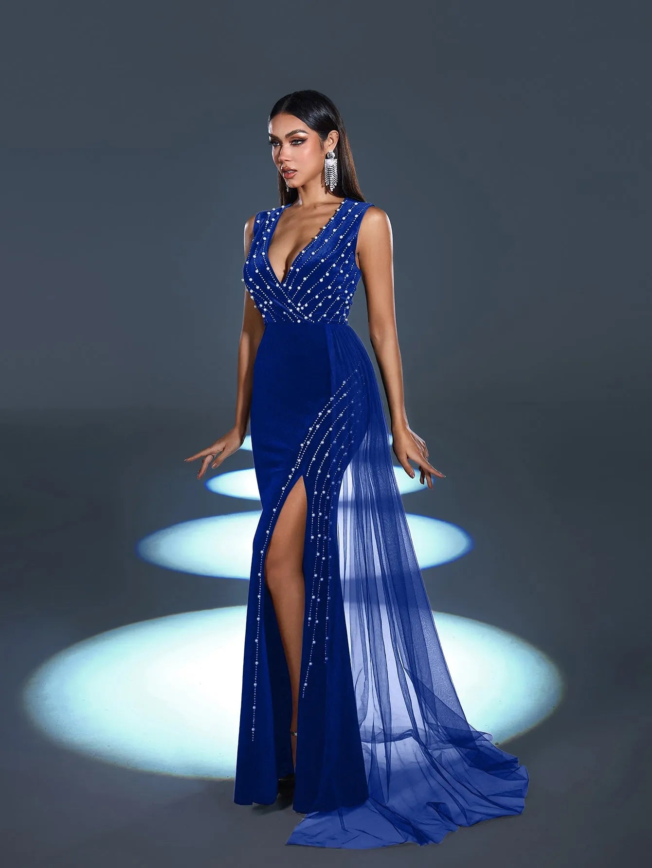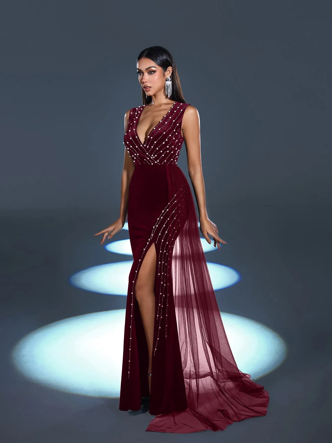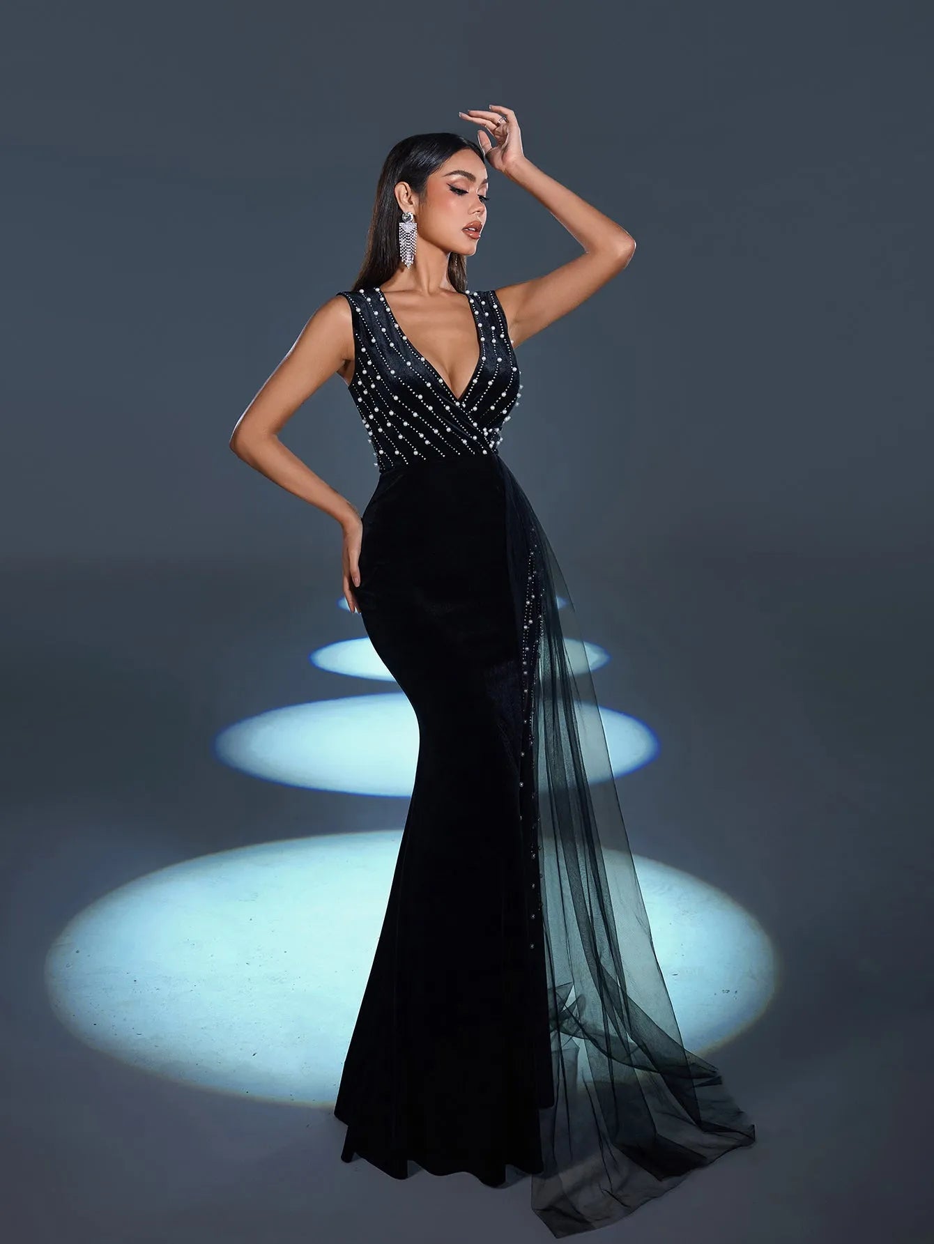 Step into elegance with this captivating evening gown, a stunning creation designed to exude refined glamour. This gown features a luxurious velvet base adorned with sparkling rhinestones that cascade down the bodice, creating a mesmerizing pattern that catches the light beautifully. The dress boasts a daring V-neckline and a thigh-high slit, adding an alluring touch to its classic silhouette. The flowing sheer overlay drapes from the waist, lending a graceful movement that follows your every step.