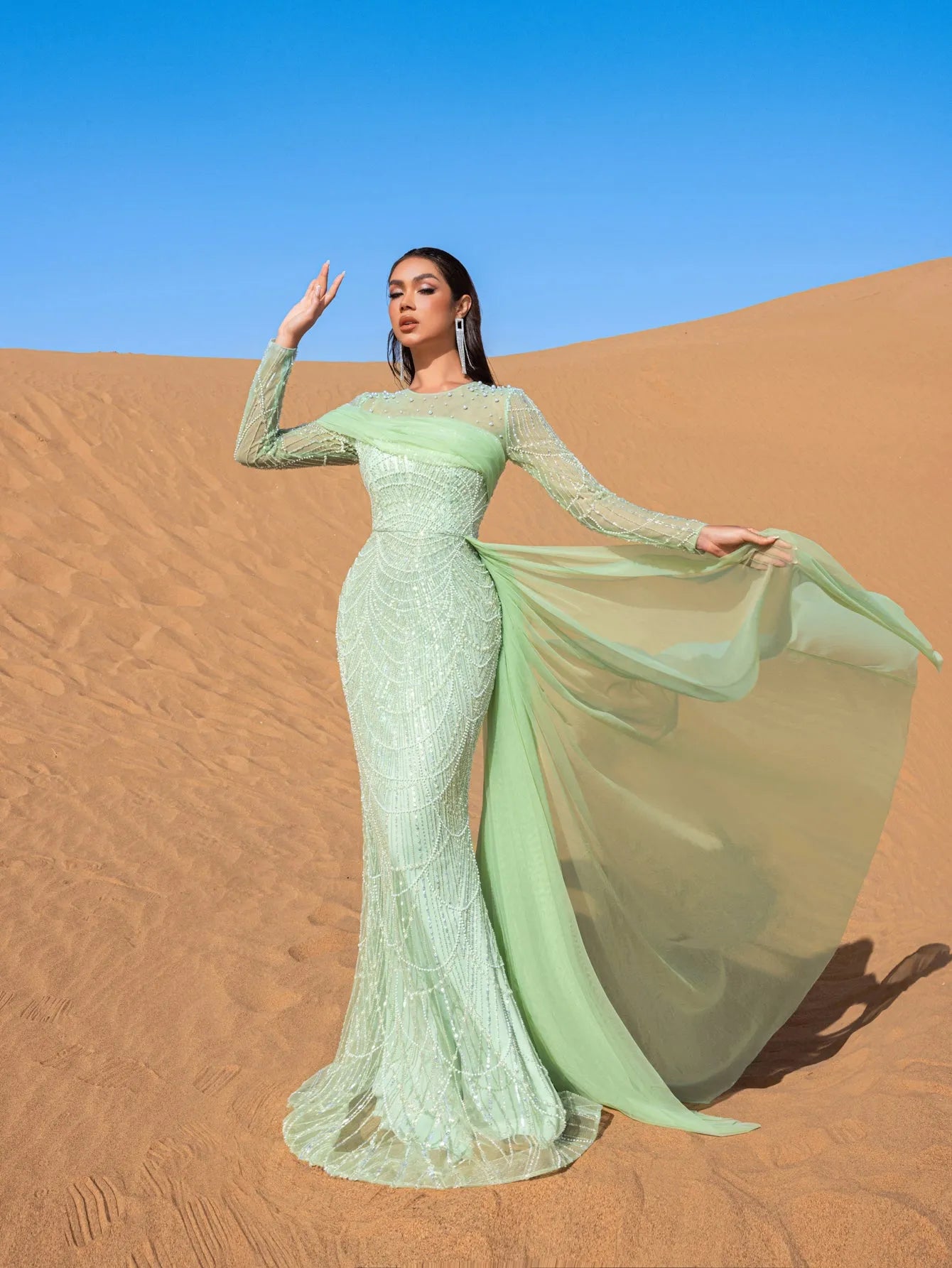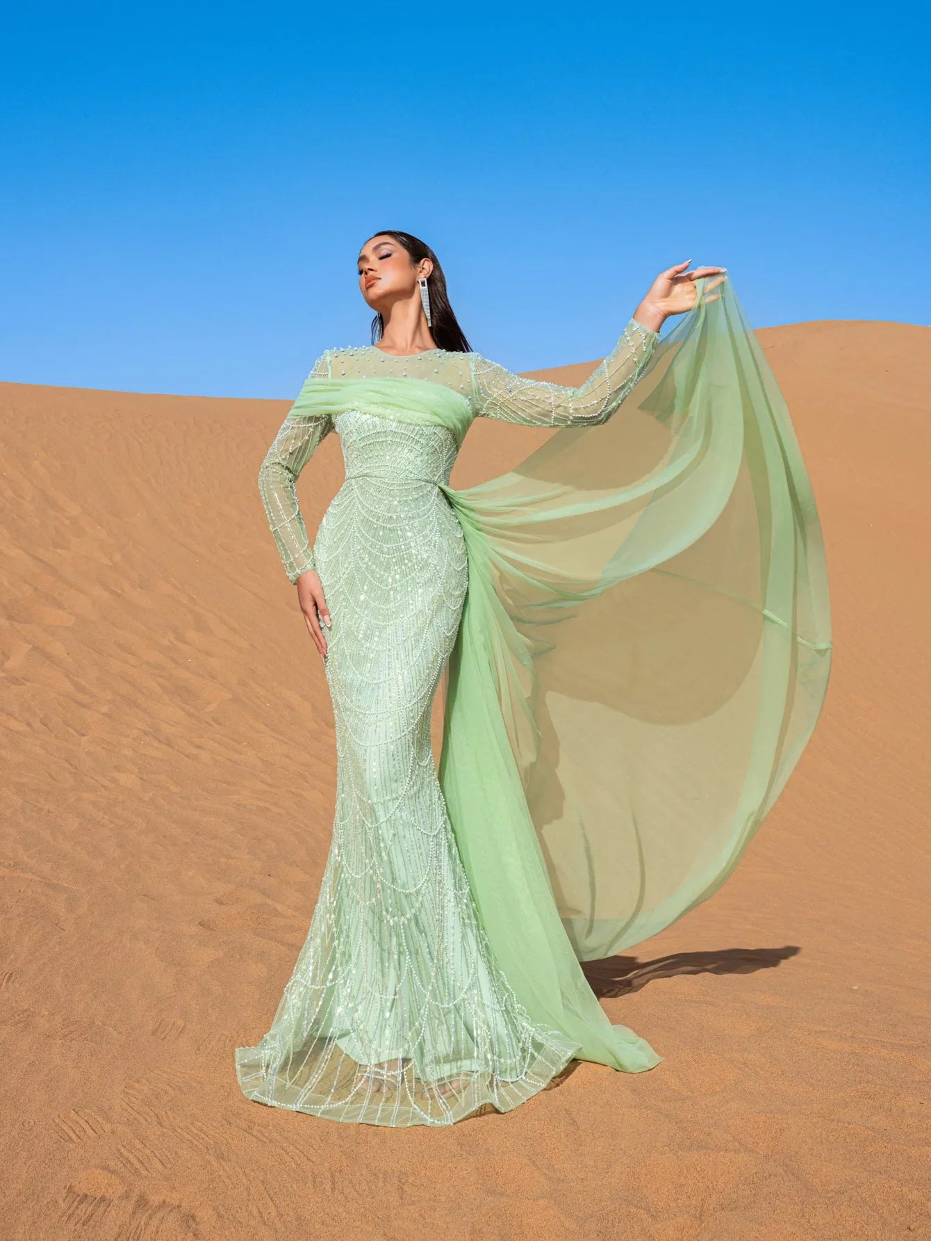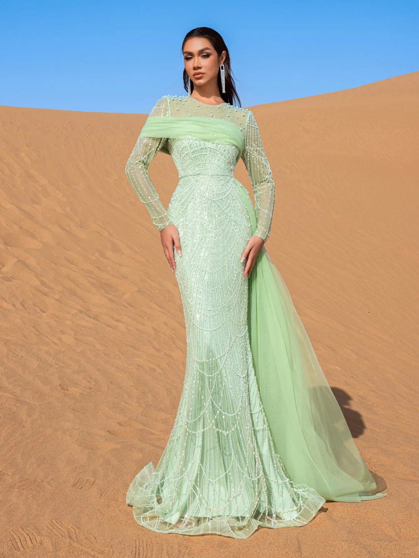 Embrace the essence of refined elegance in this captivating mint green evening gown, crafted to make a lasting impression. The gown is adorned with shimmering bead and sequin embellishments that create a delicate cascading pattern, evoking an aura of sophisticated luxury. The high neckline and long-sleeved silhouette offer a blend of poise and allure, while the fitted bodice flows seamlessly into a mermaid silhouette, celebrating the natural form with grace.