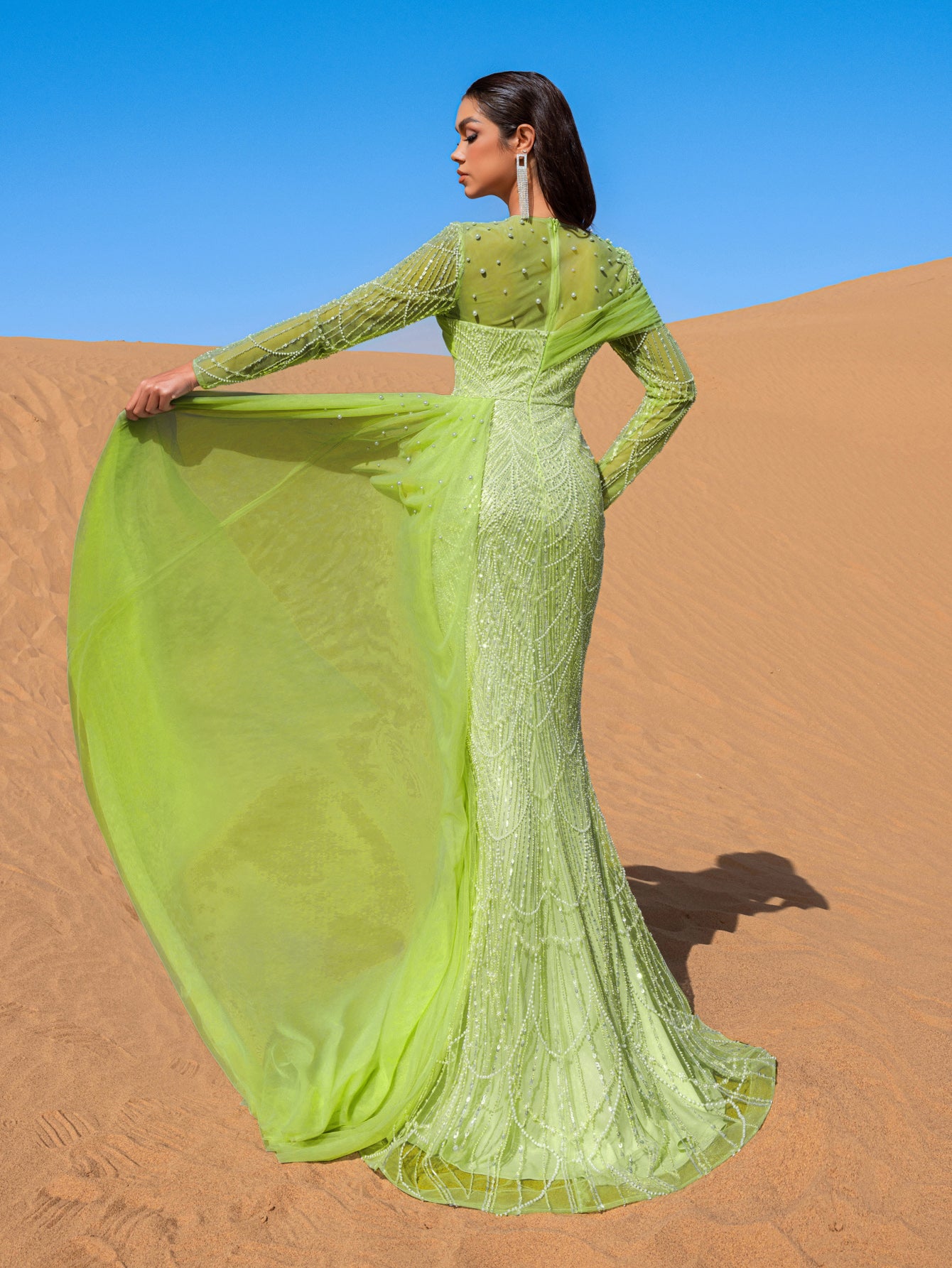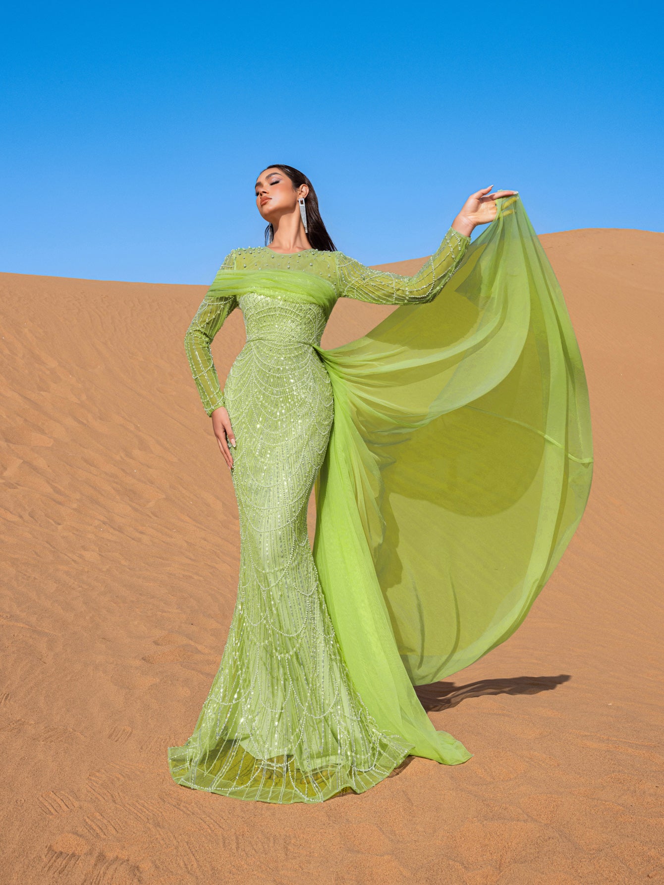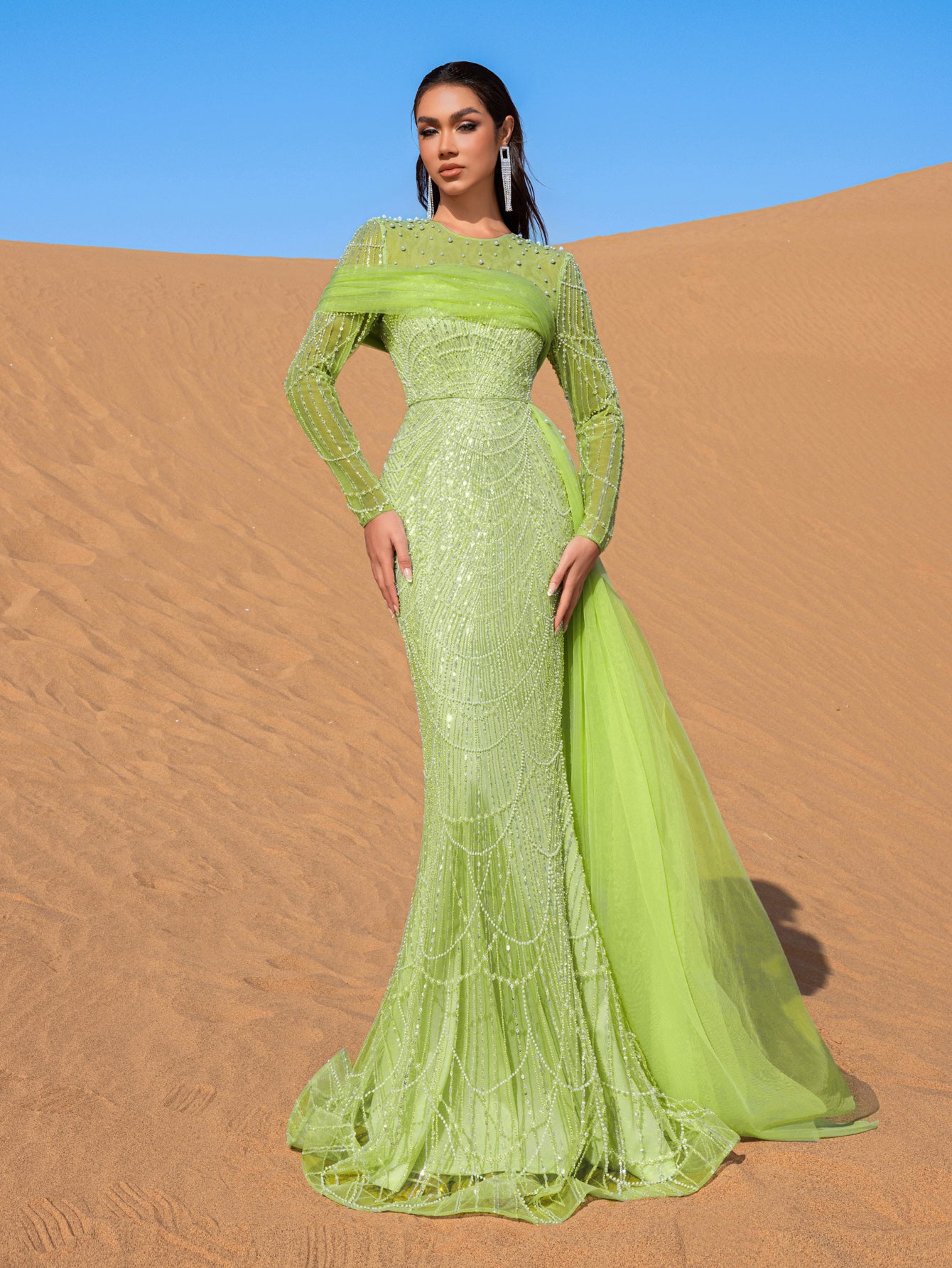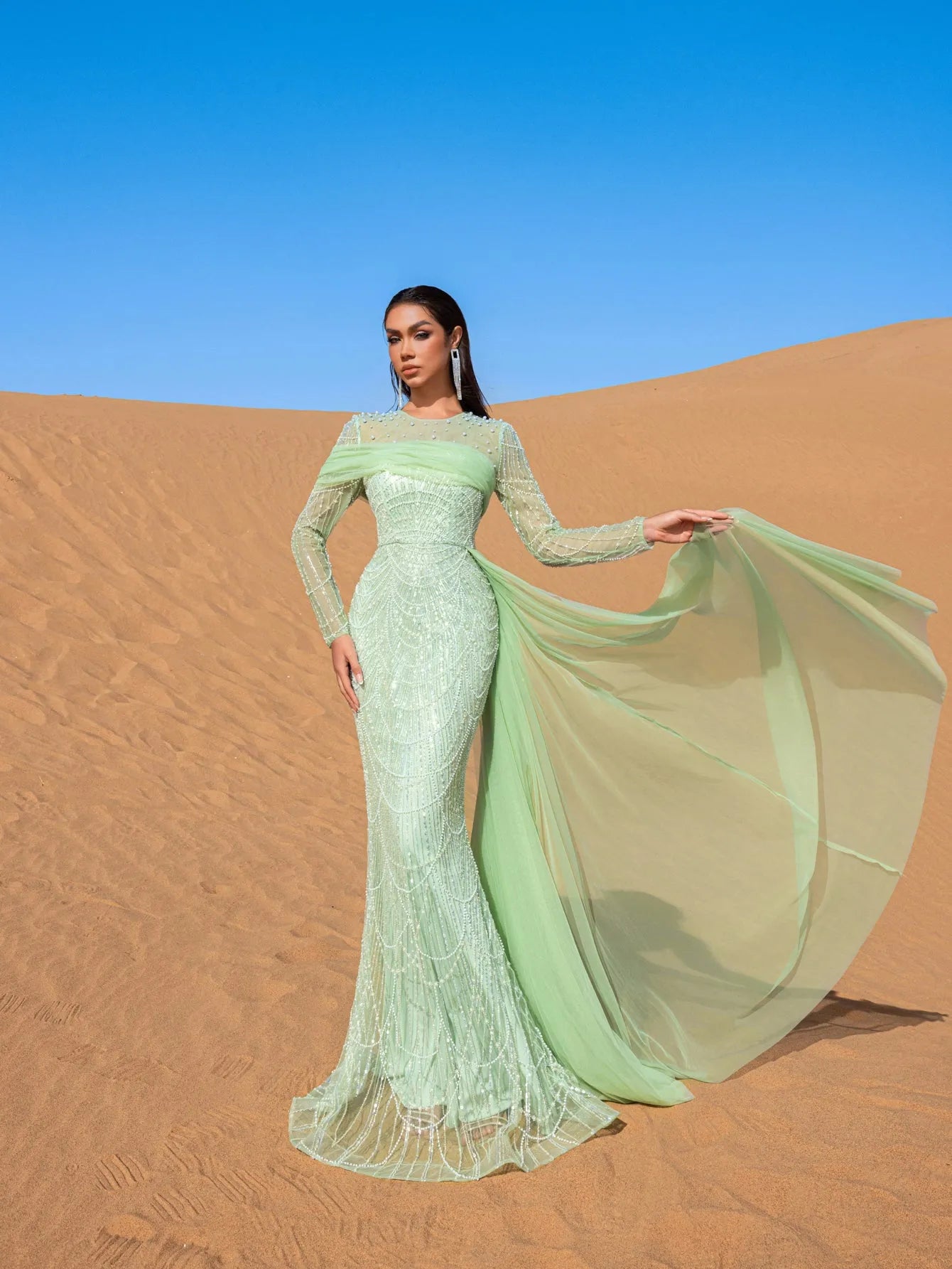 Embrace the essence of refined elegance in this captivating mint green evening gown, crafted to make a lasting impression. The gown is adorned with shimmering bead and sequin embellishments that create a delicate cascading pattern, evoking an aura of sophisticated luxury. The high neckline and long-sleeved silhouette offer a blend of poise and allure, while the fitted bodice flows seamlessly into a mermaid silhouette, celebrating the natural form with grace.