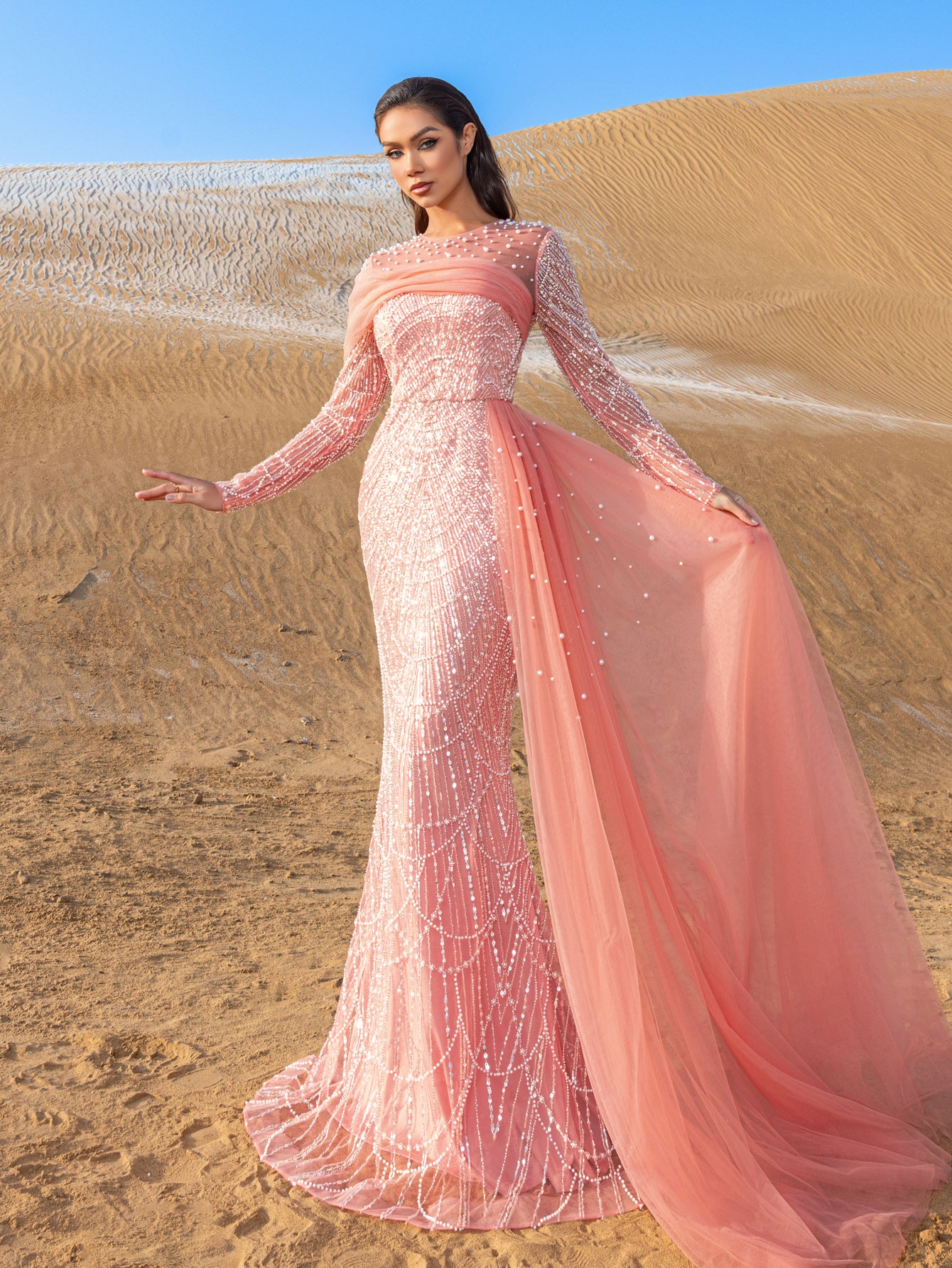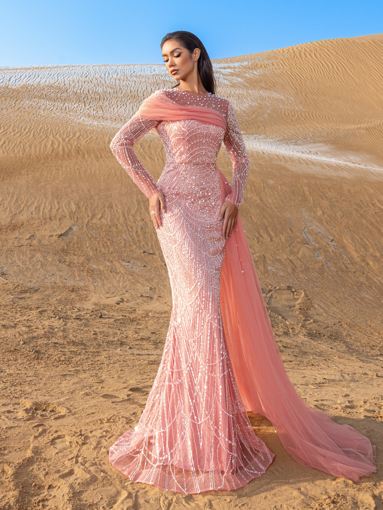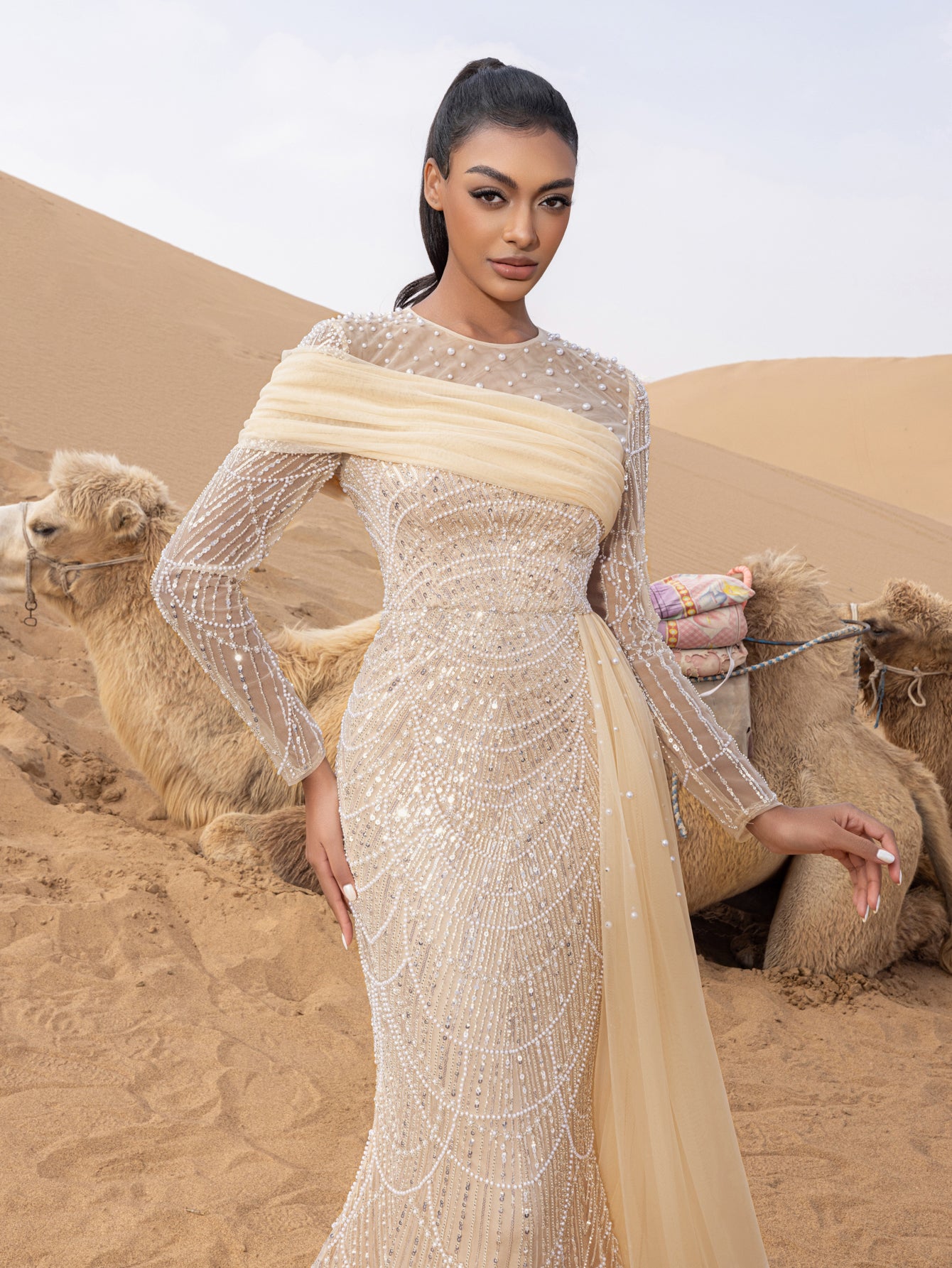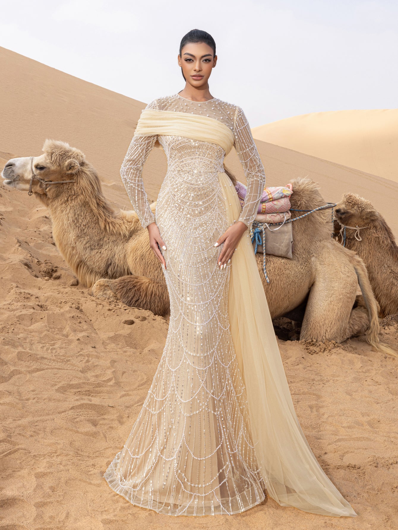 Capture attention and leave an impression in this exquisite gown, crafted for those who appreciate the finer details of glamour and luxury.