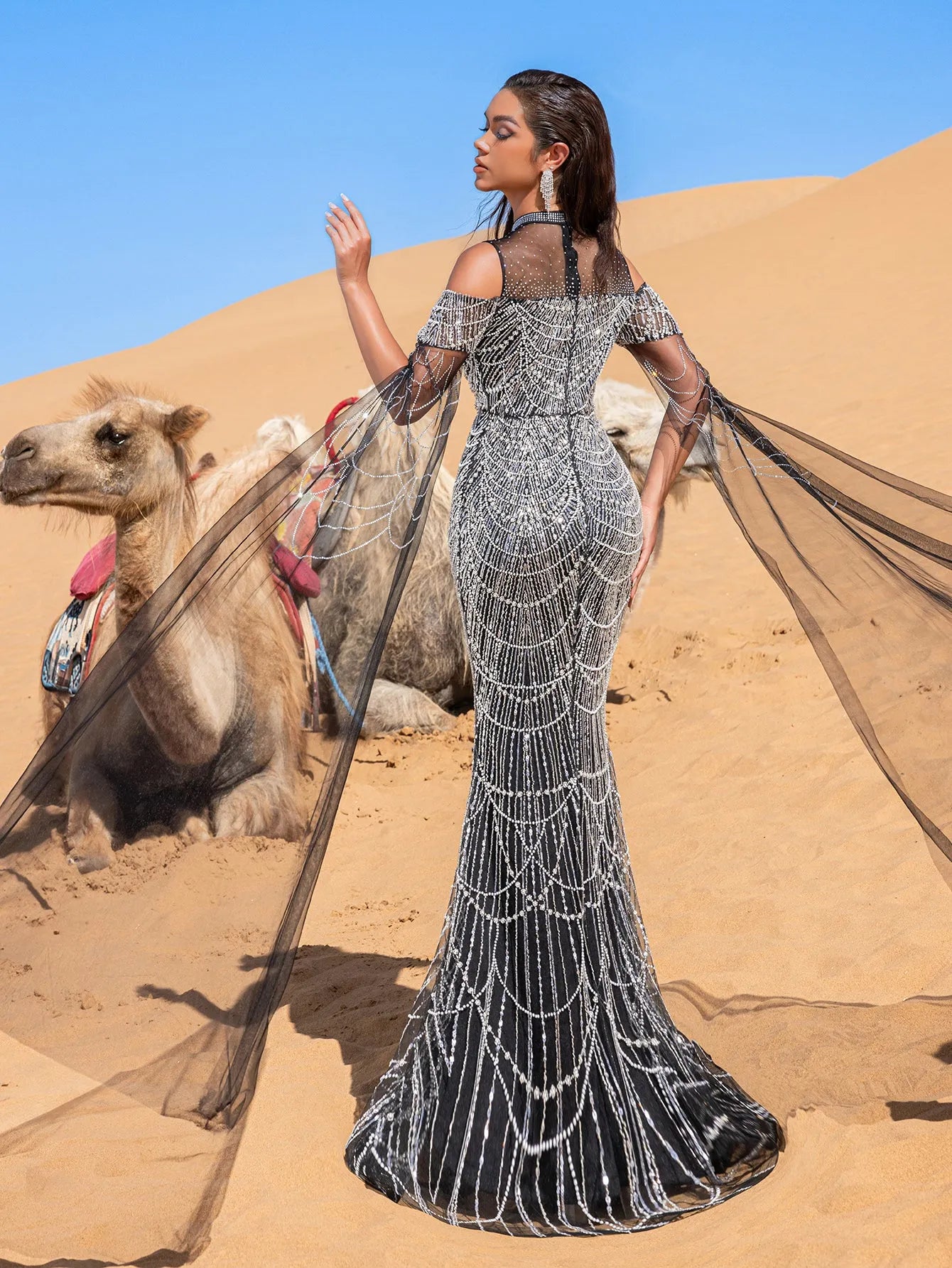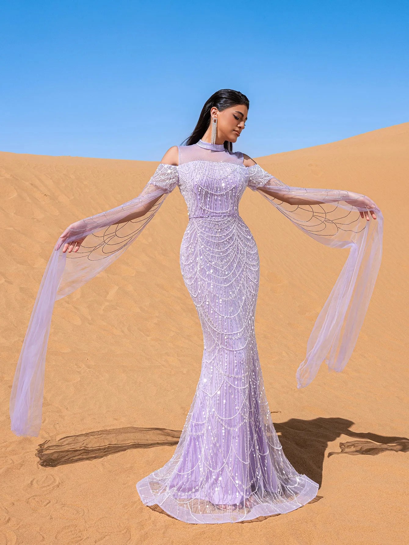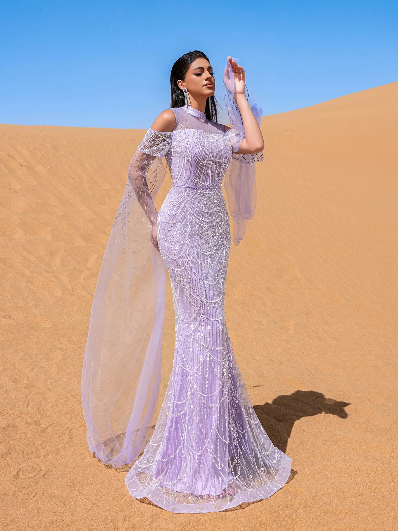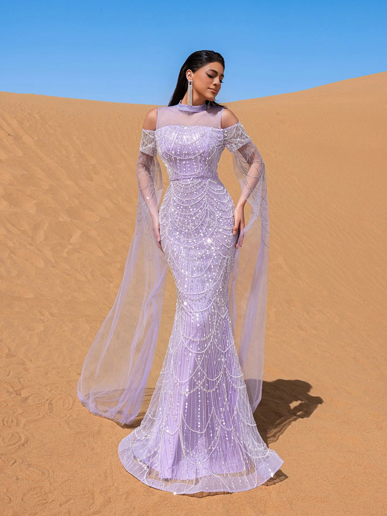 Step into elegance with this ethereal evening gown, designed to capture the essence of grace and sophistication. This gown is meticulously adorned with intricate beadwork and shimmering sequin patterns that cascade down the fitted silhouette, creating a delicate, draped effect reminiscent of falling stars. The high illusion neckline and cold-shoulder cut add a modern twist, while the sheer, flowing cape sleeves bring an enchanting touch, moving gracefully with each step.