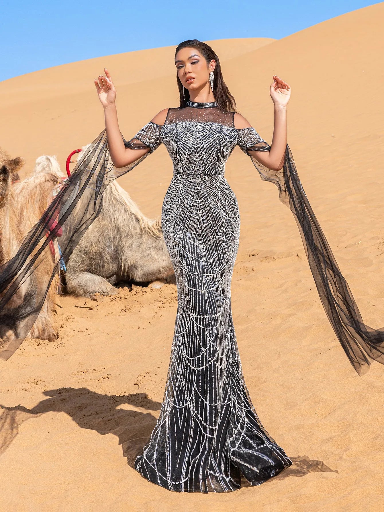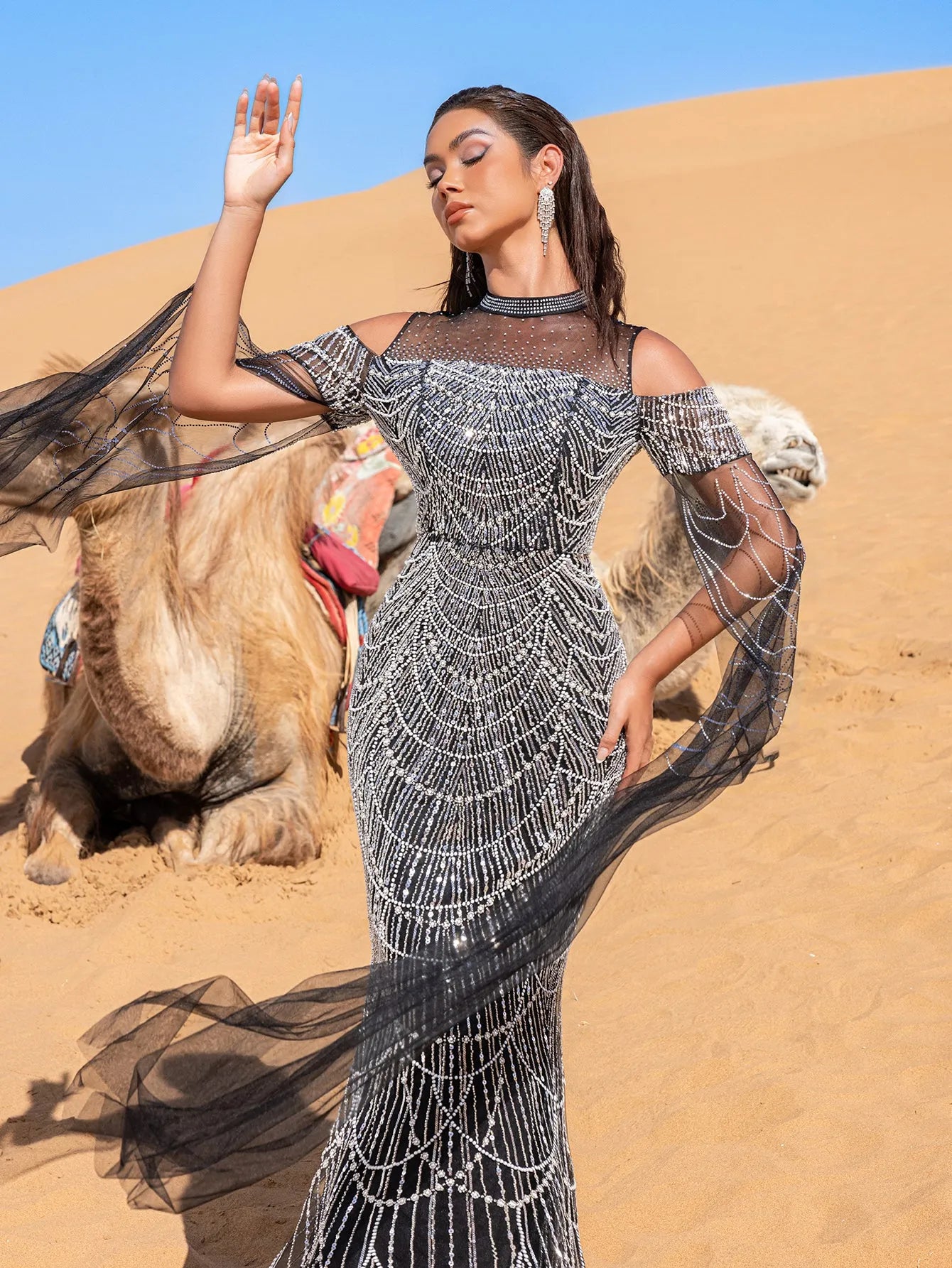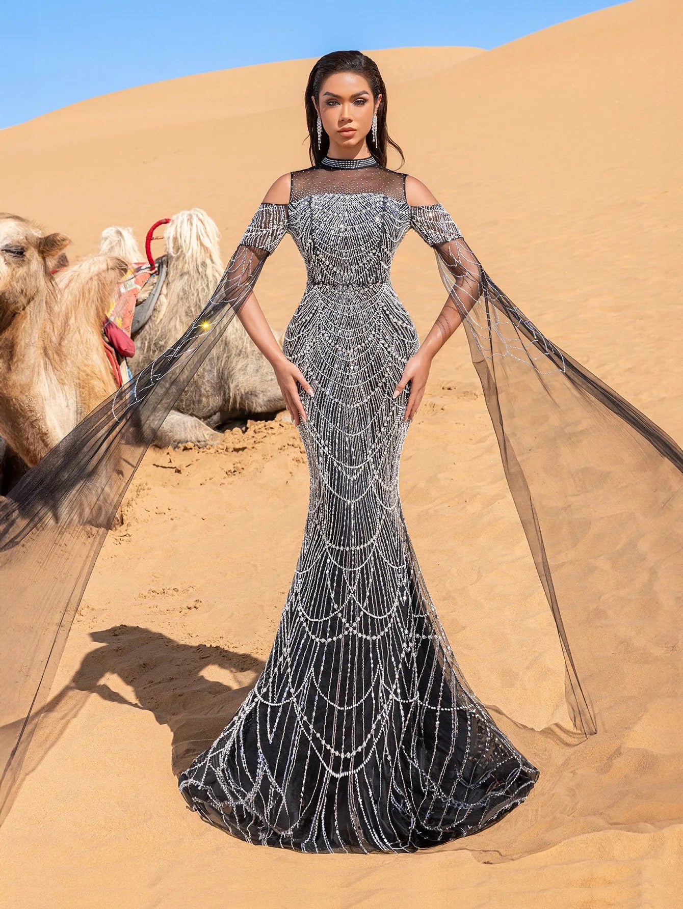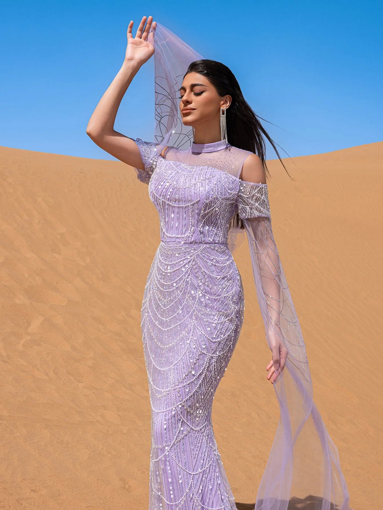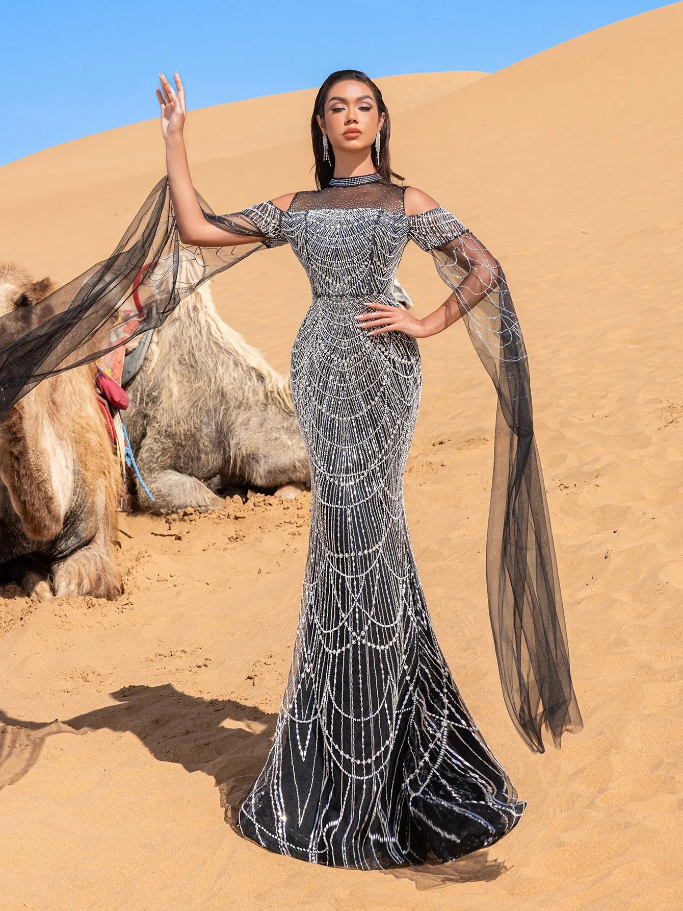 Step into elegance with this ethereal evening gown, designed to capture the essence of grace and sophistication. This gown is meticulously adorned with intricate beadwork and shimmering sequin patterns that cascade down the fitted silhouette, creating a delicate, draped effect reminiscent of falling stars. The high illusion neckline and cold-shoulder cut add a modern twist, while the sheer, flowing cape sleeves bring an enchanting touch, moving gracefully with each step.