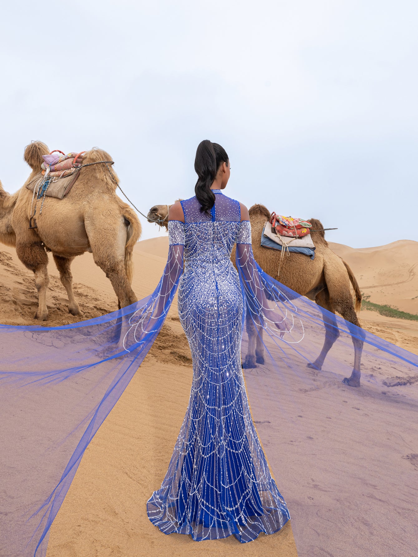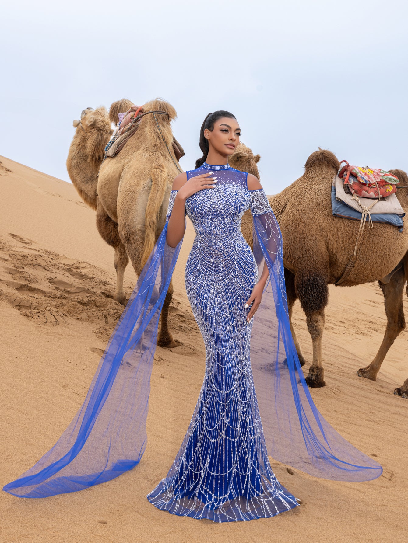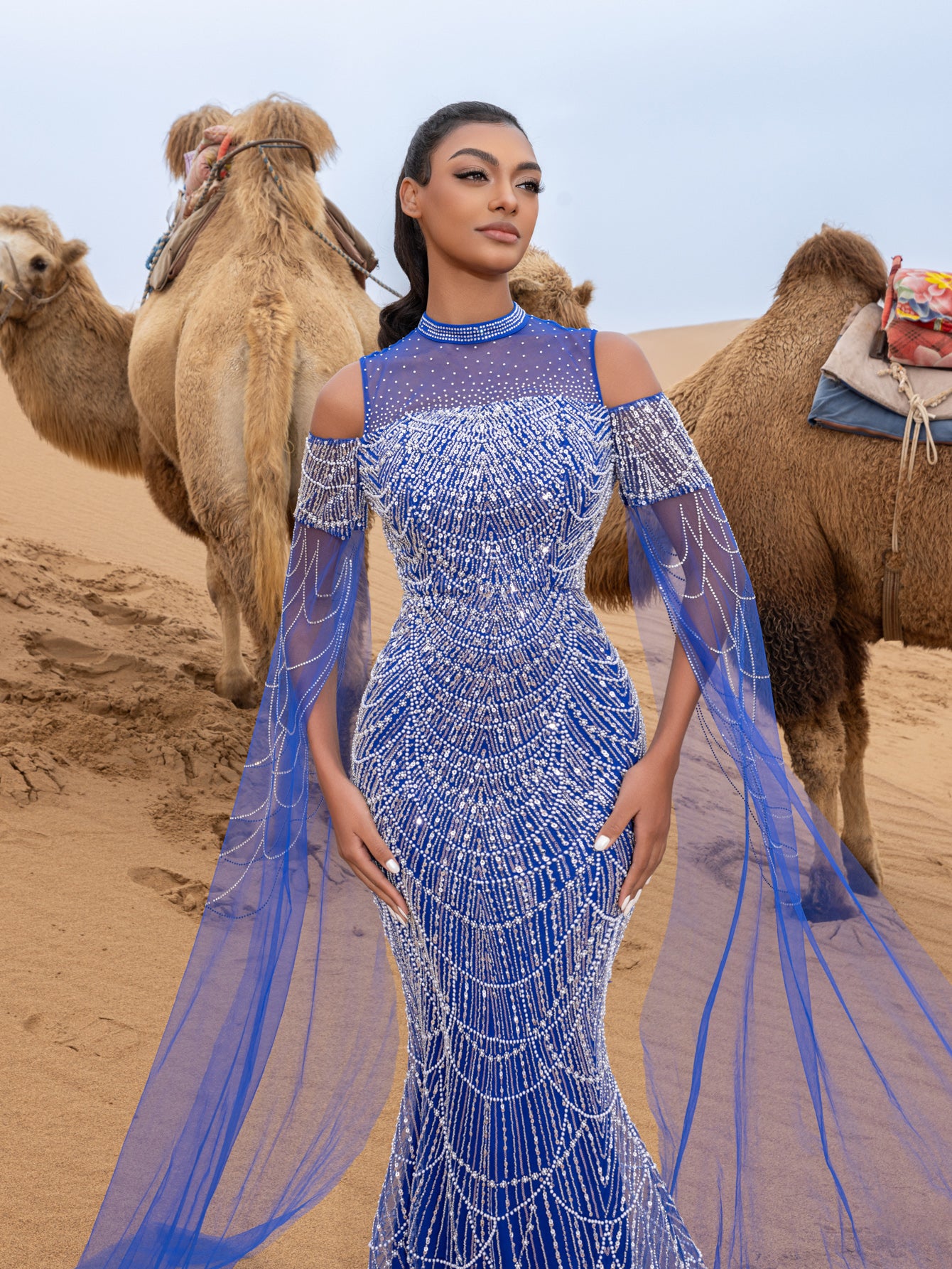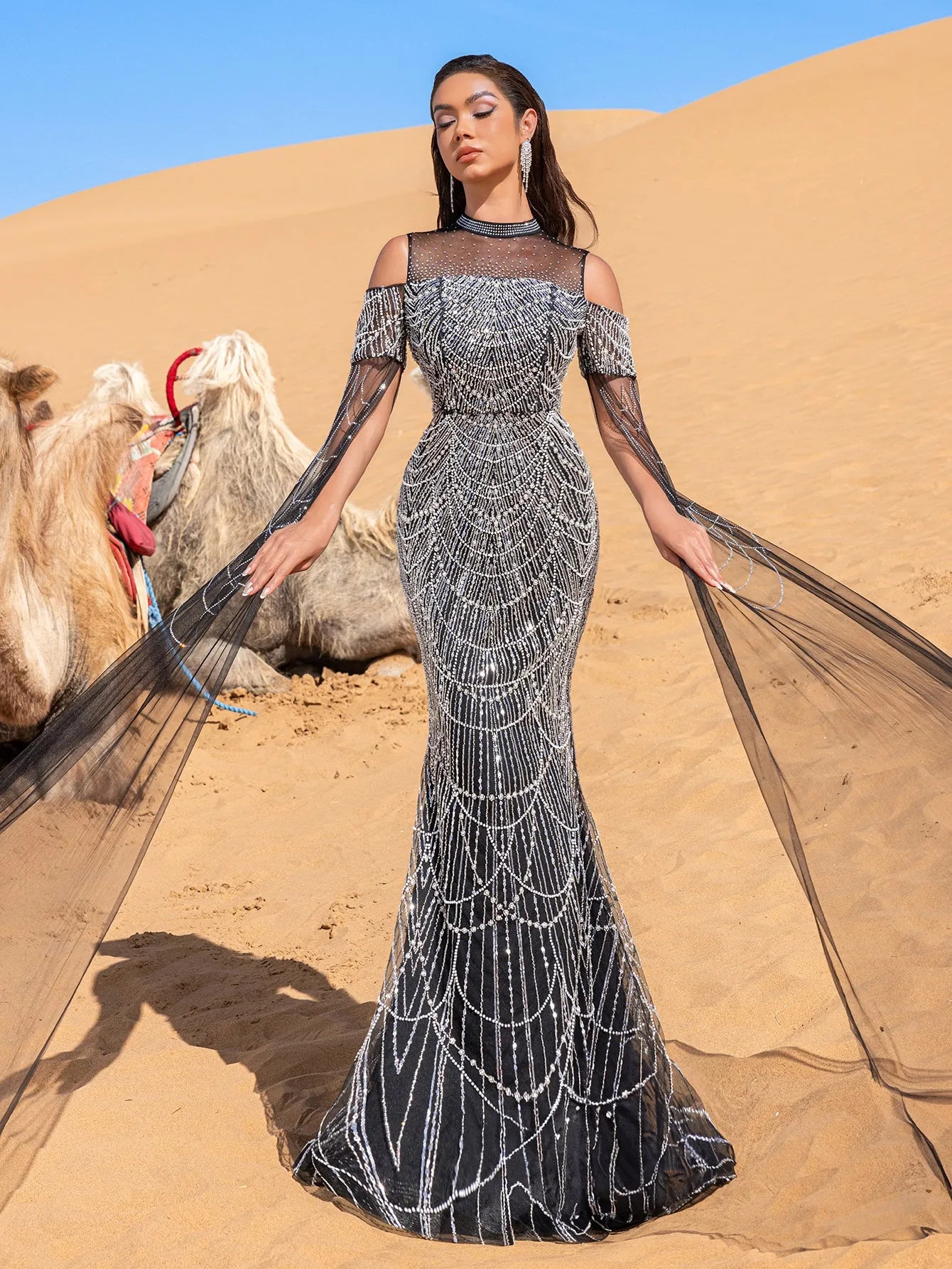 Step into elegance with this ethereal evening gown, designed to capture the essence of grace and sophistication. This gown is meticulously adorned with intricate beadwork and shimmering sequin patterns that cascade down the fitted silhouette, creating a delicate, draped effect reminiscent of falling stars. The high illusion neckline and cold-shoulder cut add a modern twist, while the sheer, flowing cape sleeves bring an enchanting touch, moving gracefully with each step.