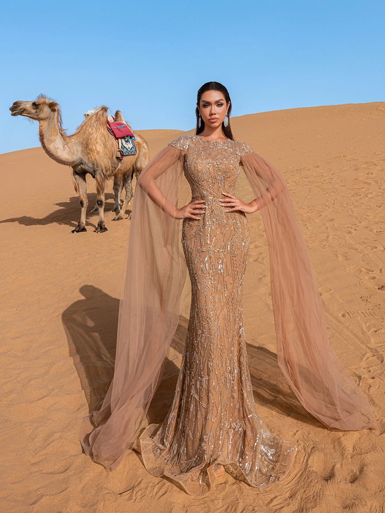 Embrace timeless elegance with this breathtaking evening gown, designed for those who seek an air of sophistication and drama. This enchanting piece showcases intricate beaded patterns that shimmer exquisitely with every movement, arranged in captivating linear designs that accentuate the body’s natural curves. The boat neckline offers a refined touch, while the fitted silhouette gracefully extends into a floor-sweeping hem, embodying classic glamour. Adding a touch of ethereal charm, the gown features an airy, translucent cape that flows effortlessly, enhancing the overall regal look and creating a striking effect.