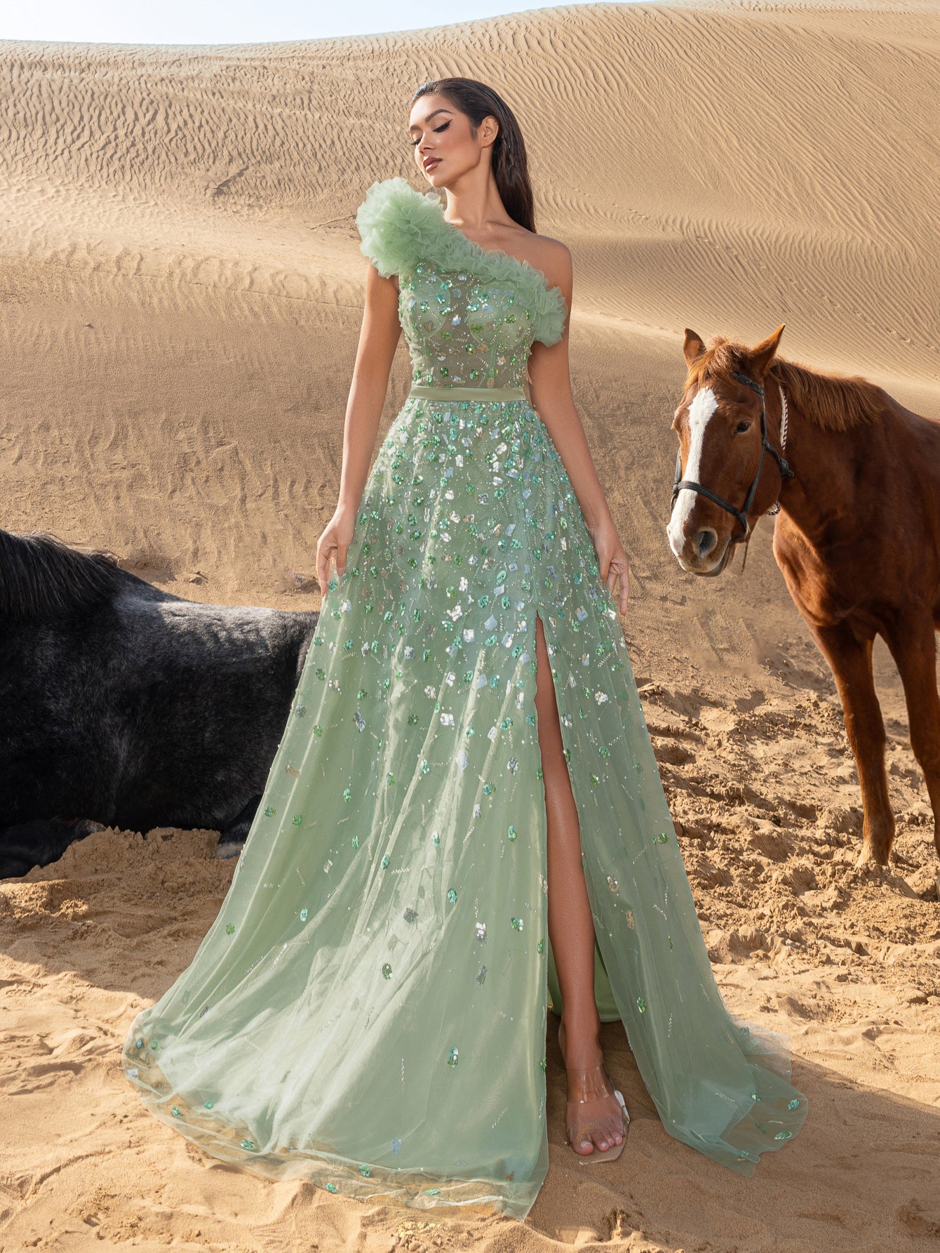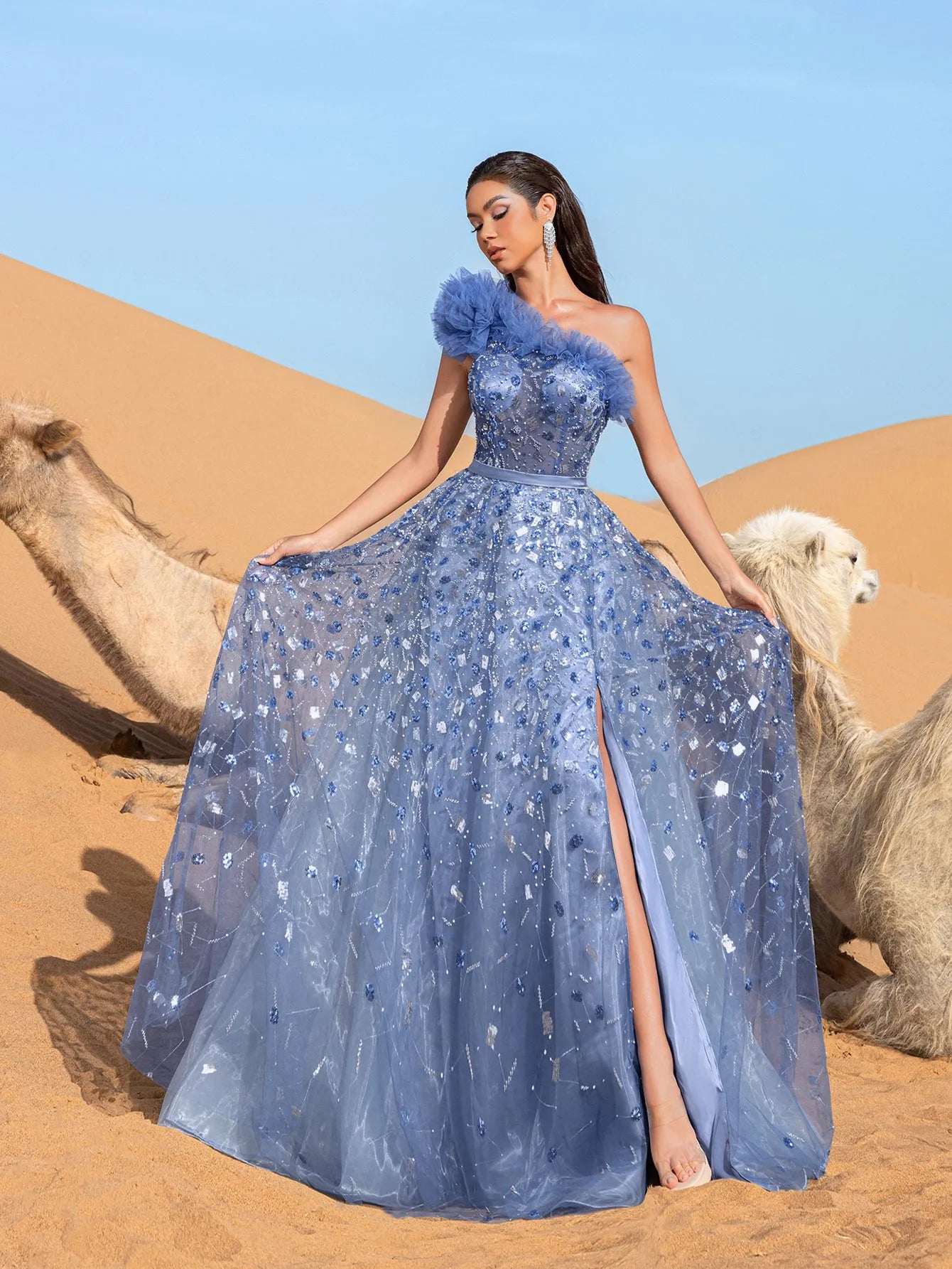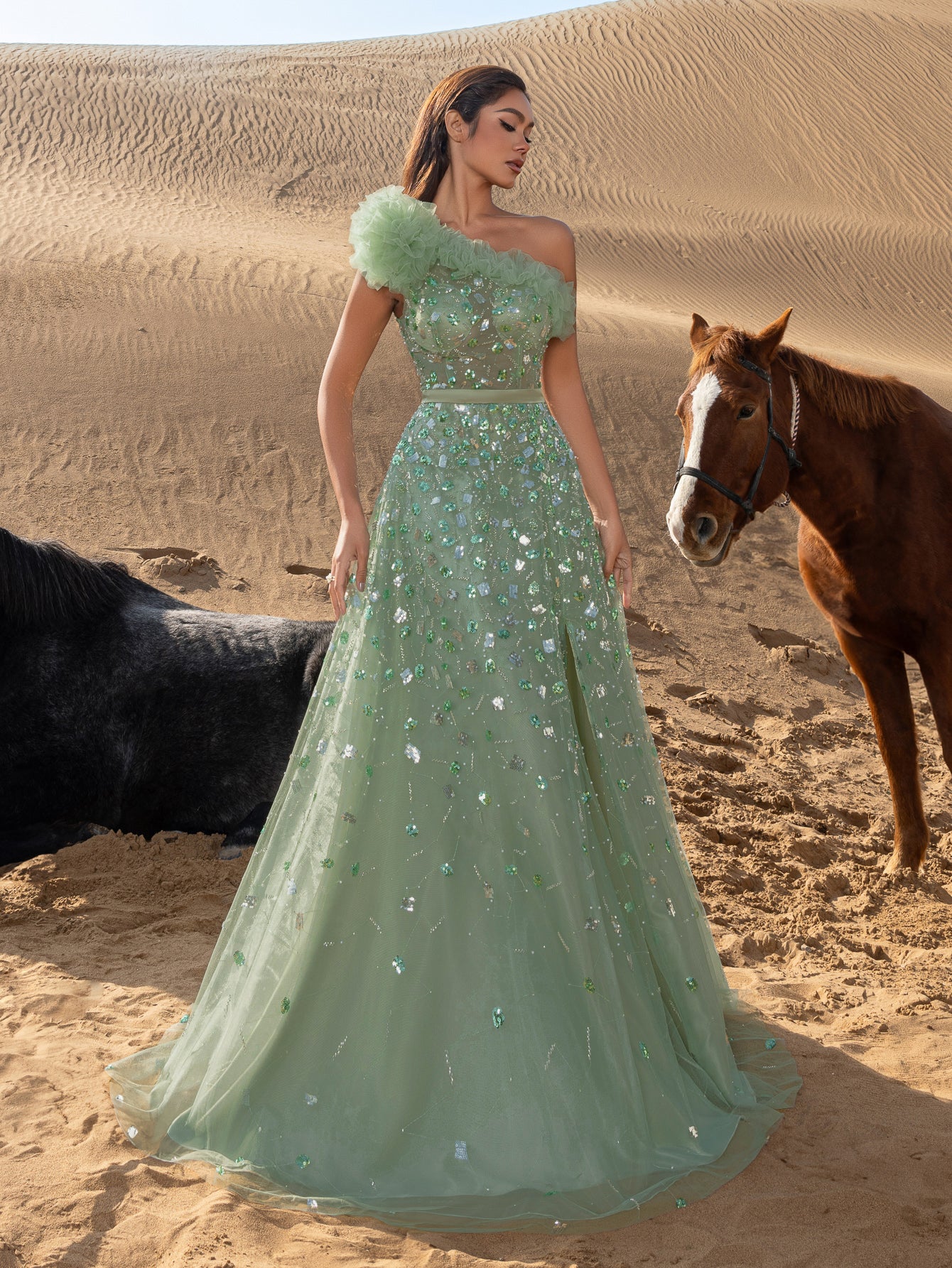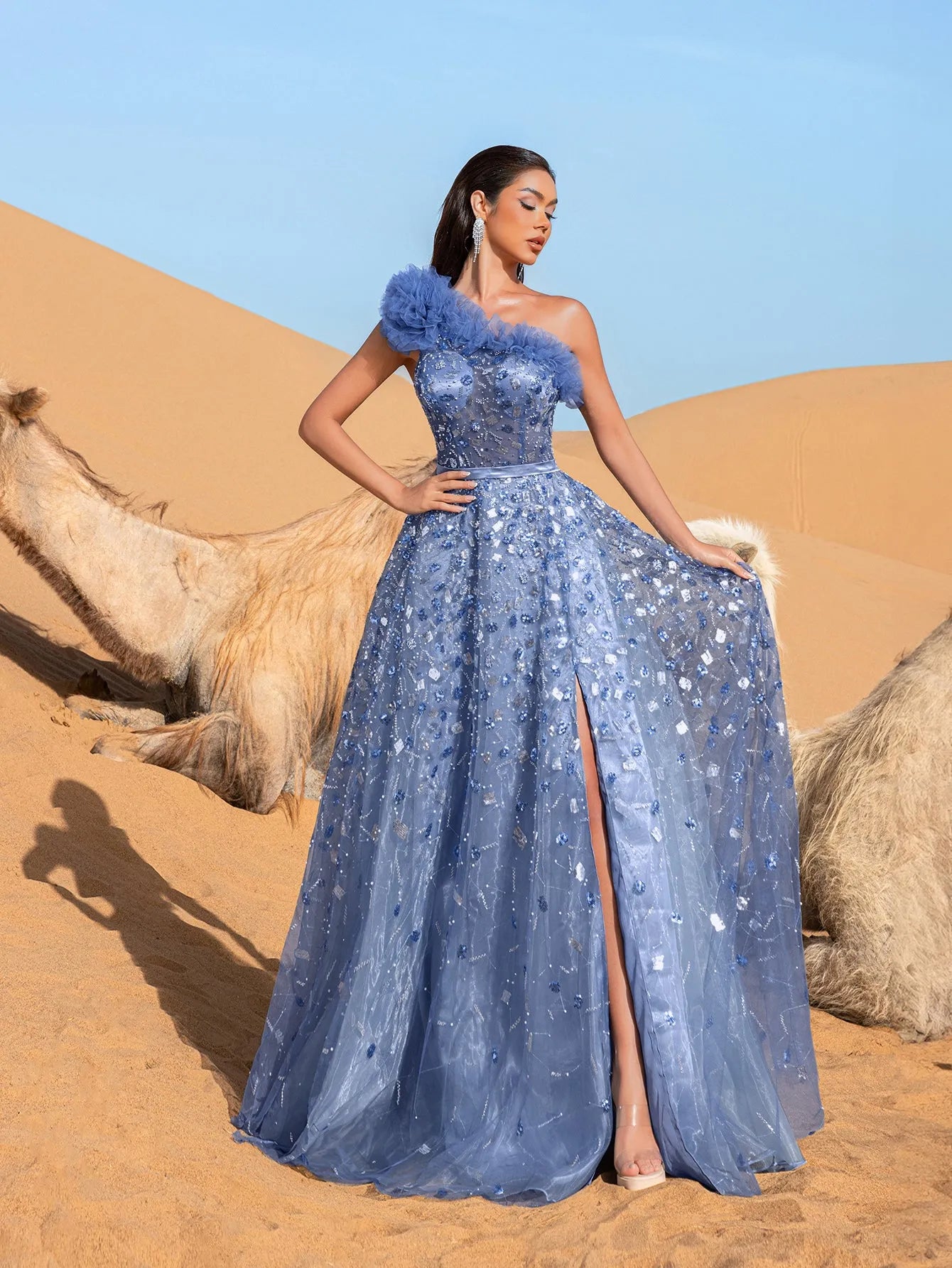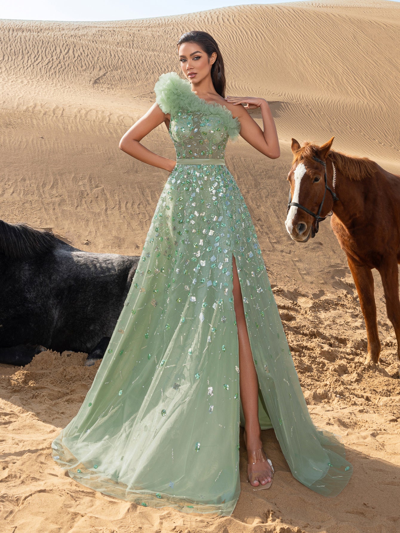 Step into sophistication with this breathtaking evening gown, crafted to embody elegance and modern allure. The one-shoulder design is accentuated by a luxurious ruffle trim cascading along the neckline, adding a unique touch of texture and movement. The fitted bodice flows gracefully into an A-line silhouette, adorned with shimmering beads and sequins that catch the light beautifully. A daring thigh-high slit adds a hint of allure, allowing for graceful movement and an elevated, stylish edge.