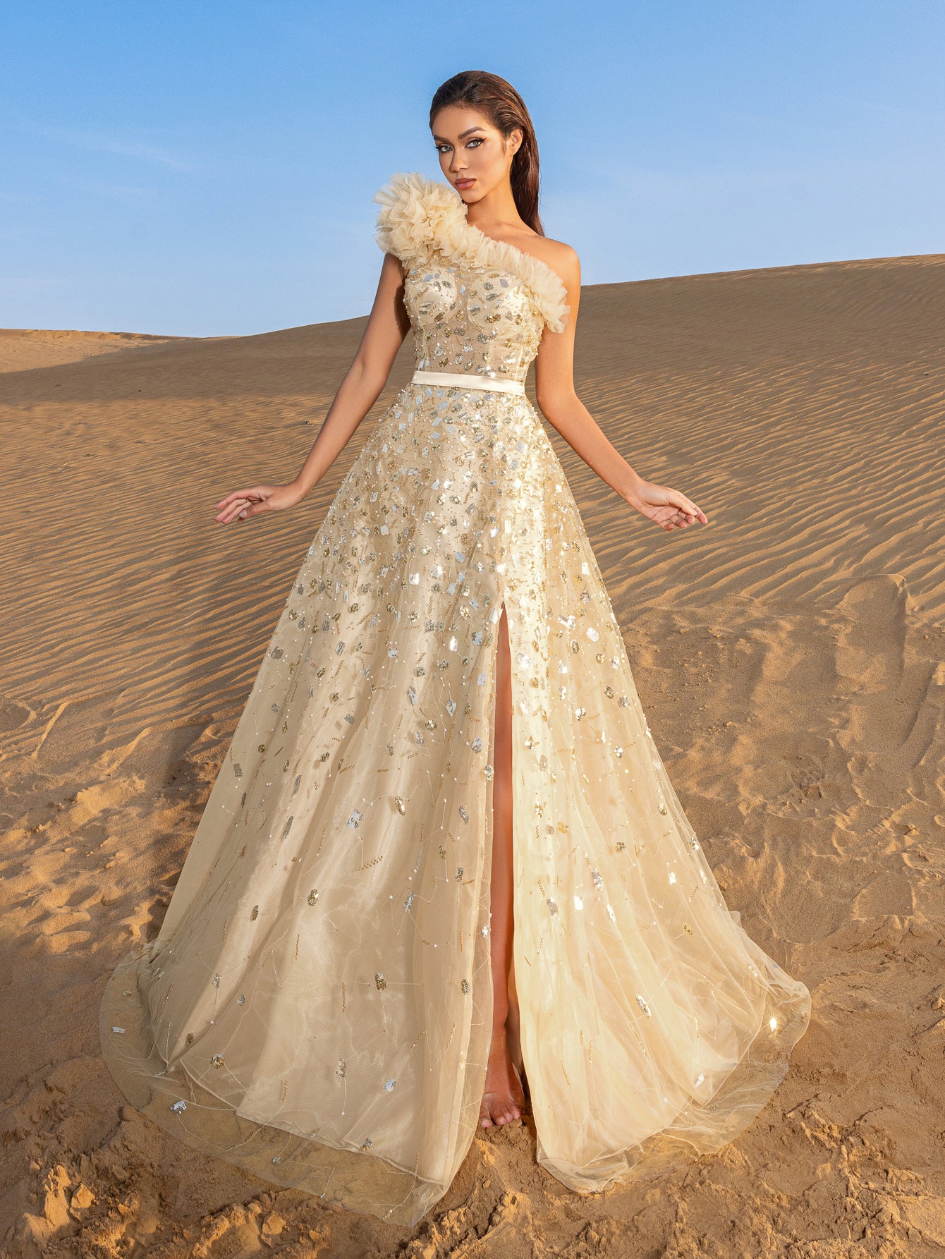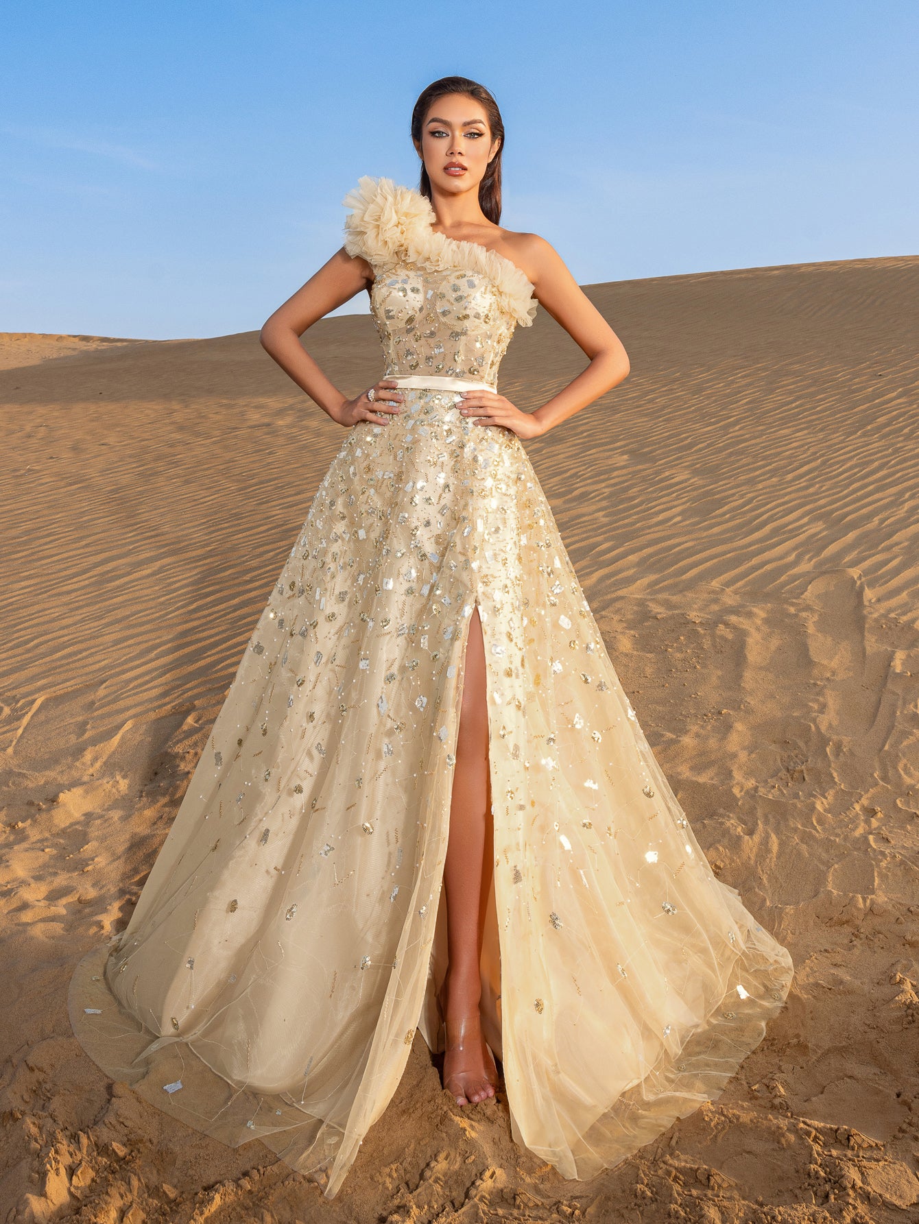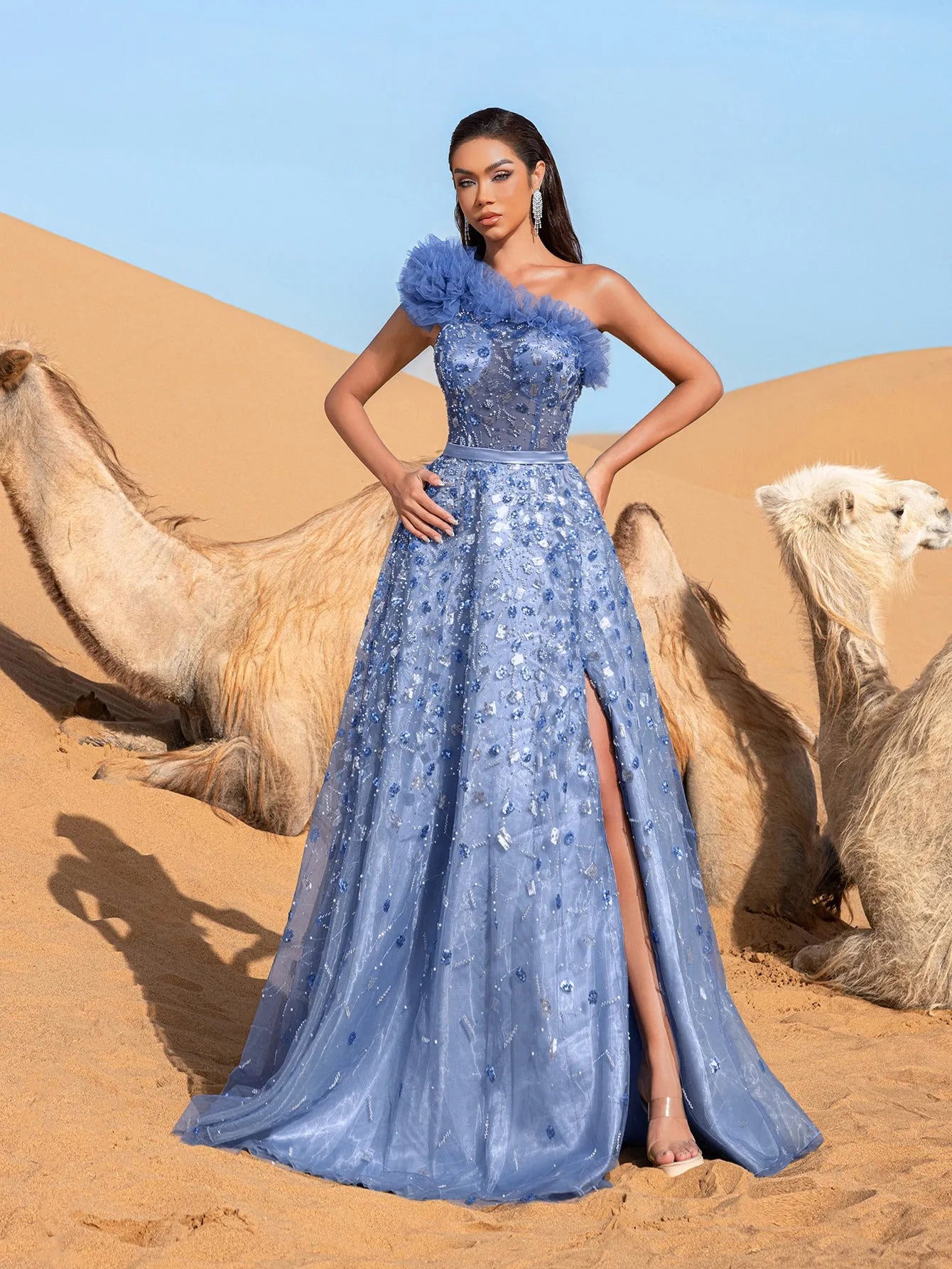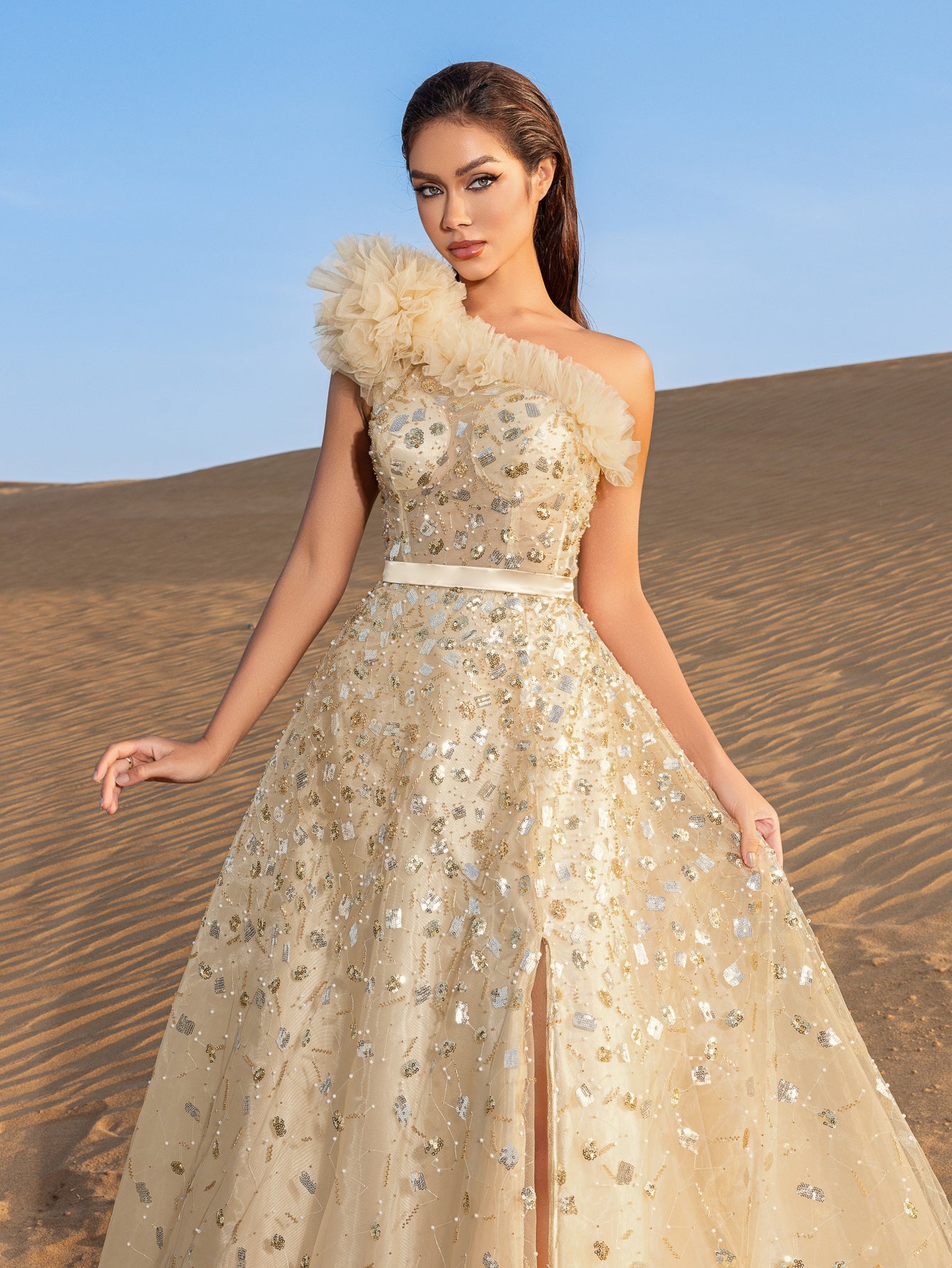 Step into sophistication with this breathtaking evening gown, crafted to embody elegance and modern allure. The one-shoulder design is accentuated by a luxurious ruffle trim cascading along the neckline, adding a unique touch of texture and movement. The fitted bodice flows gracefully into an A-line silhouette, adorned with shimmering beads and sequins that catch the light beautifully. A daring thigh-high slit adds a hint of allure, allowing for graceful movement and an elevated, stylish edge.