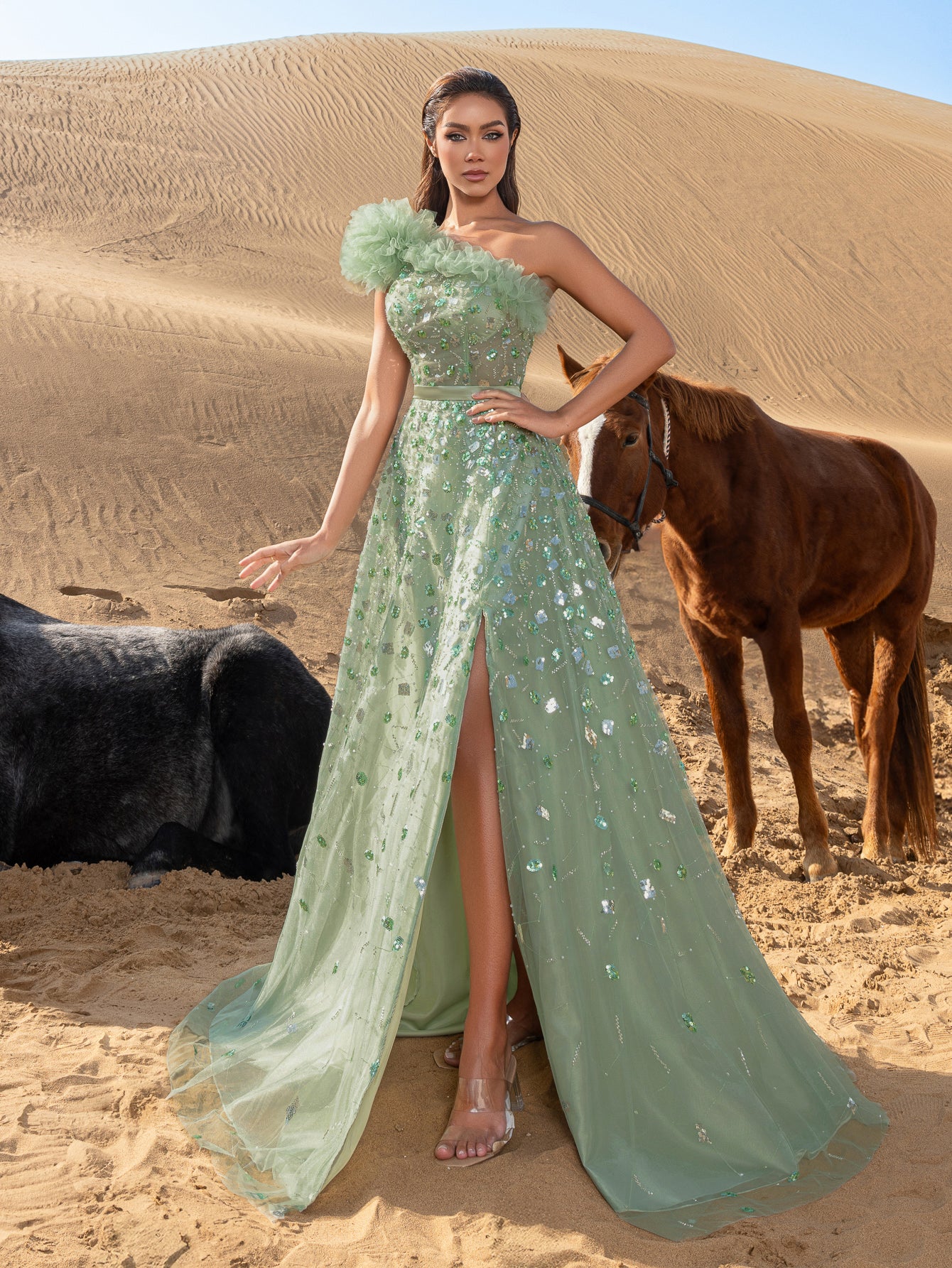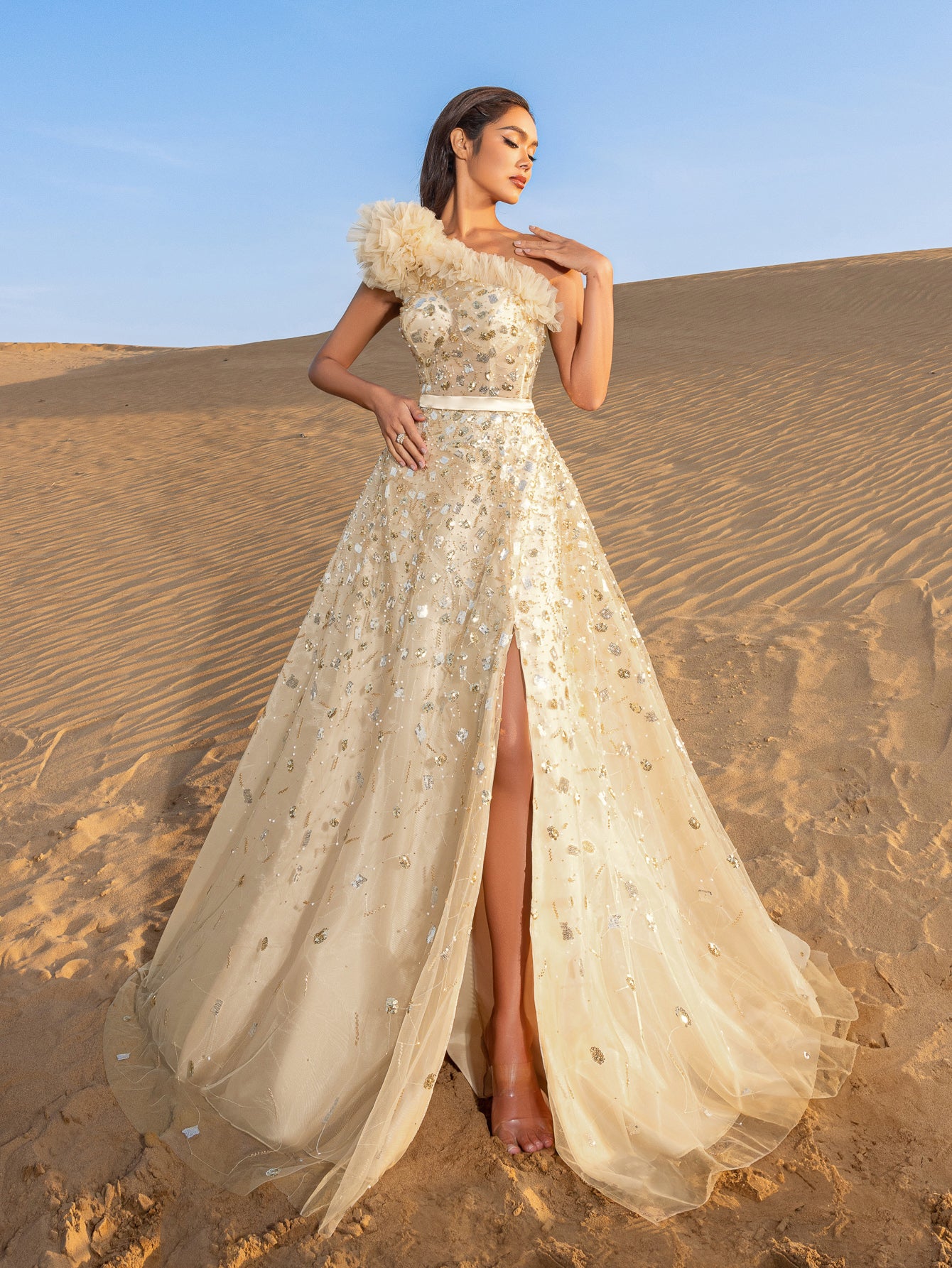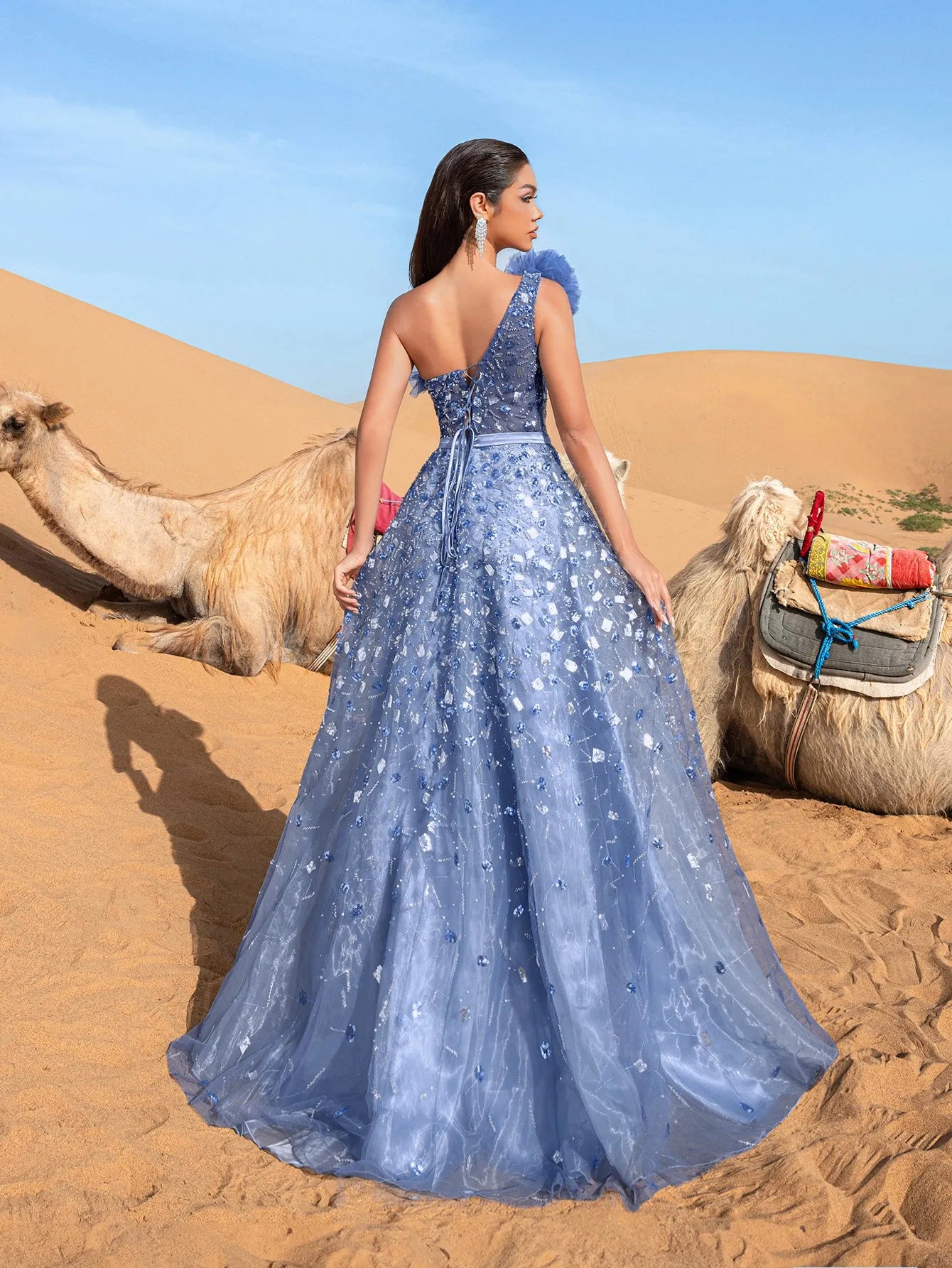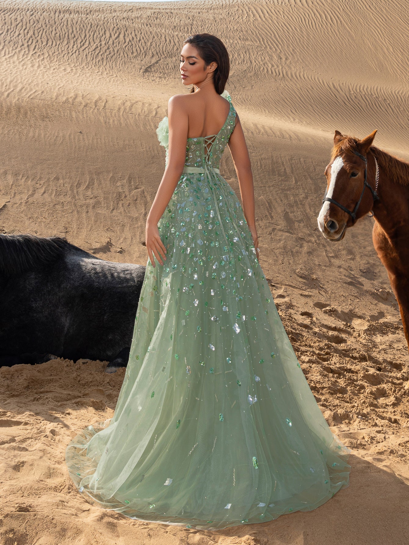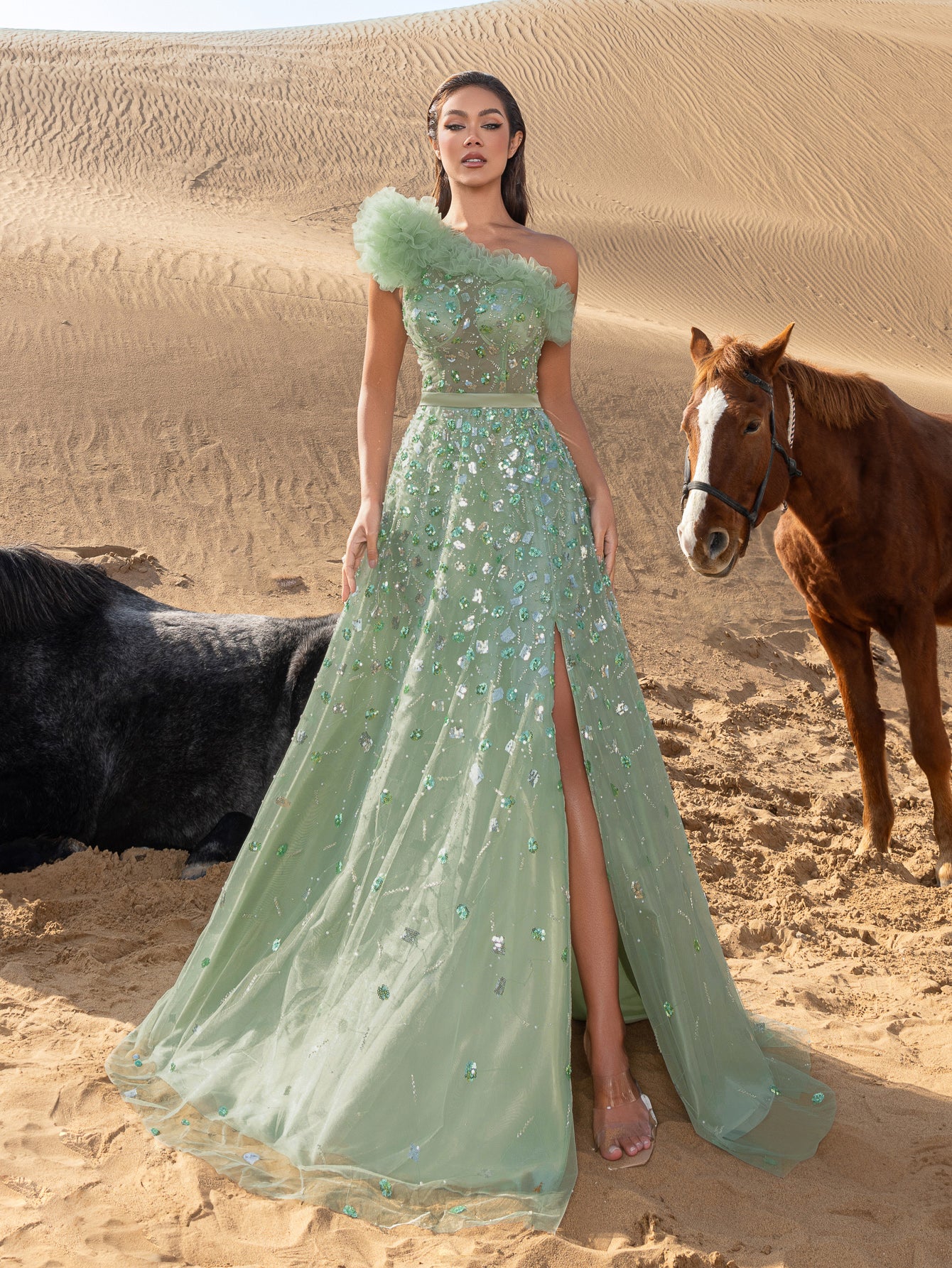 Step into sophistication with this breathtaking evening gown, crafted to embody elegance and modern allure. The one-shoulder design is accentuated by a luxurious ruffle trim cascading along the neckline, adding a unique touch of texture and movement. The fitted bodice flows gracefully into an A-line silhouette, adorned with shimmering beads and sequins that catch the light beautifully. A daring thigh-high slit adds a hint of allure, allowing for graceful movement and an elevated, stylish edge.