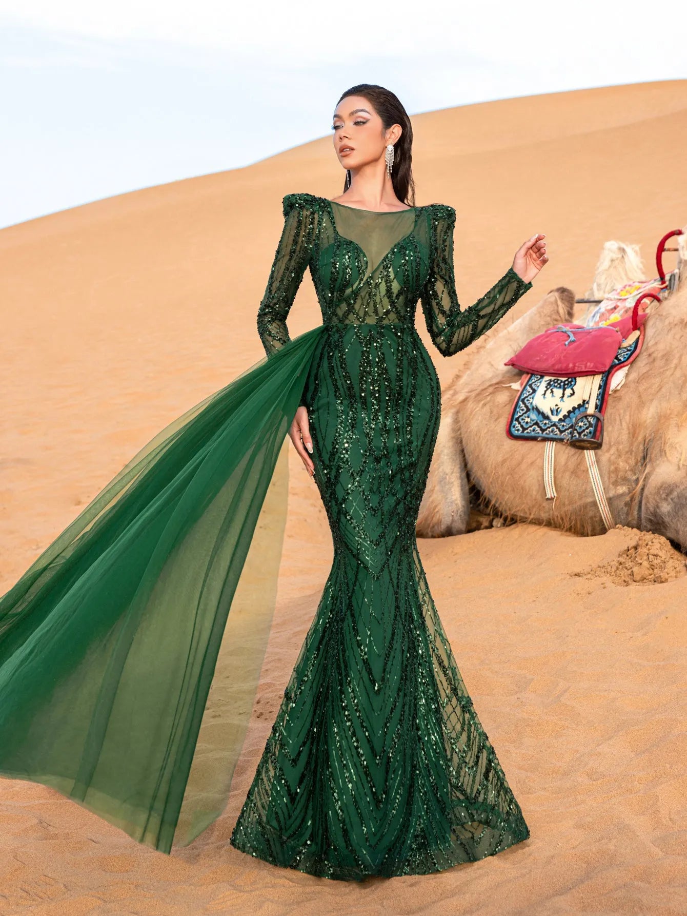 Make a grand entrance with this opulent evening gown, designed for ultimate sophistication and allure. Crafted with a luxurious blend of sequins and delicate beading, this dress glistens under the light, adding depth and dimension to its intricate design. The gown features a round neckline and sheer long sleeves adorned with beaded accents, while the fitted silhouette gracefully flows into a floor-length hem. A dramatic, airy drape cascades from the shoulder, adding movement and an ethereal touch to your look.
