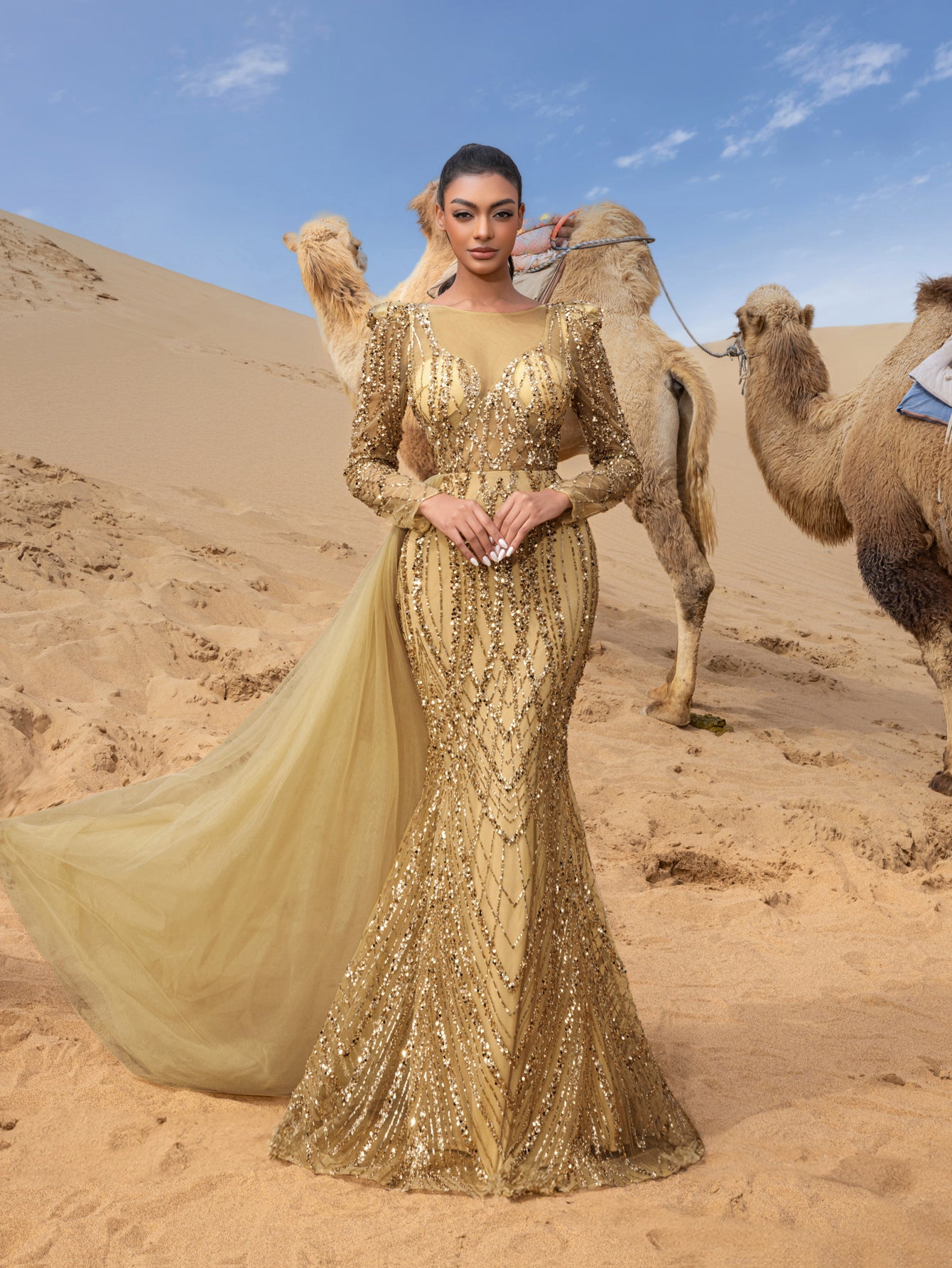 Channel your inner goddess with this breathtaking gown, where every bead and sequin has been placed to create a masterpiece of elegance. This dress is made for those who wish to shine with sophistication and poise.