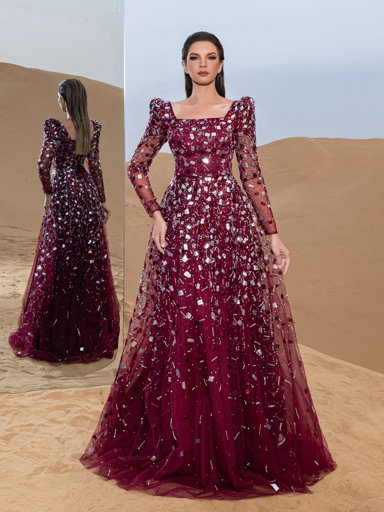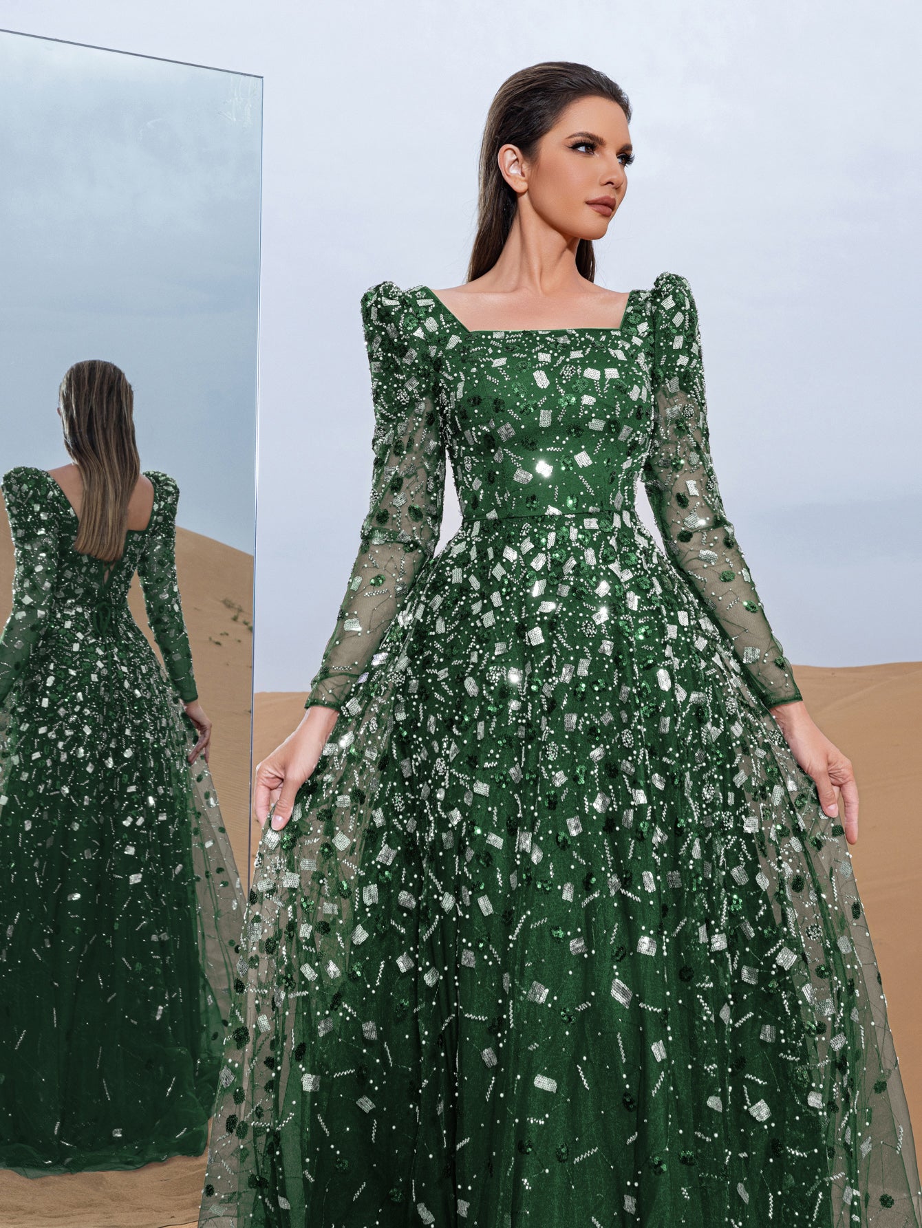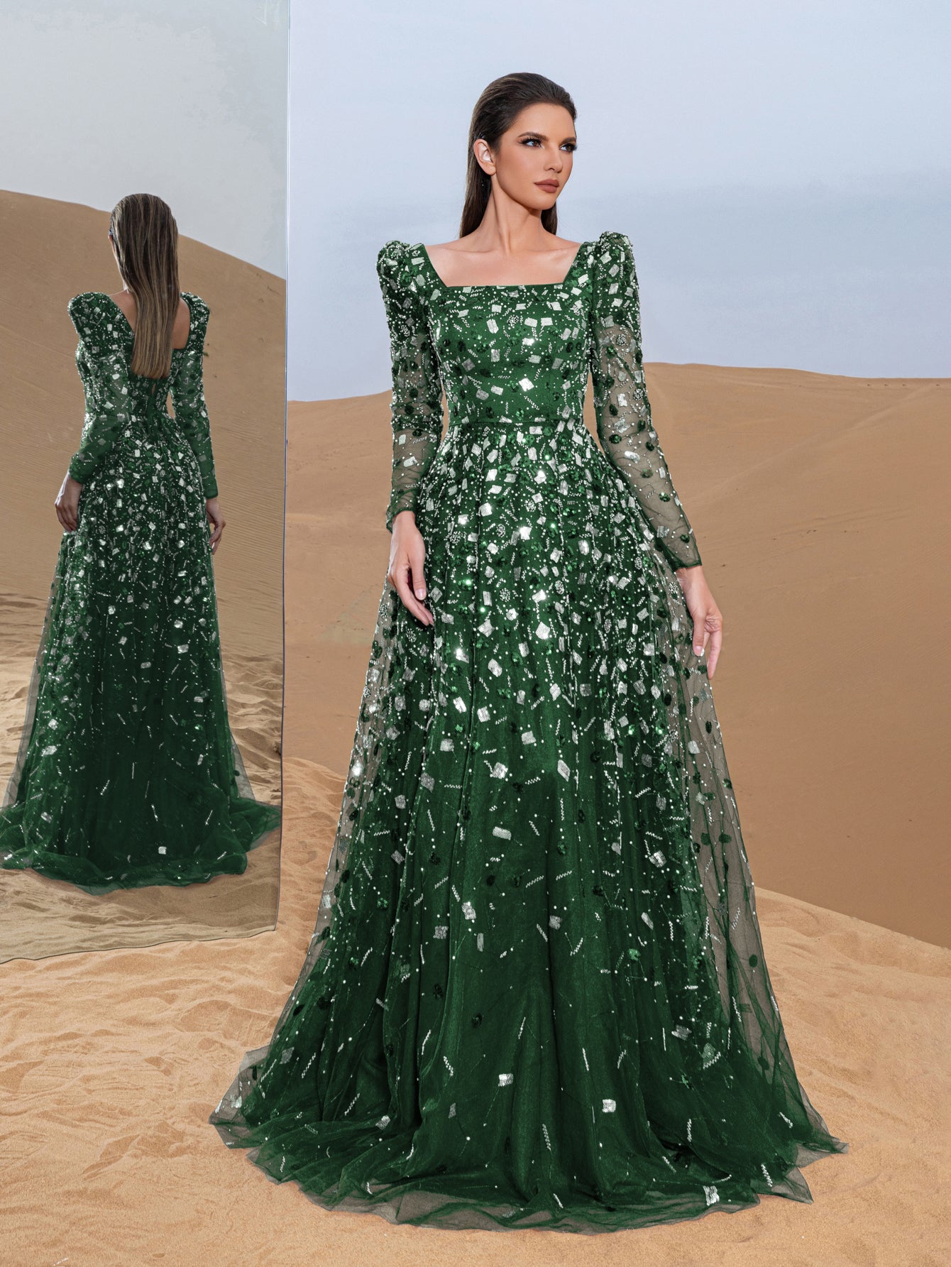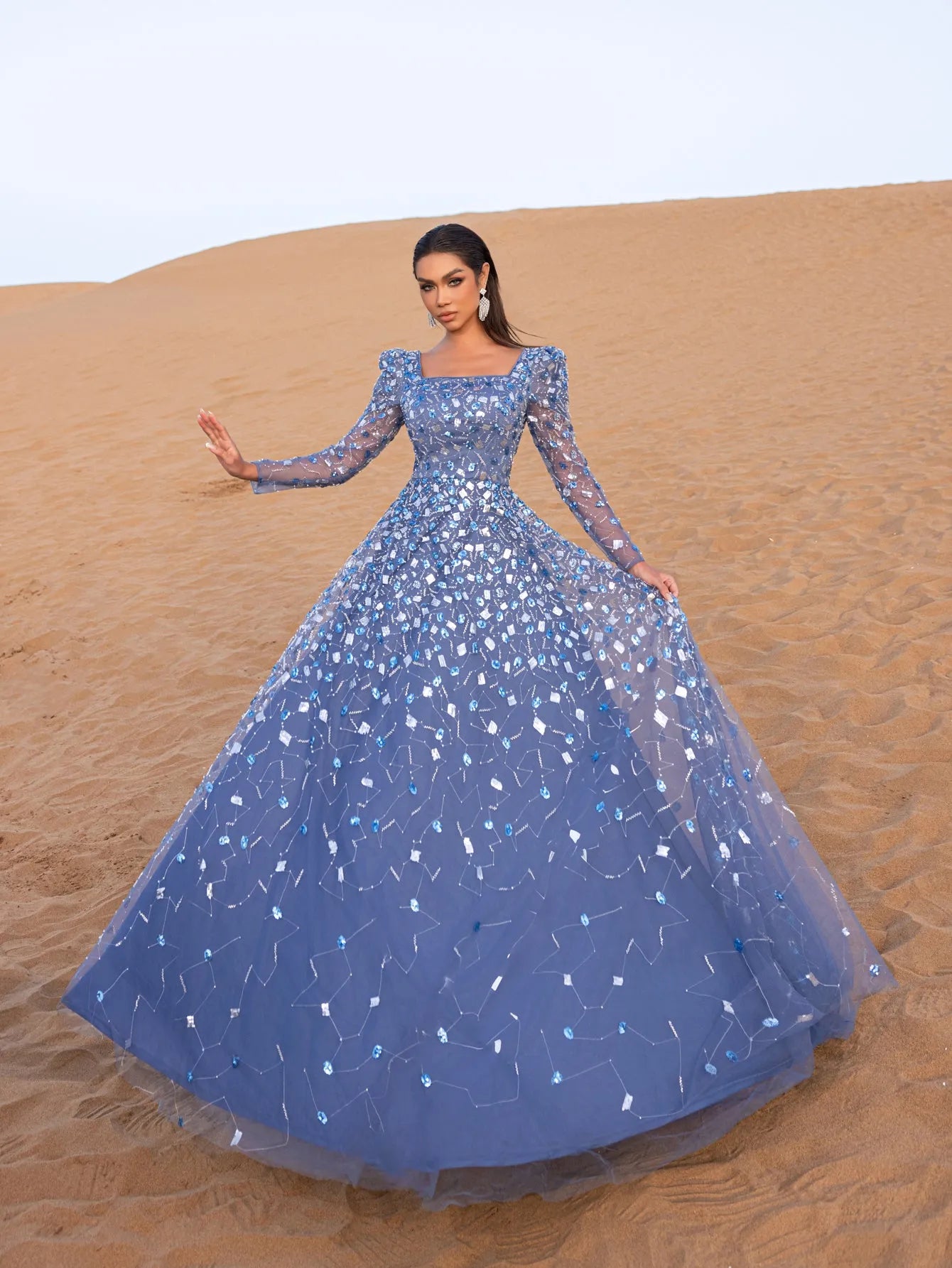 Step into elegance with this captivating ball gown, a masterpiece of timeless charm and intricate detailing. Crafted with a harmonious blend of sequins and delicate beading, the gown shimmers with every movement, mimicking a starlit sky. Its sheer long sleeves and square neckline lend an air of sophistication, while the fitted bodice gracefully extends into a voluminous floor-length skirt. Each bead is carefully placed to create a mesmerizing pattern, making this gown a standout choice for any grand occasion.