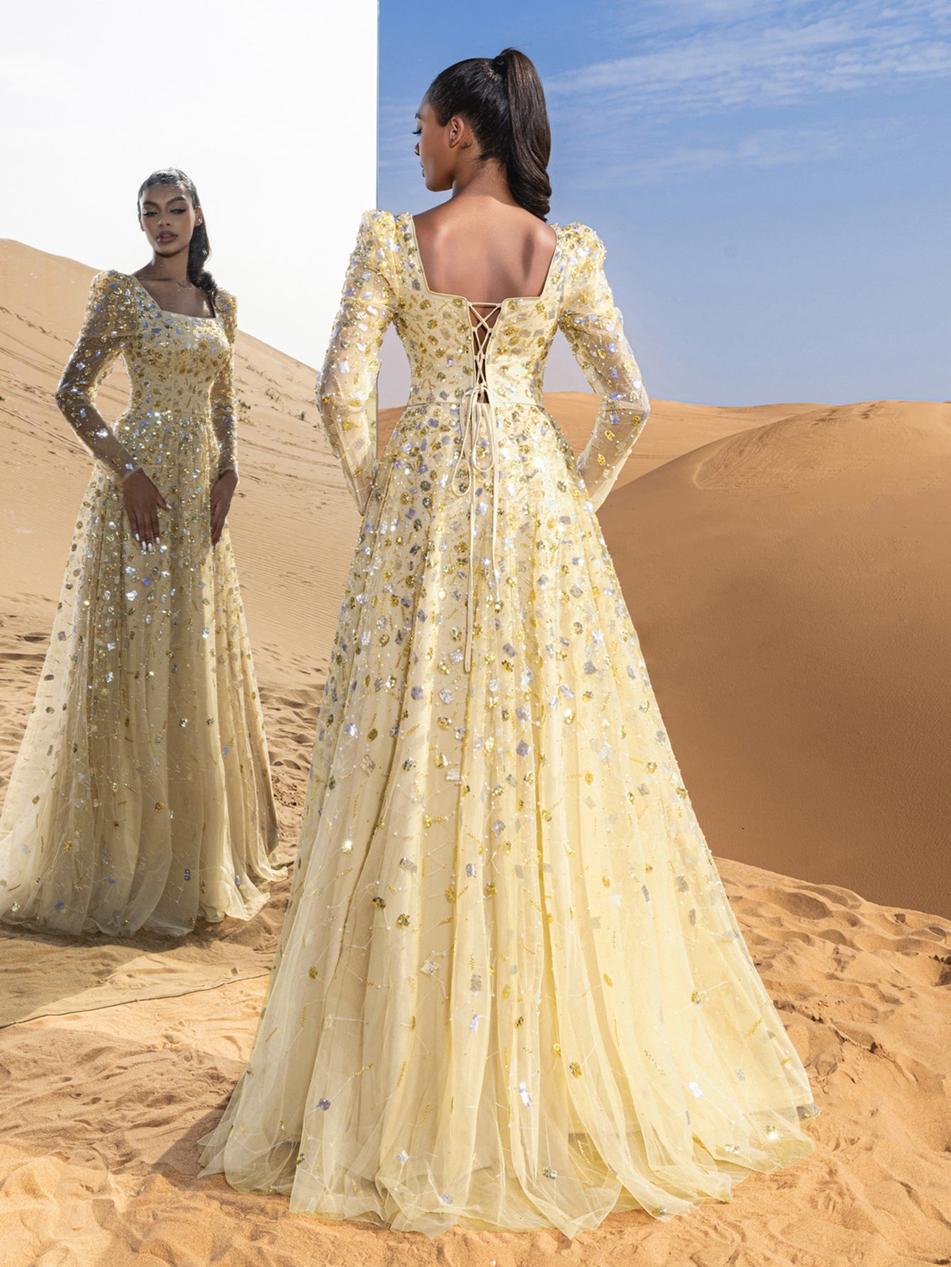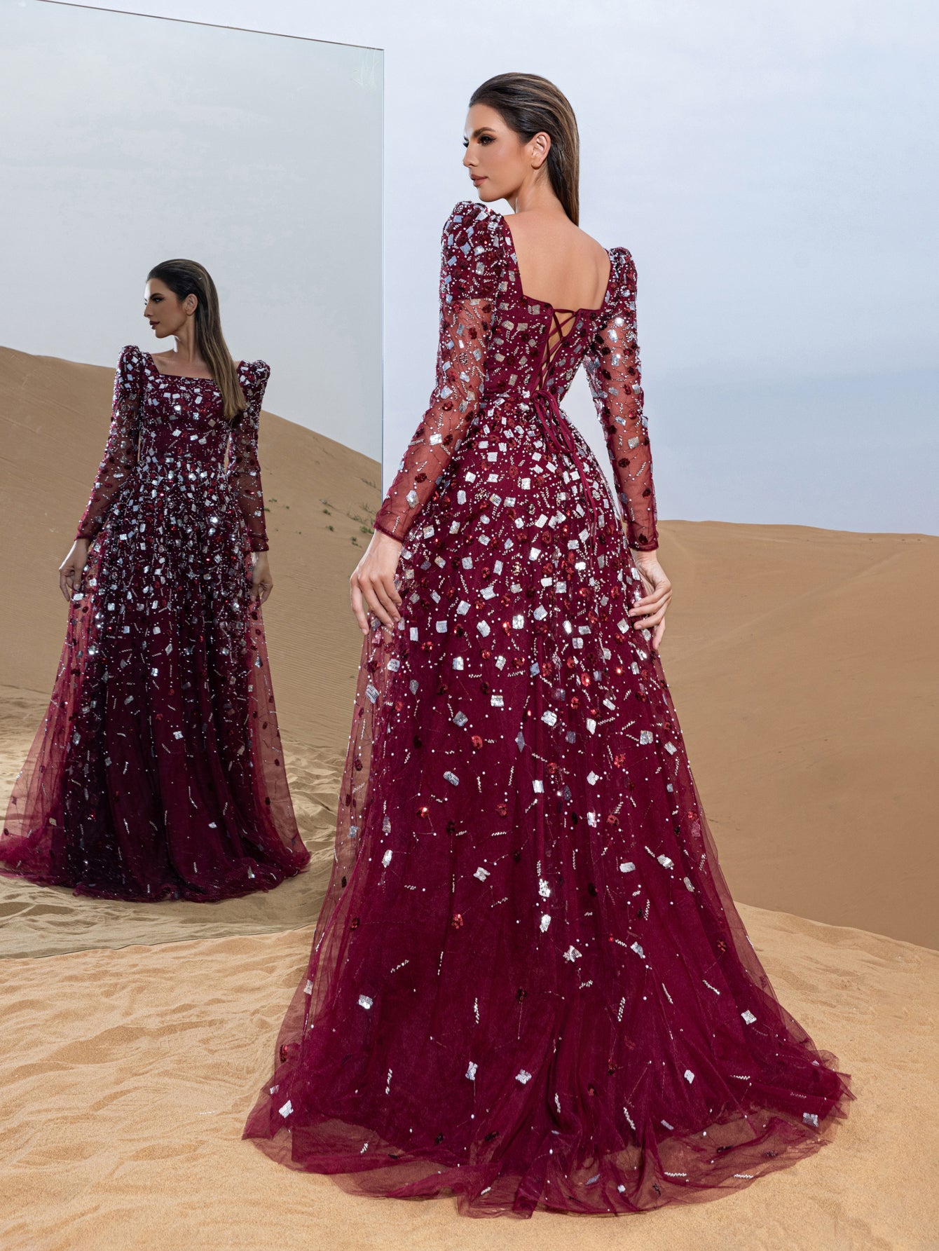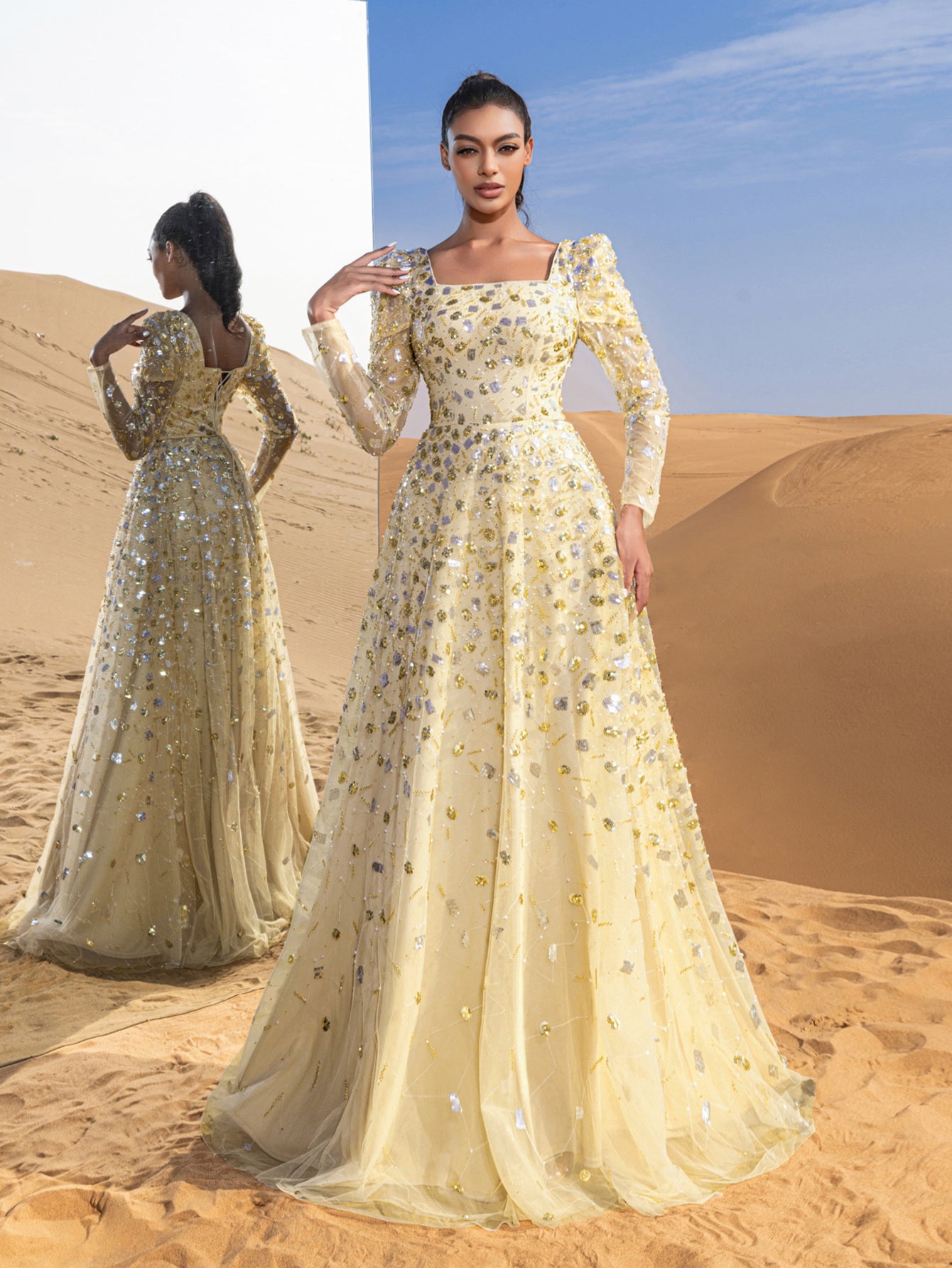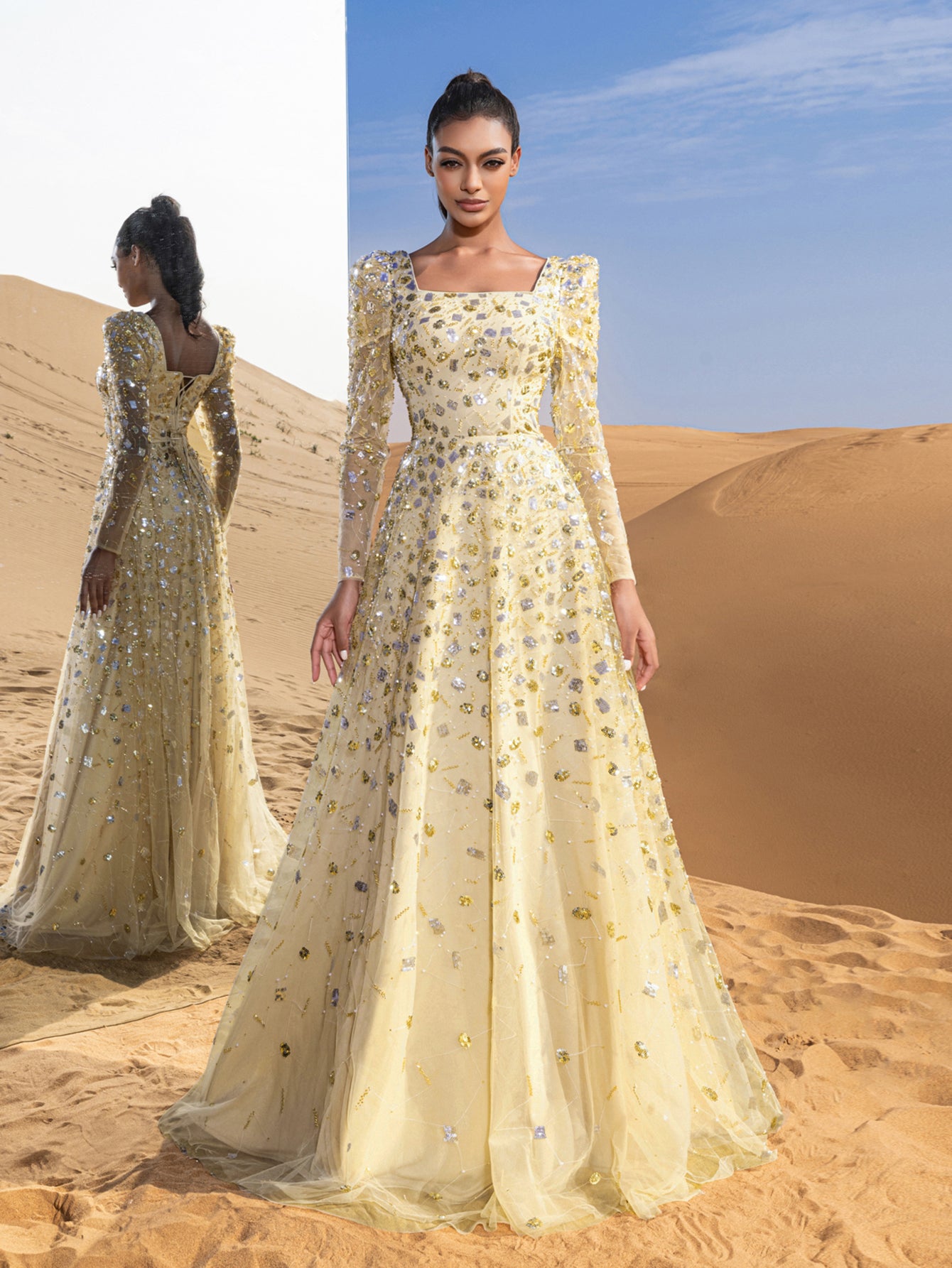 Step into elegance with this captivating ball gown, a masterpiece of timeless charm and intricate detailing. Crafted with a harmonious blend of sequins and delicate beading, the gown shimmers with every movement, mimicking a starlit sky. Its sheer long sleeves and square neckline lend an air of sophistication, while the fitted bodice gracefully extends into a voluminous floor-length skirt. Each bead is carefully placed to create a mesmerizing pattern, making this gown a standout choice for any grand occasion.
