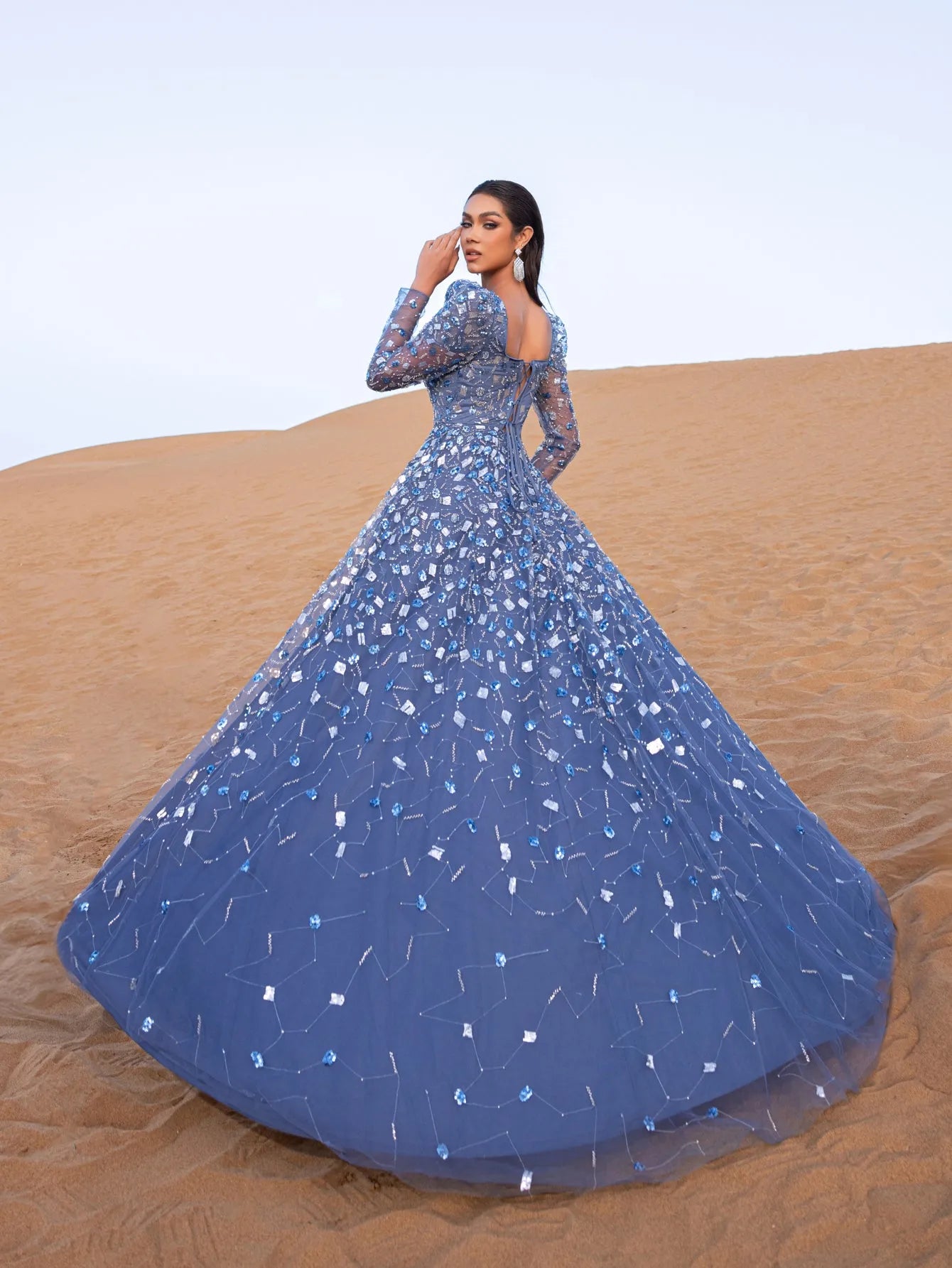 Channel the beauty of a clear night sky in this dazzling gown, perfect for those who seek a balance of elegance and enchanting style.