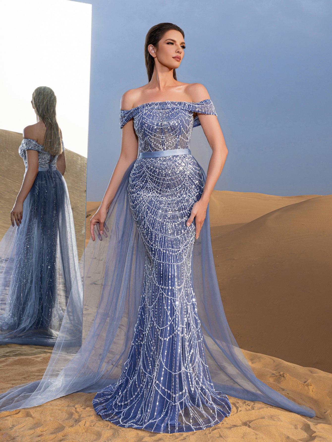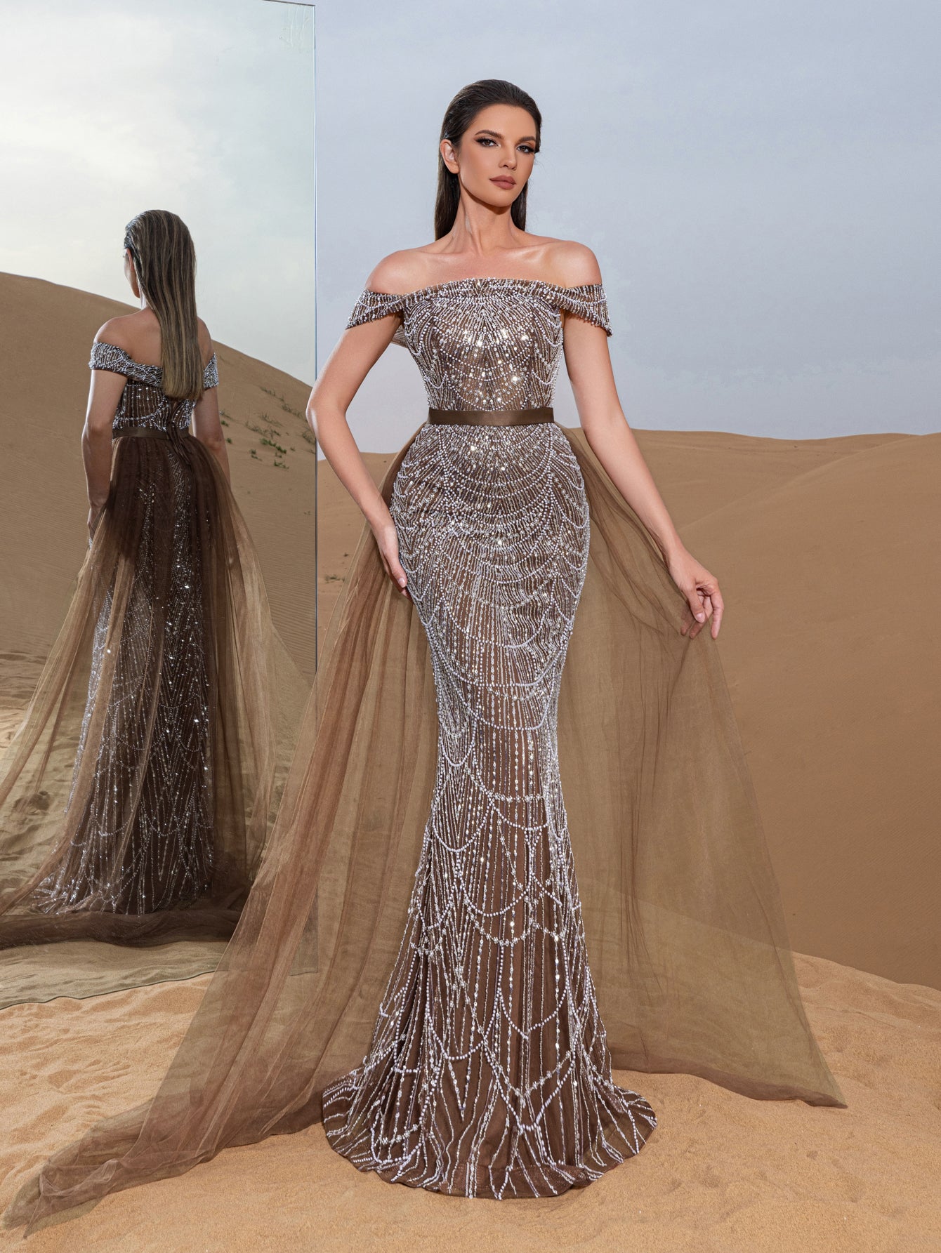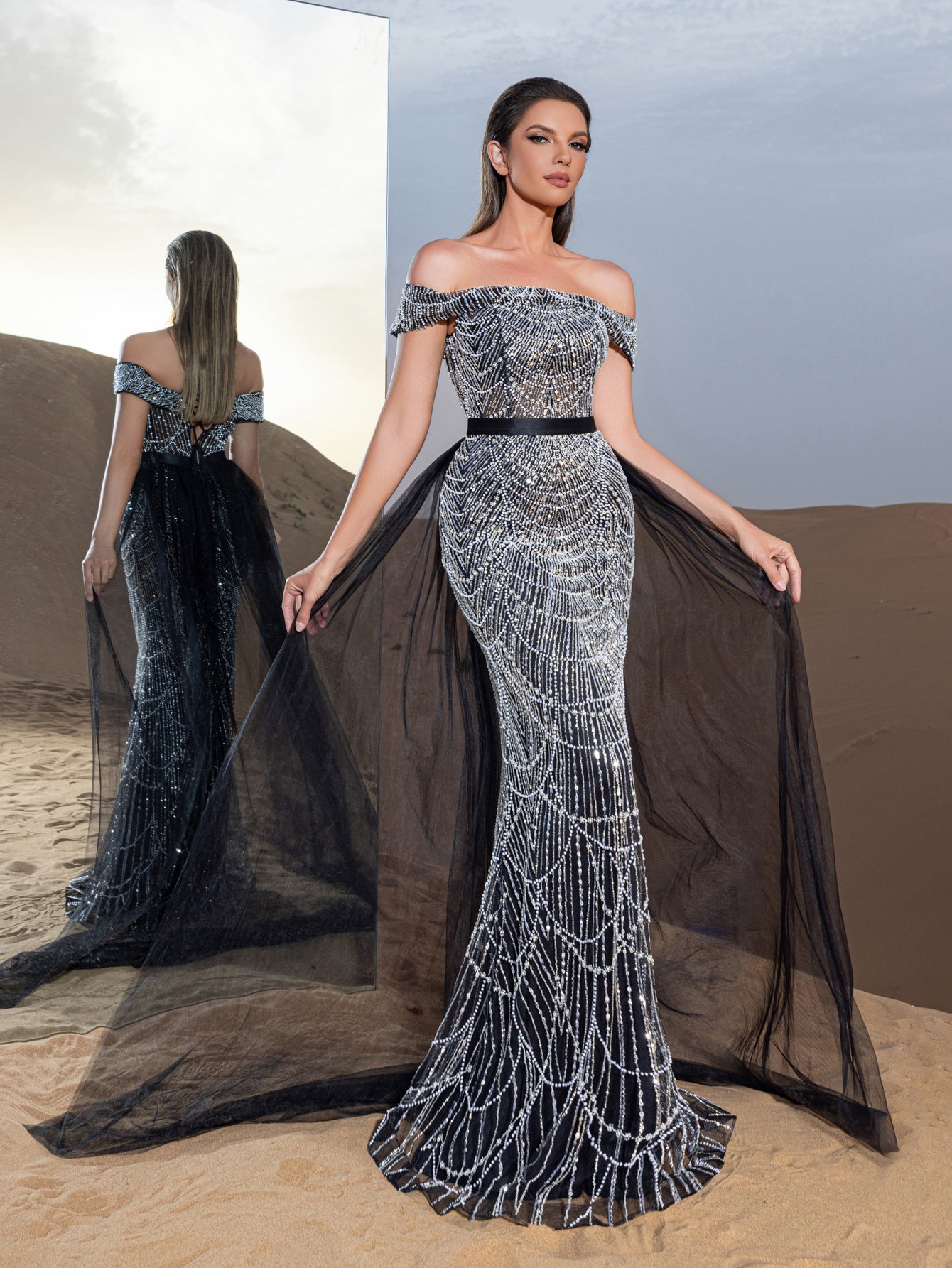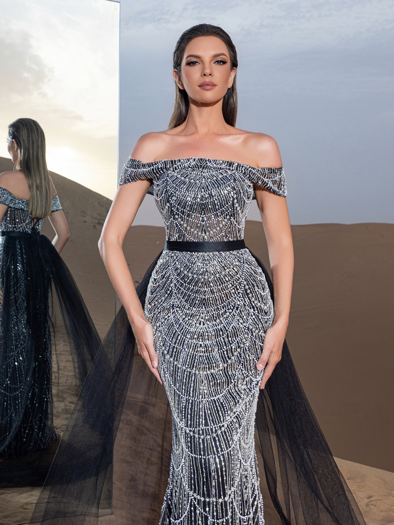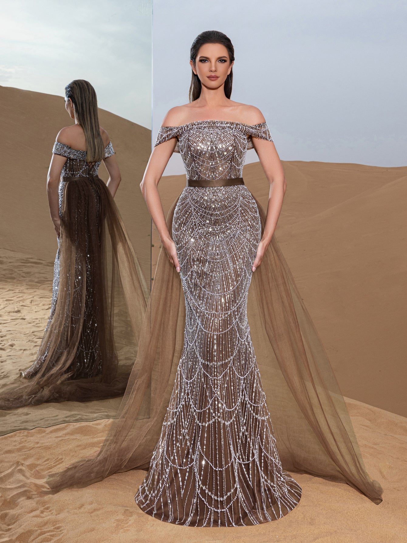 Make a majestic entrance with this stunning evening gown, adorned with luxurious beaded sequin darbic patterns. This gown sparkles with intricate details that reflect light from every angle, lending an air of sophistication and radiance. The off-shoulder neckline highlights the collarbone, while the fitted bodice and mermaid silhouette gracefully accentuate the figure. Adding a touch of ethereal charm, a soft, flowing overskirt cascades from the waist, creating a dreamlike effect as you move.