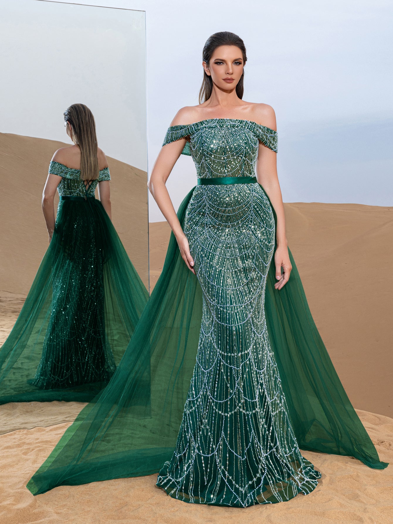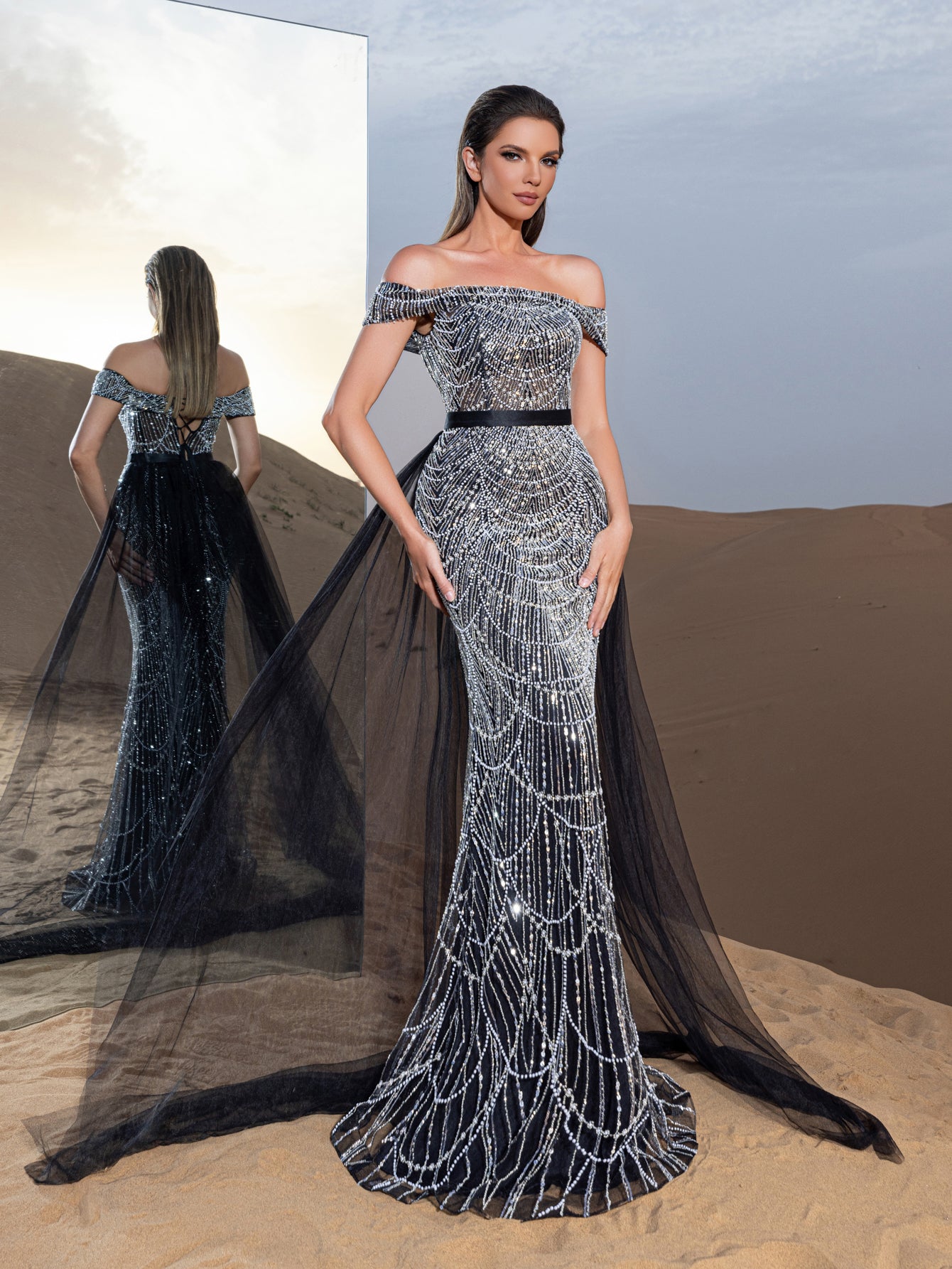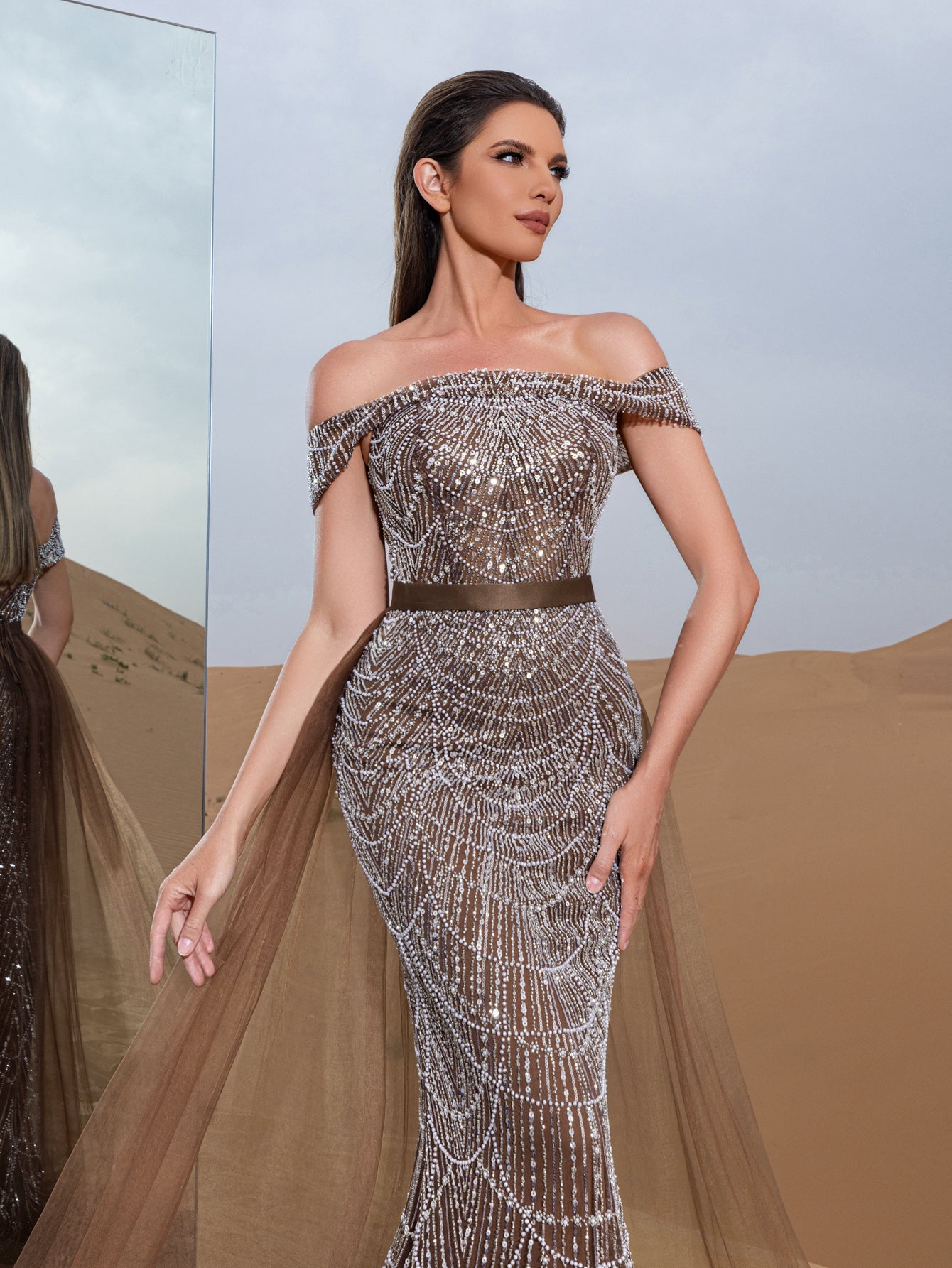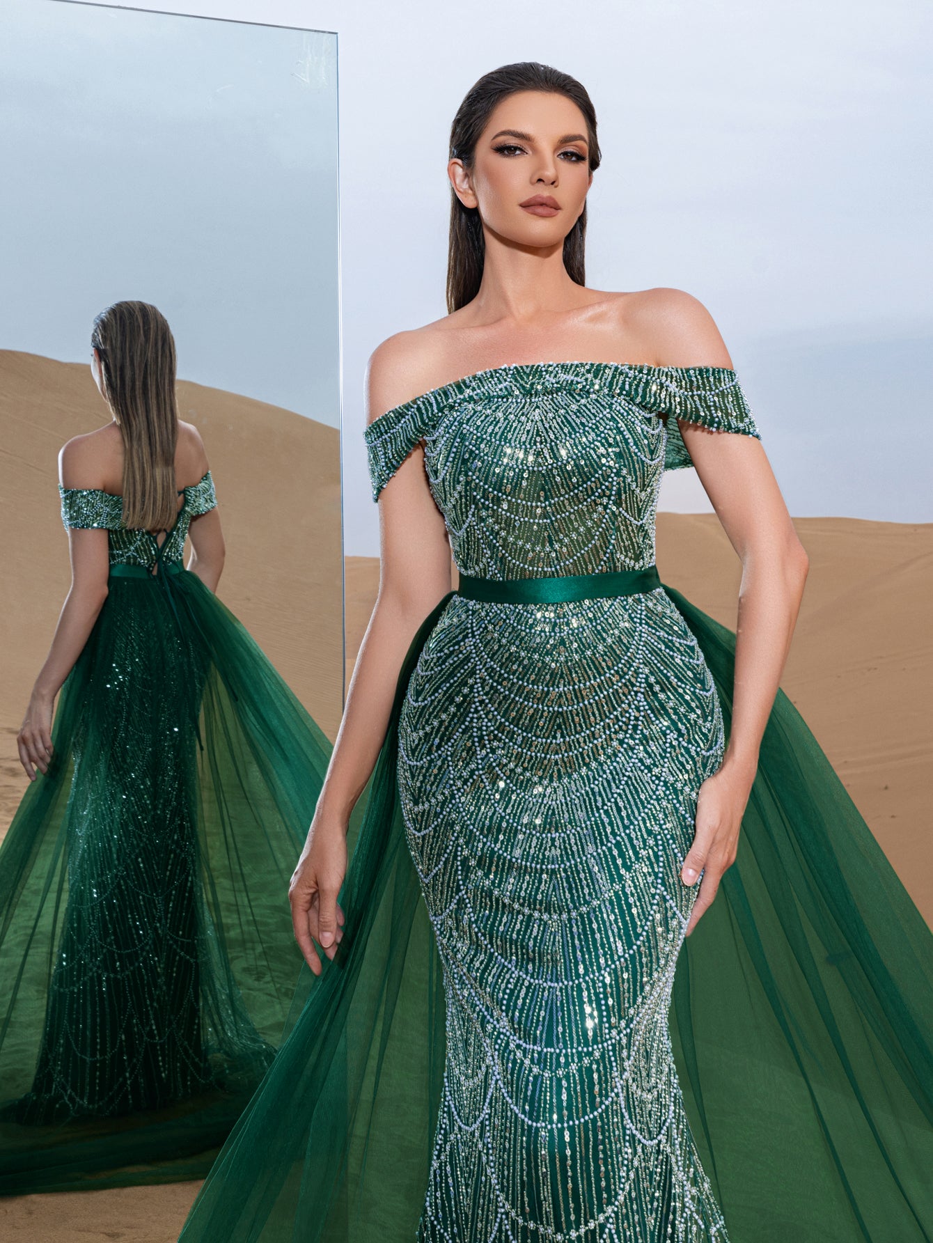 Make a majestic entrance with this stunning evening gown, adorned with luxurious beaded sequin darbic patterns. This gown sparkles with intricate details that reflect light from every angle, lending an air of sophistication and radiance. The off-shoulder neckline highlights the collarbone, while the fitted bodice and mermaid silhouette gracefully accentuate the figure. Adding a touch of ethereal charm, a soft, flowing overskirt cascades from the waist, creating a dreamlike effect as you move.