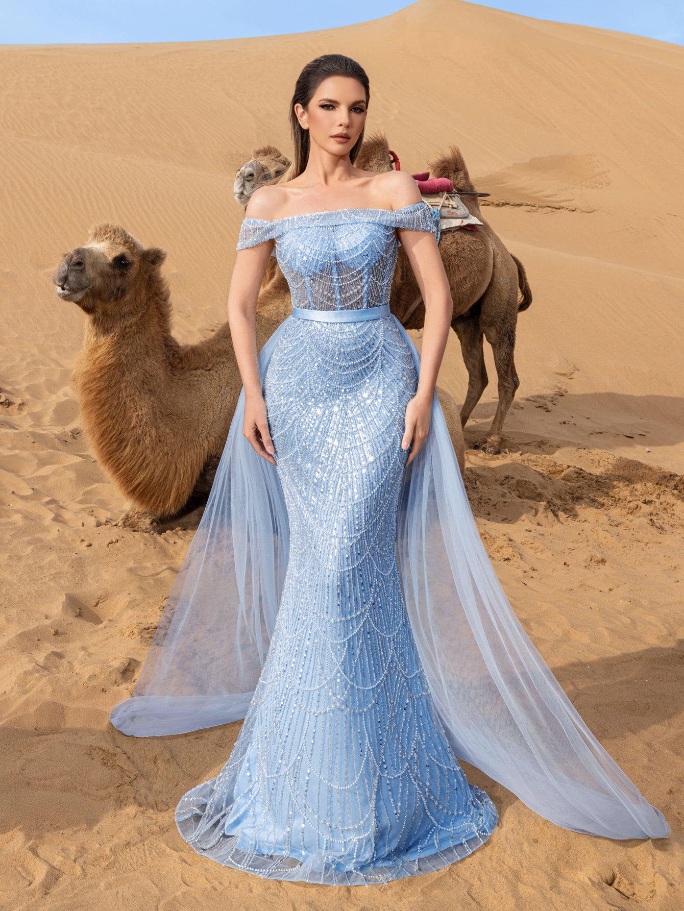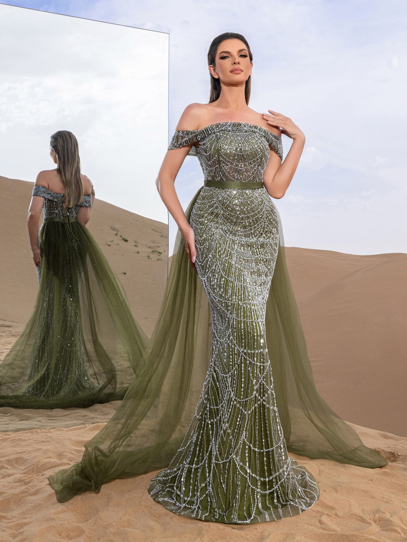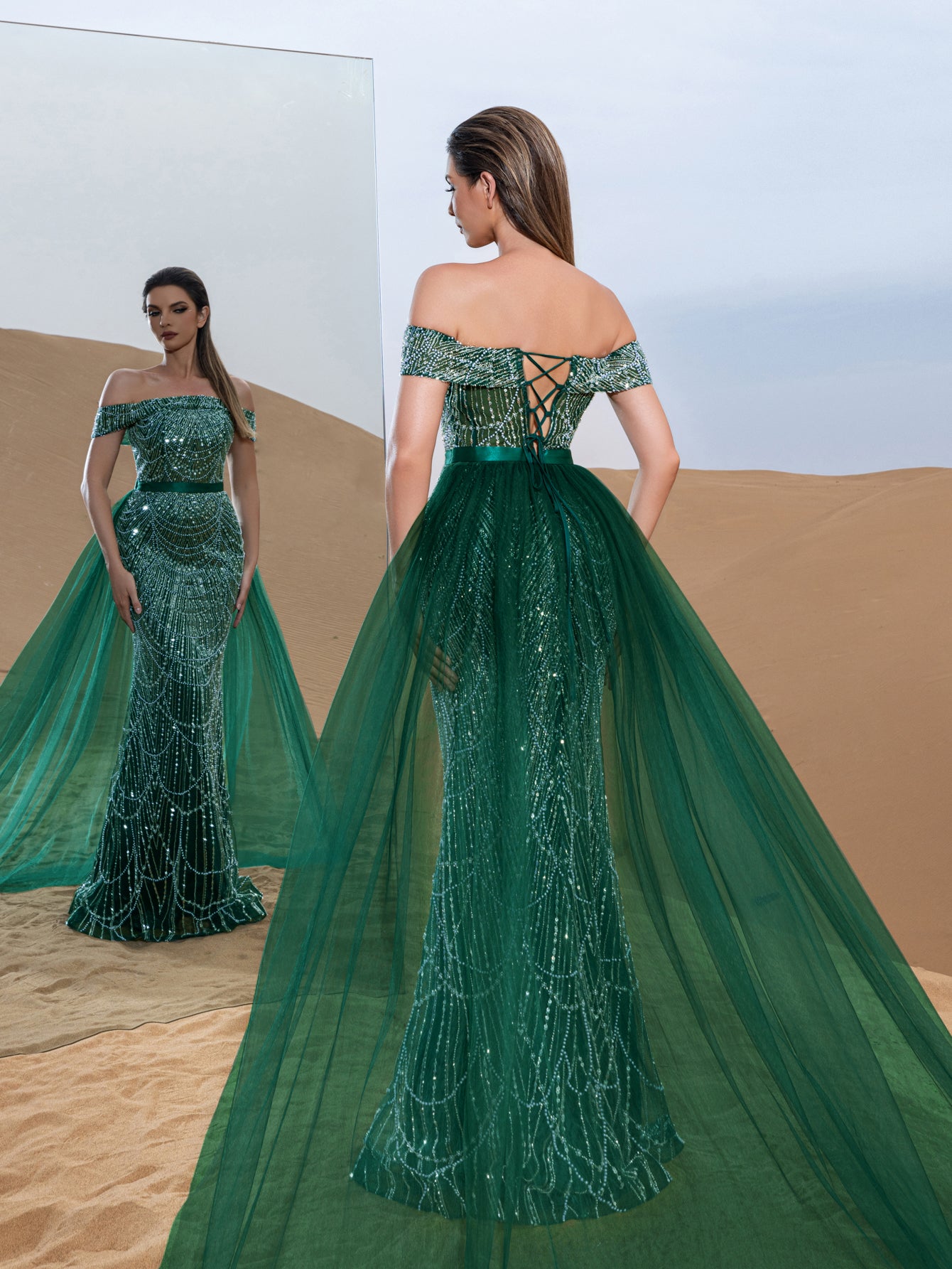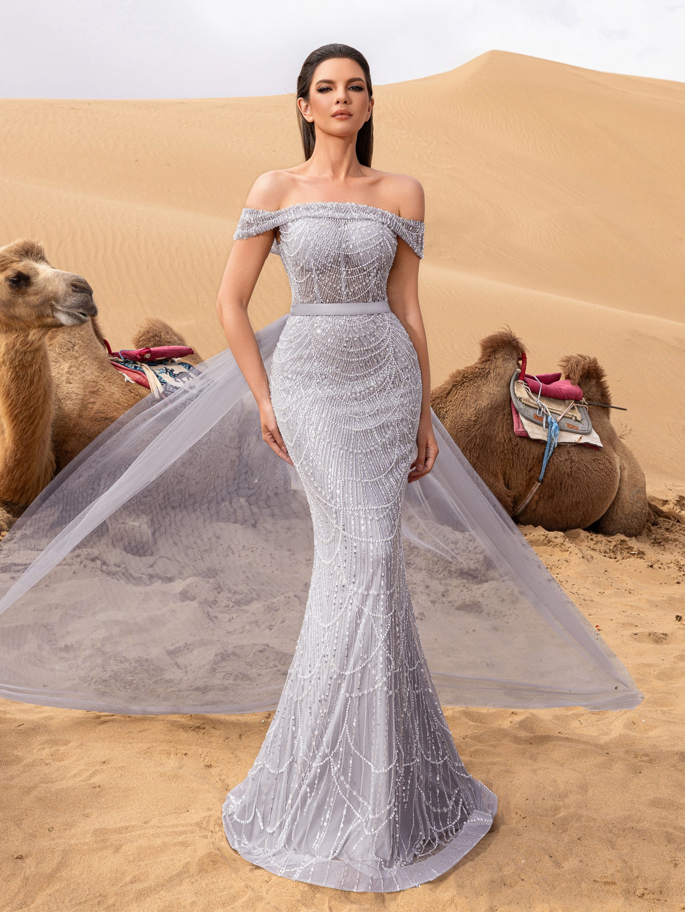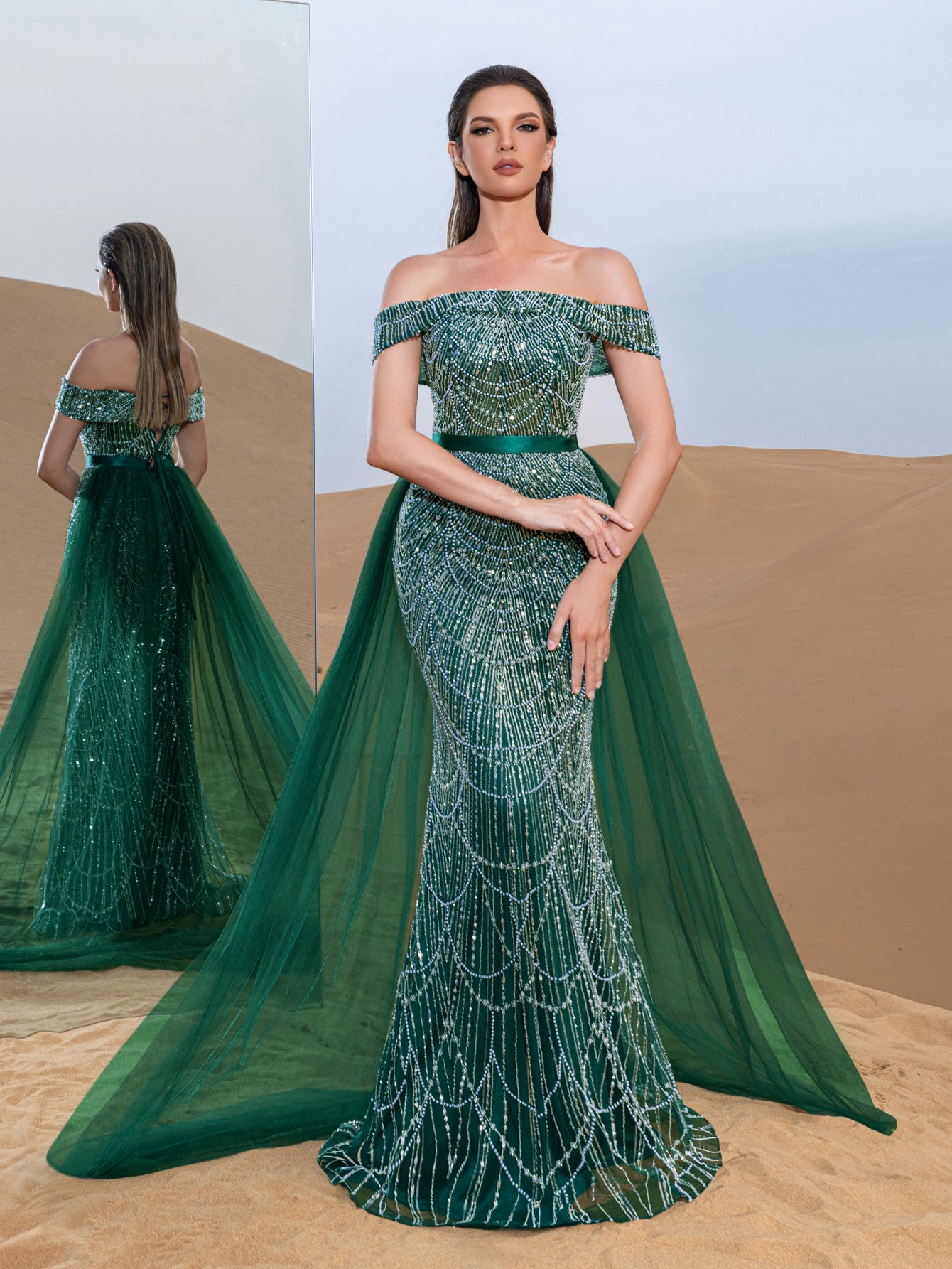 Make a majestic entrance with this stunning evening gown, adorned with luxurious beaded sequin darbic patterns. This gown sparkles with intricate details that reflect light from every angle, lending an air of sophistication and radiance. The off-shoulder neckline highlights the collarbone, while the fitted bodice and mermaid silhouette gracefully accentuate the figure. Adding a touch of ethereal charm, a soft, flowing overskirt cascades from the waist, creating a dreamlike effect as you move.