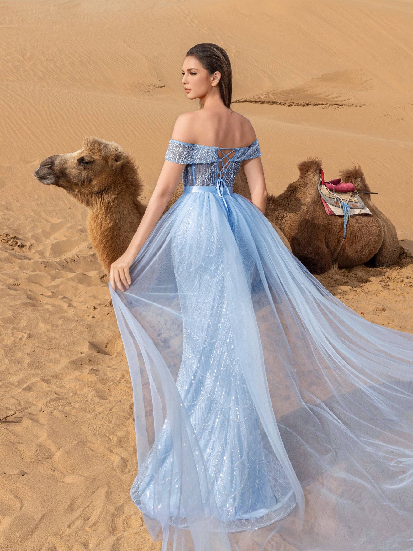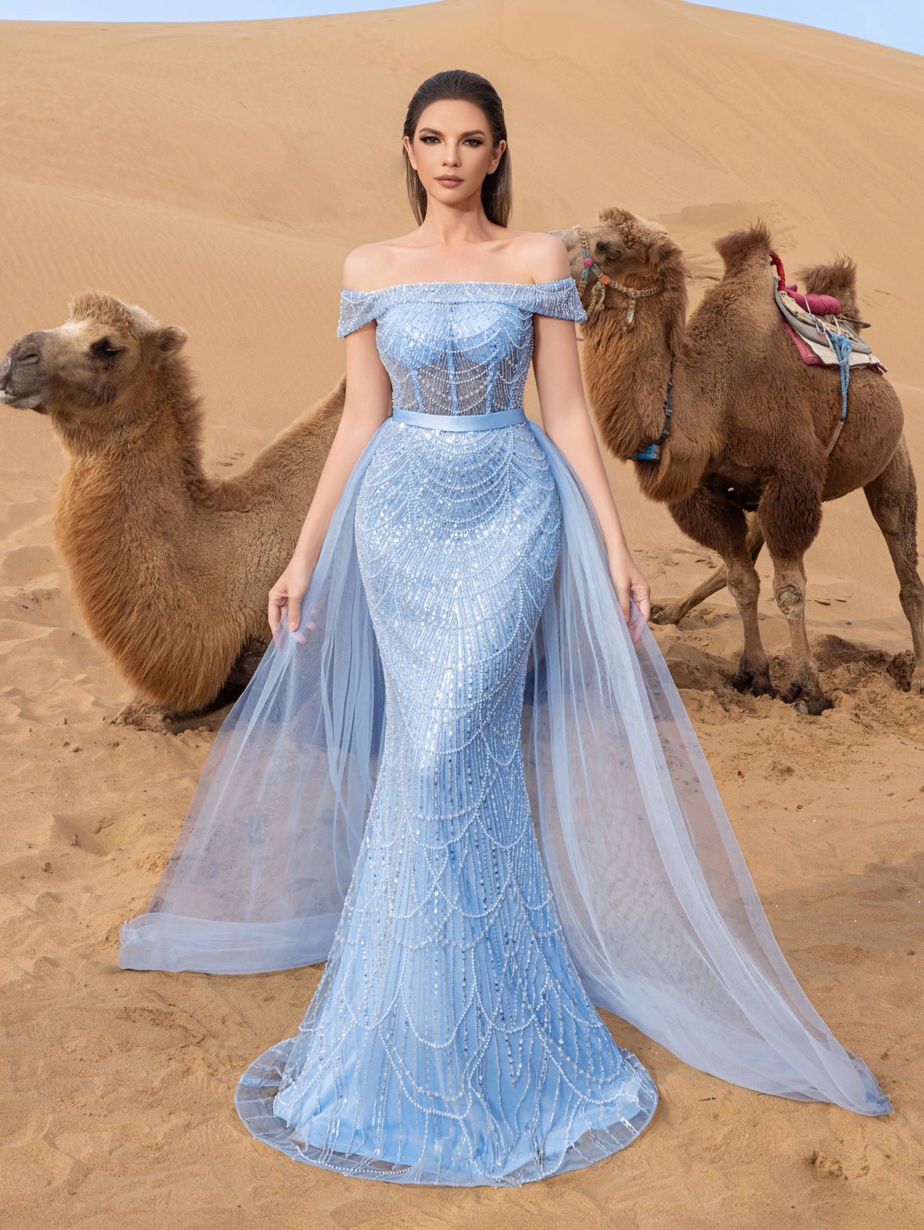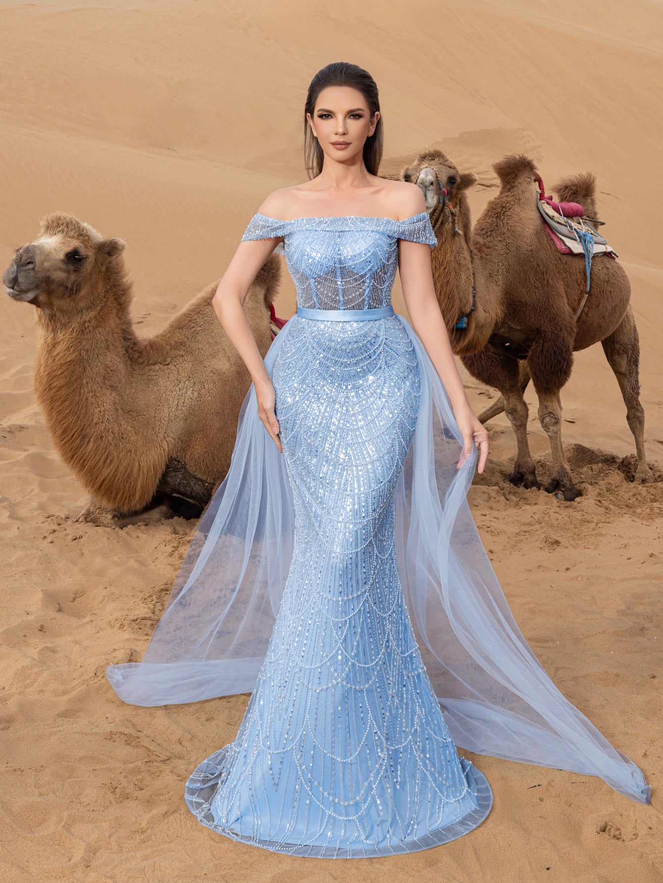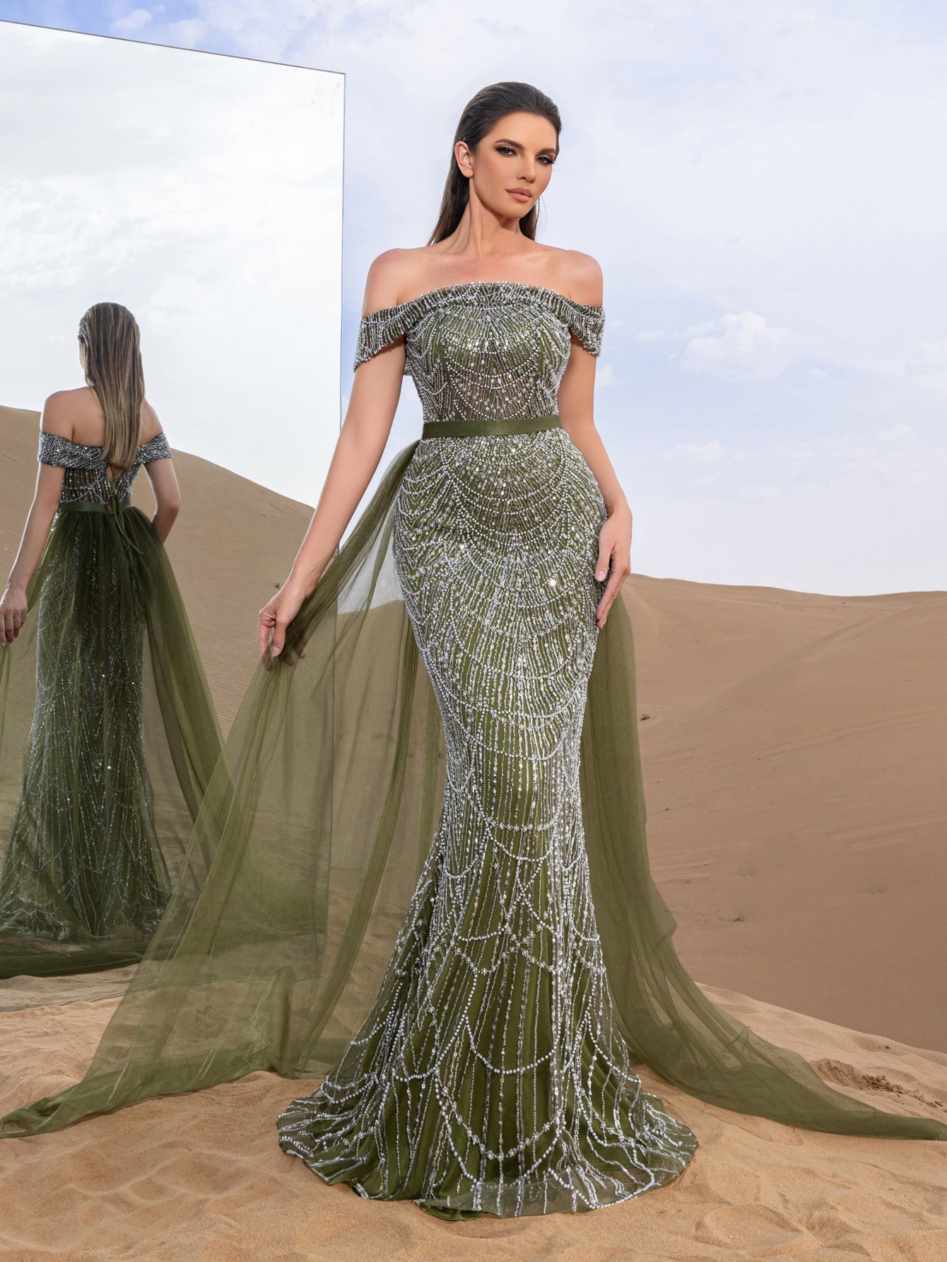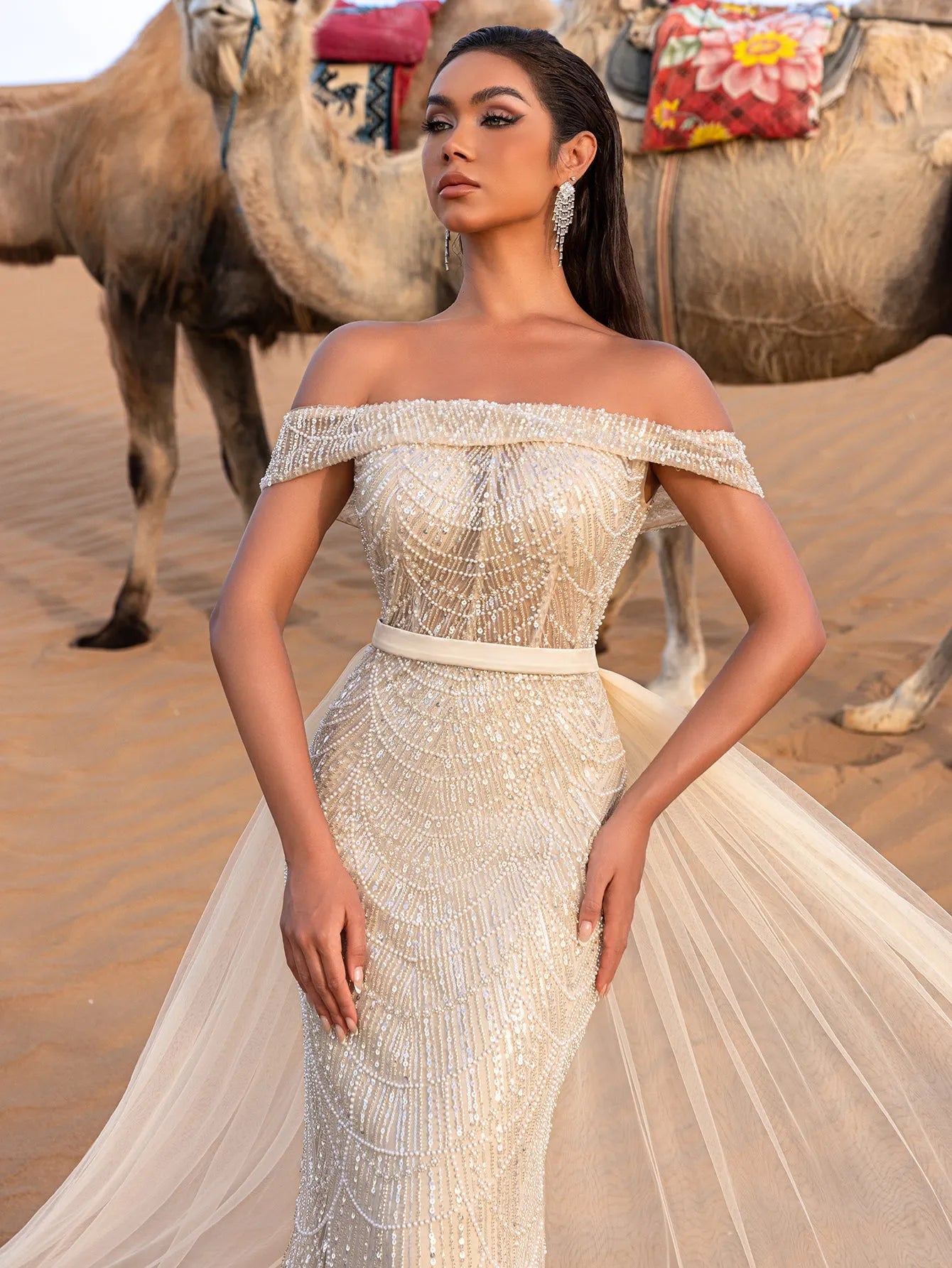 Make a majestic entrance with this stunning evening gown, adorned with luxurious beaded sequin darbic patterns. This gown sparkles with intricate details that reflect light from every angle, lending an air of sophistication and radiance. The off-shoulder neckline highlights the collarbone, while the fitted bodice and mermaid silhouette gracefully accentuate the figure. Adding a touch of ethereal charm, a soft, flowing overskirt cascades from the waist, creating a dreamlike effect as you move.